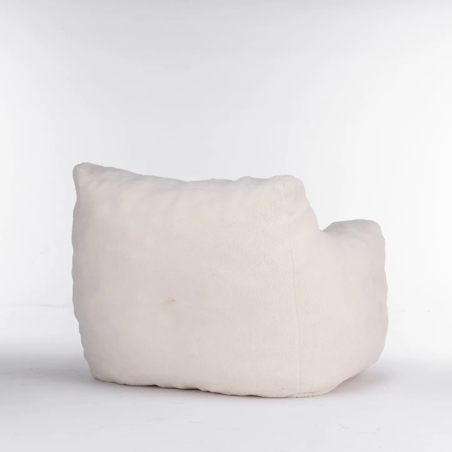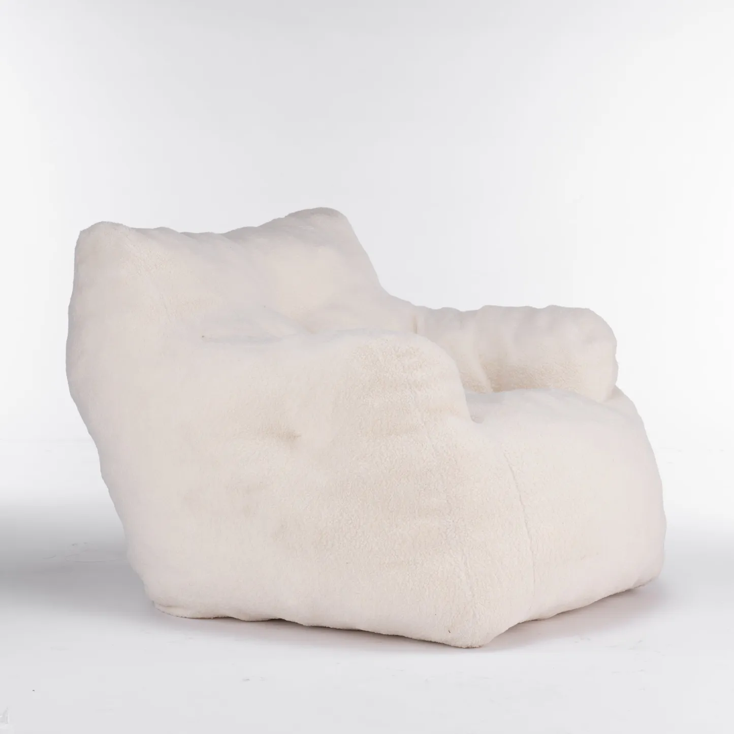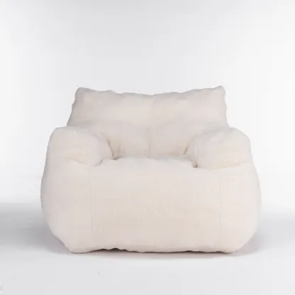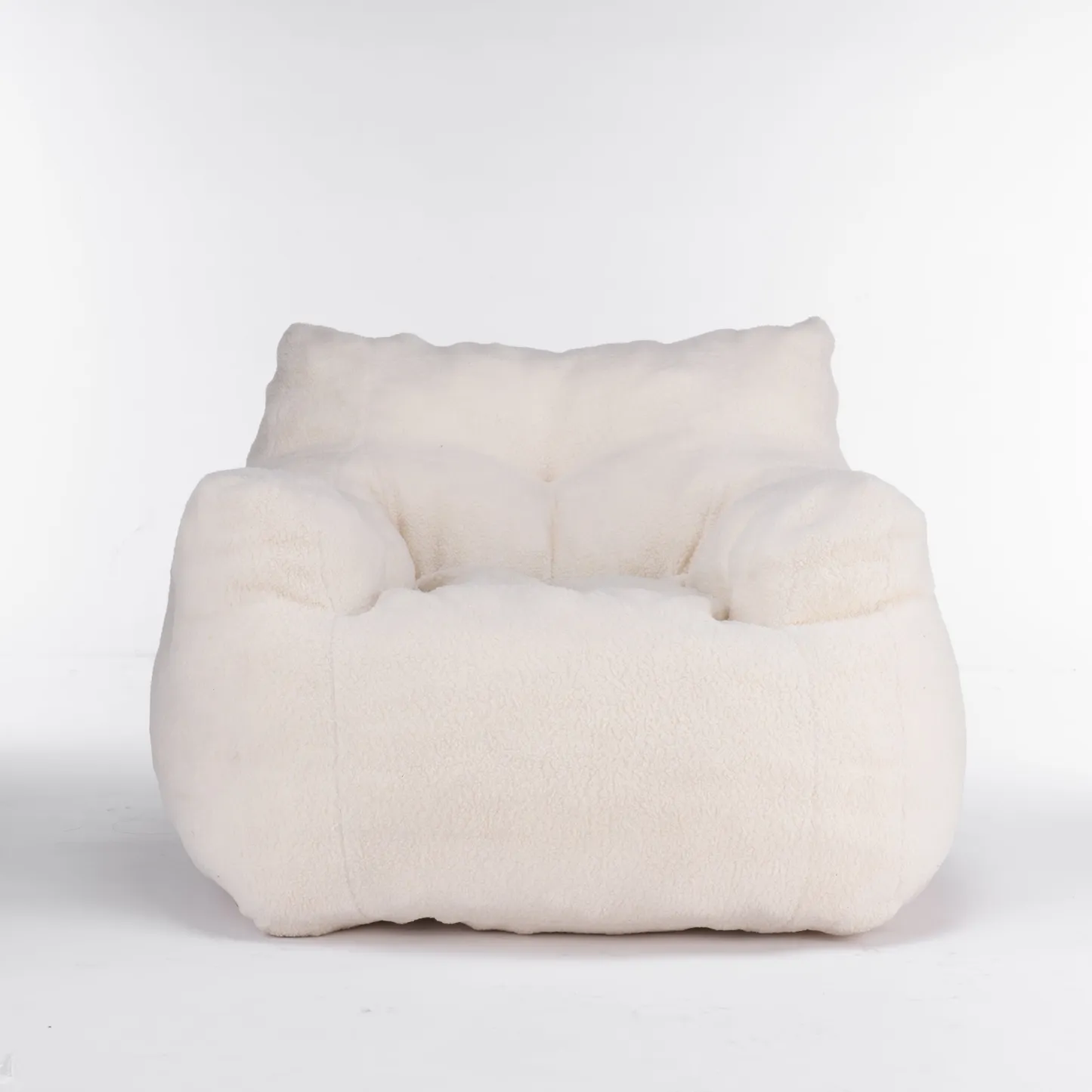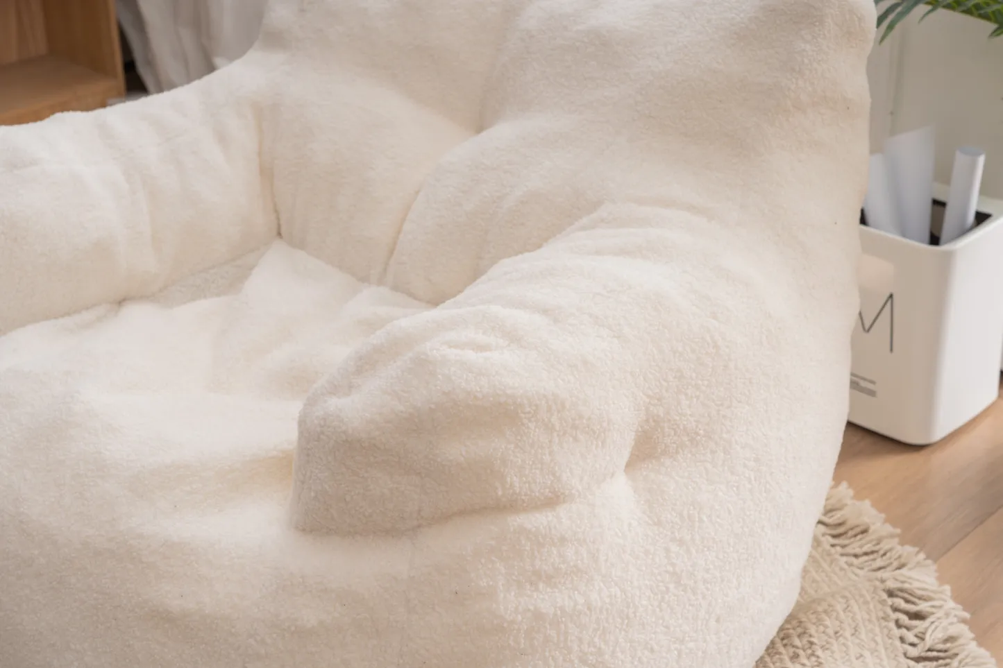 Soft foam-filled bean bag chair with plush teddy fabric and ergonomic tufted design. Perfect for cozy lounging in any modern space.