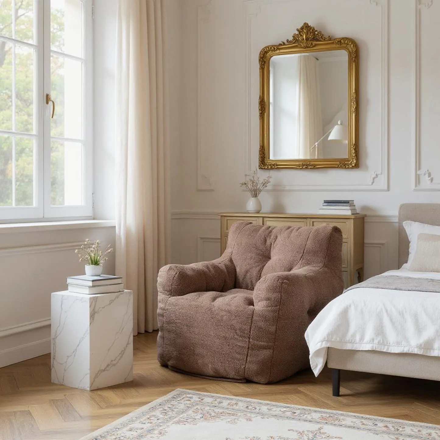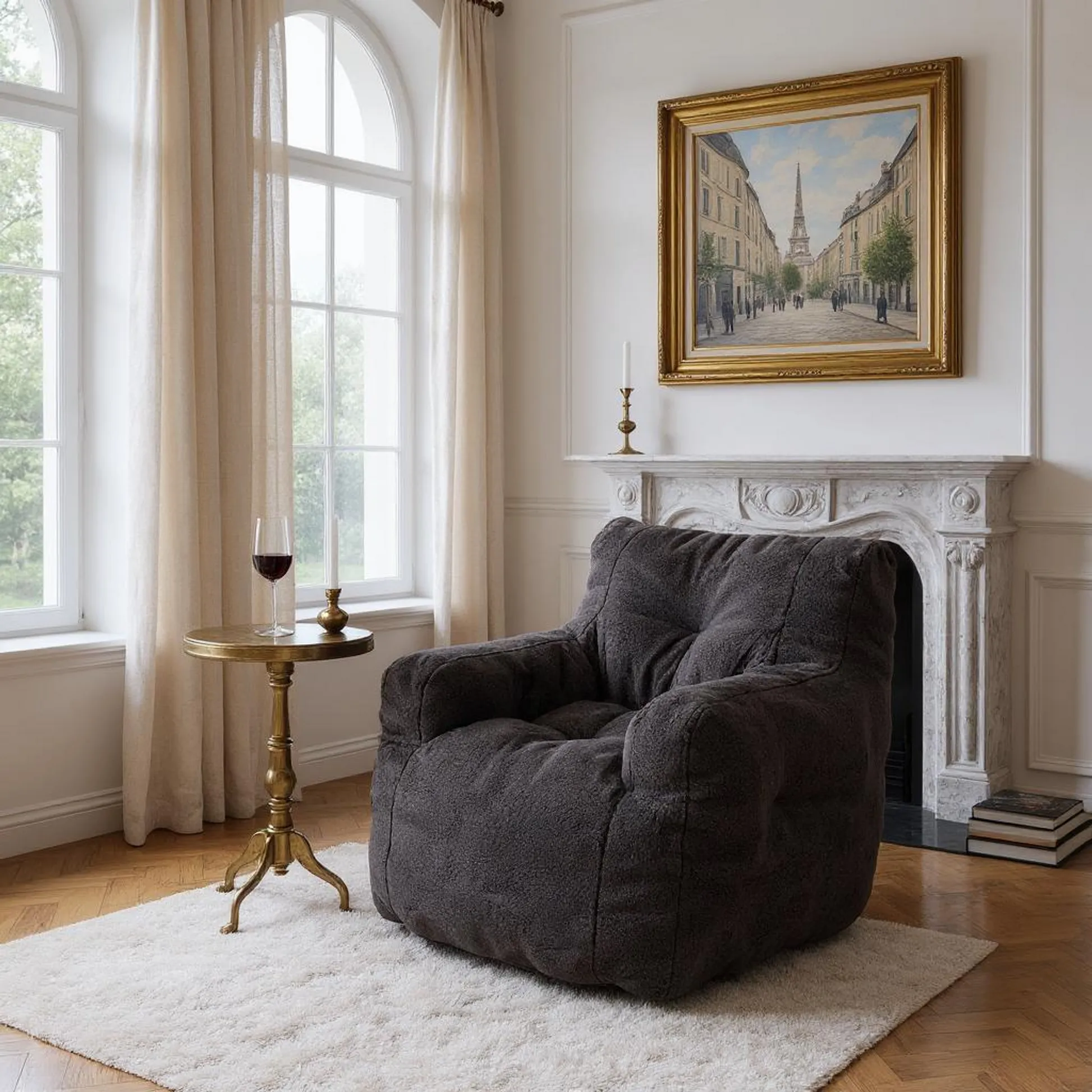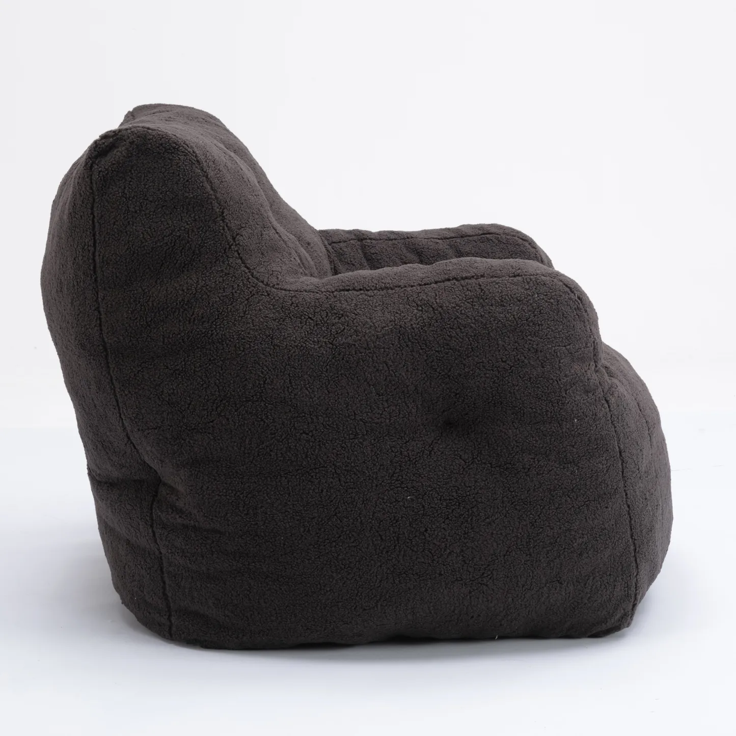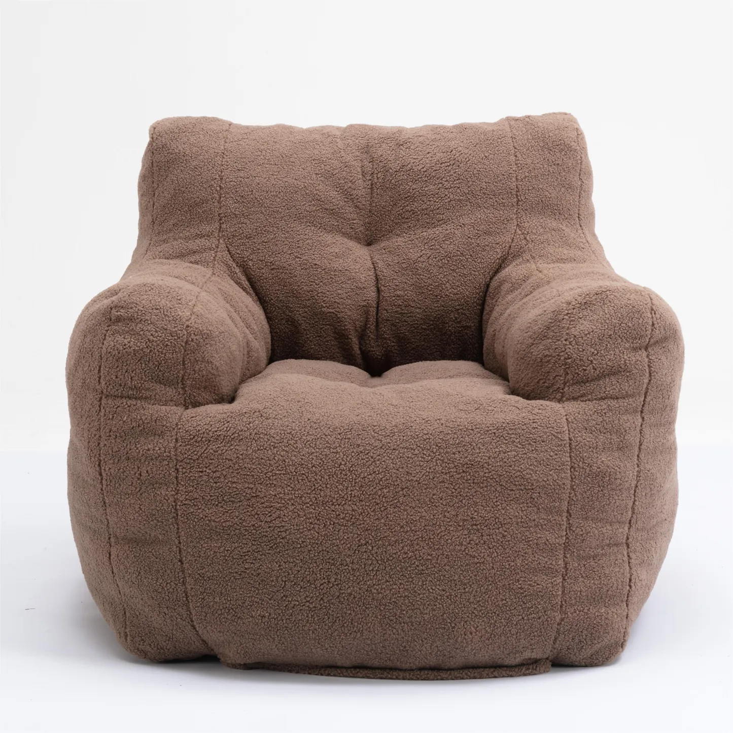 Soft foam-filled bean bag chair with plush teddy fabric and ergonomic tufted design. Perfect for cozy lounging in any modern space.