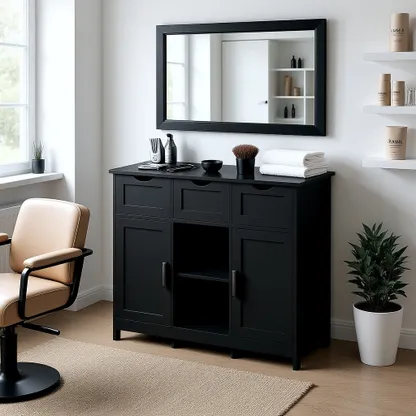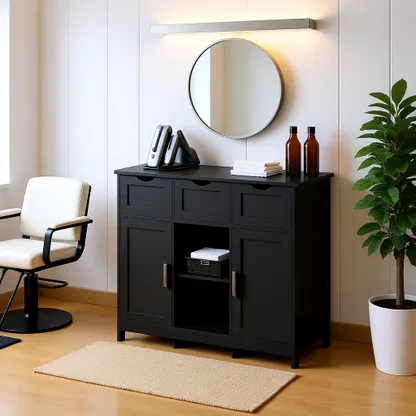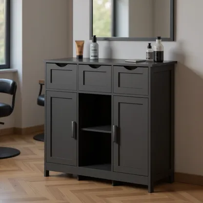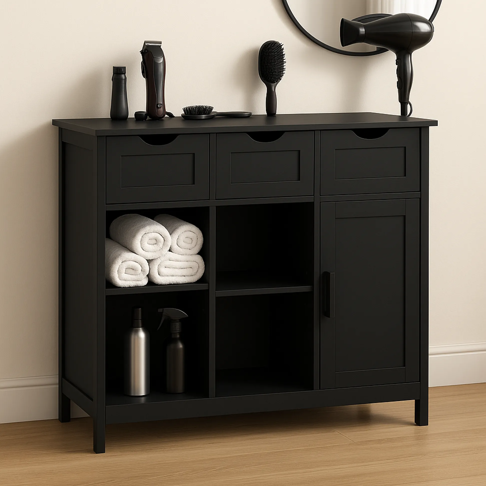 Modern storage cabinet with 3 drawers, 2 doors, and 3 adjustable shelves. Durable particle board construction, perfect for living room, bedroom, or bathroom organization.
