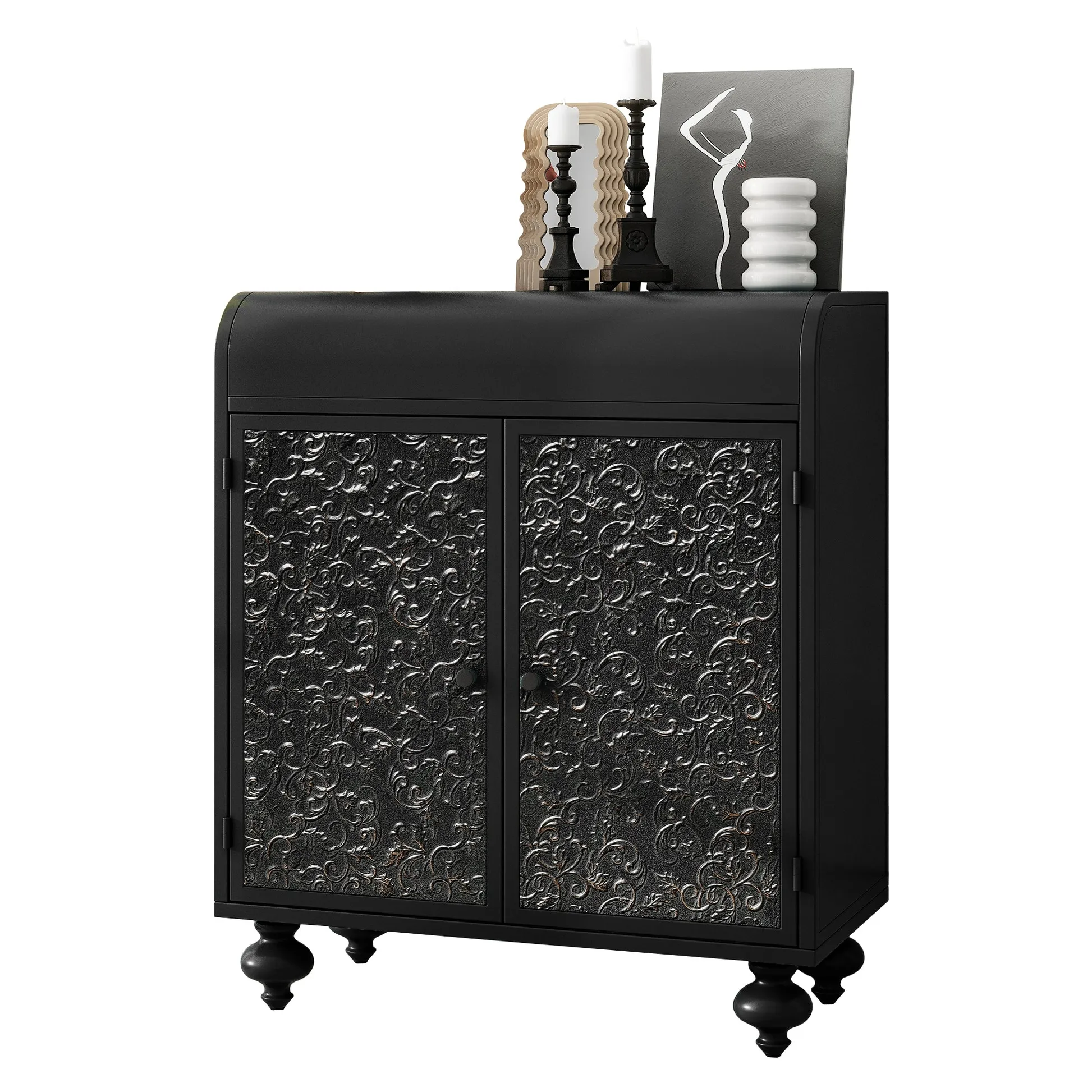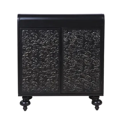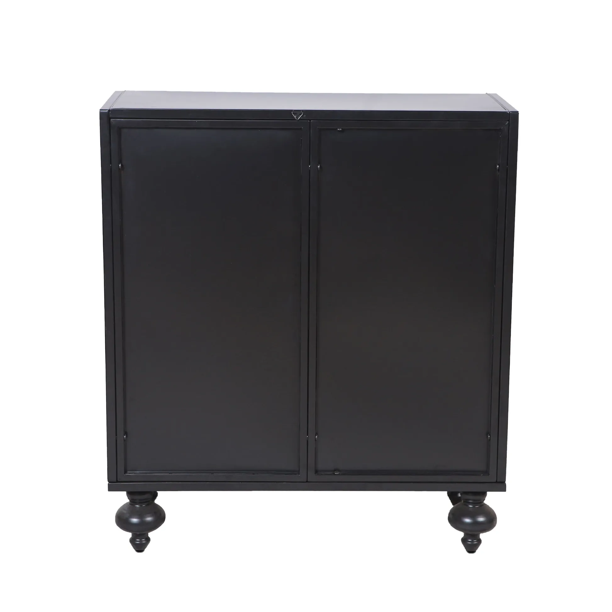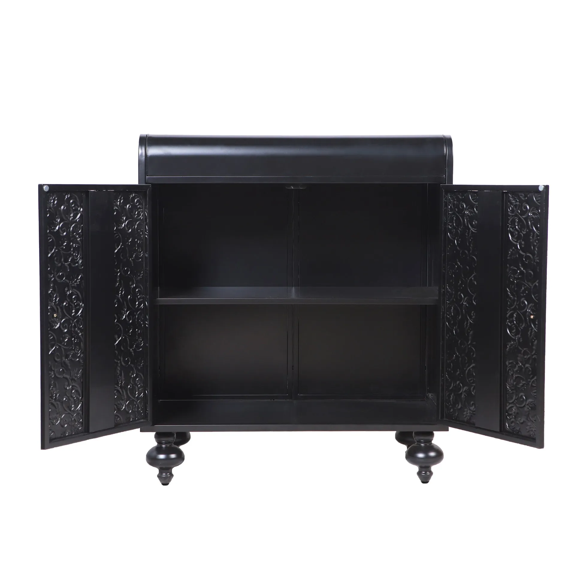 Antique-black steel accent cabinet with embossed double doors, bun feet and a roomy shelf. A compact sideboard for entry, living or dining storage.