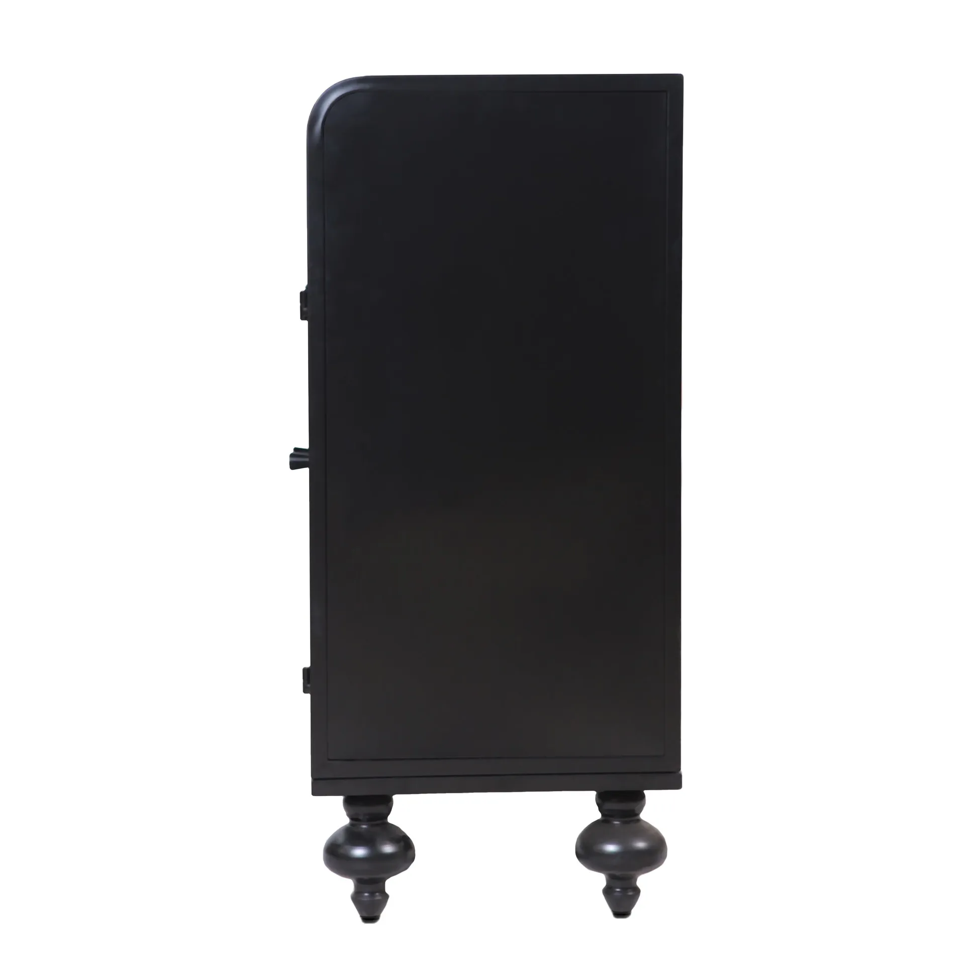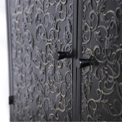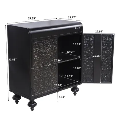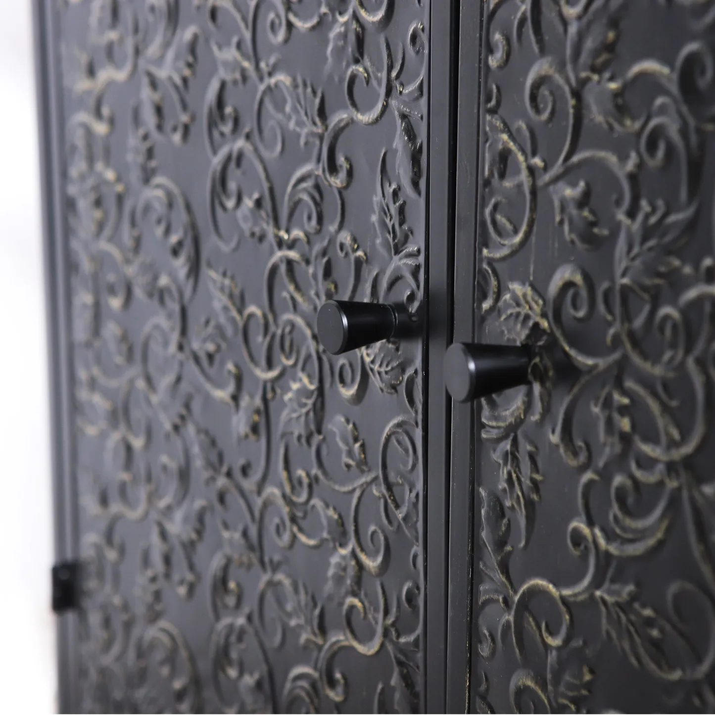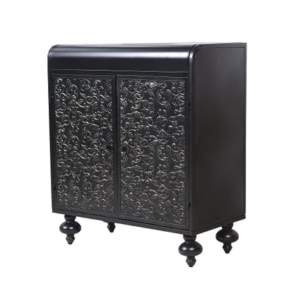 Antique-black steel accent cabinet with embossed double doors, bun feet and a roomy shelf. A compact sideboard for entry, living or dining storage.
