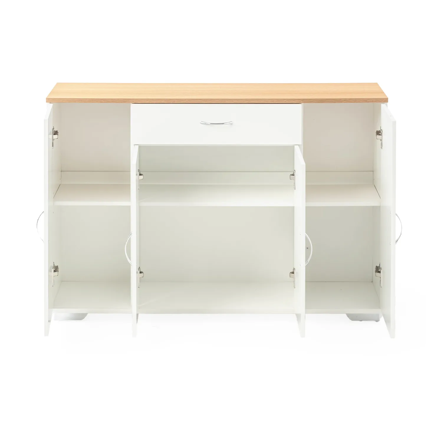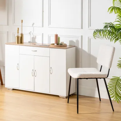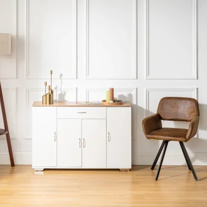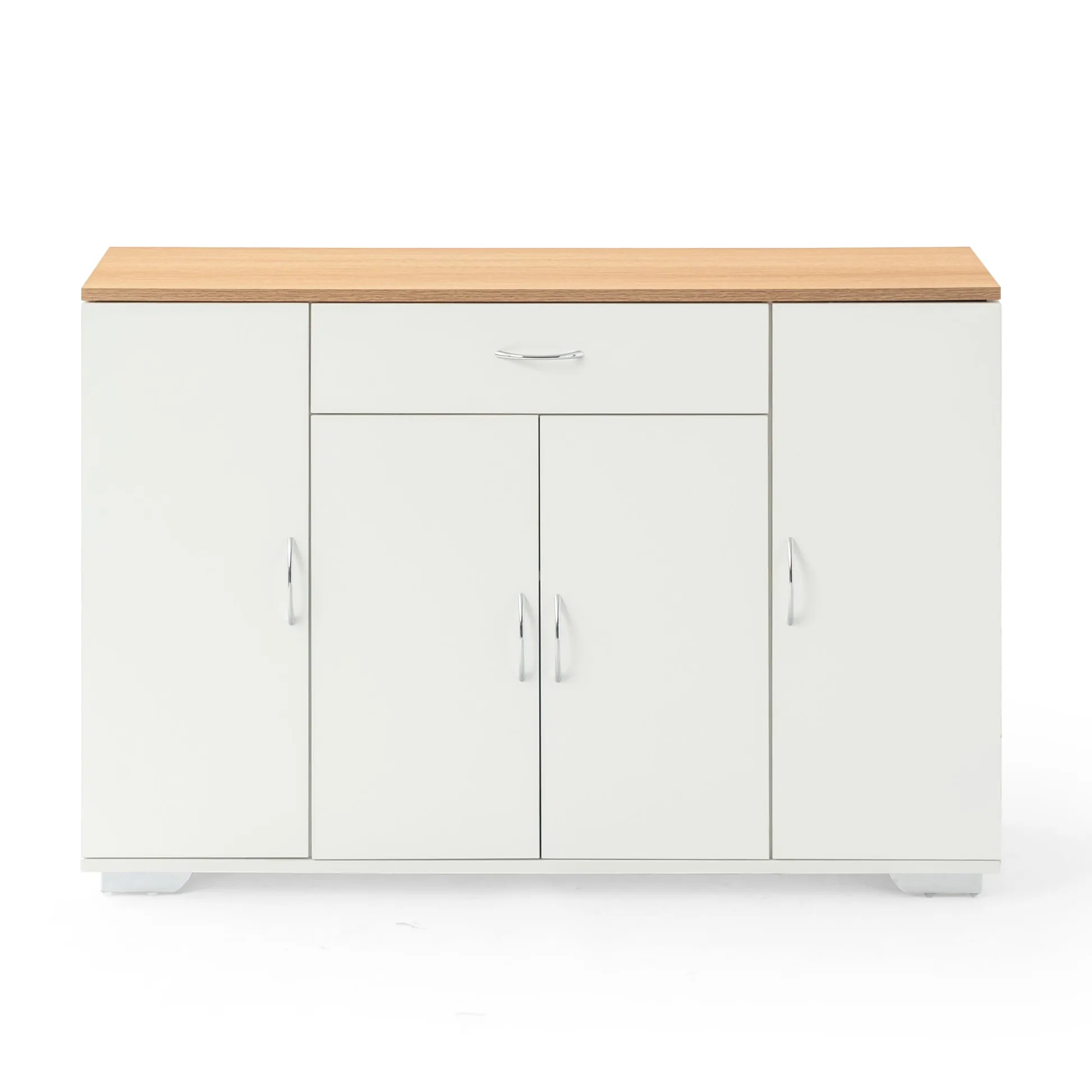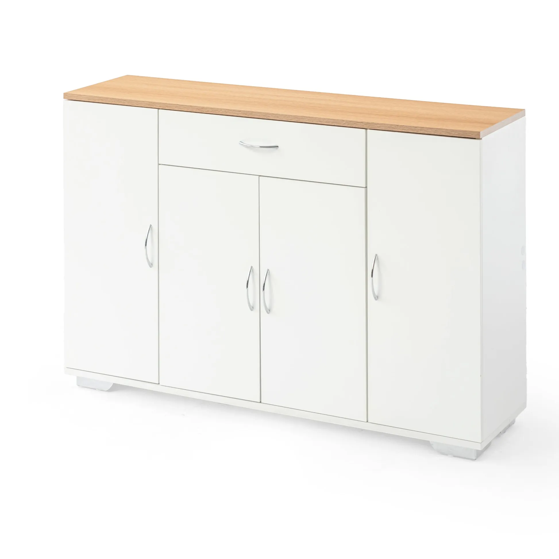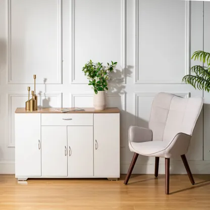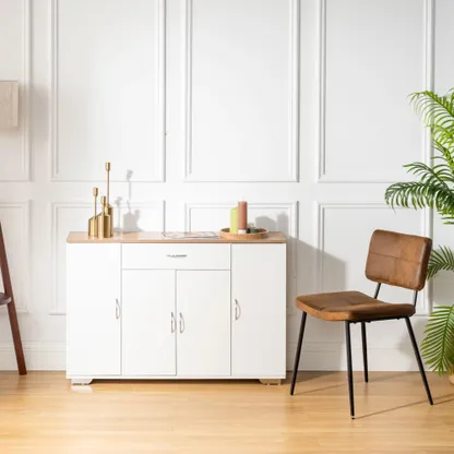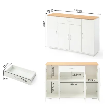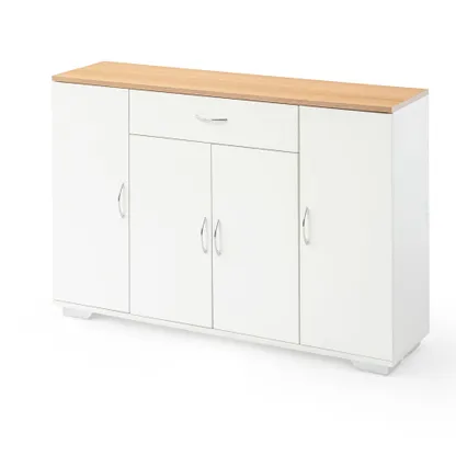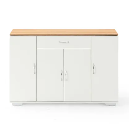 White sideboard with oak look top, one drawer and four doors. Organizes dinnerware and linens for dining room or entry and keeps daily clutter hidden and off the floor.