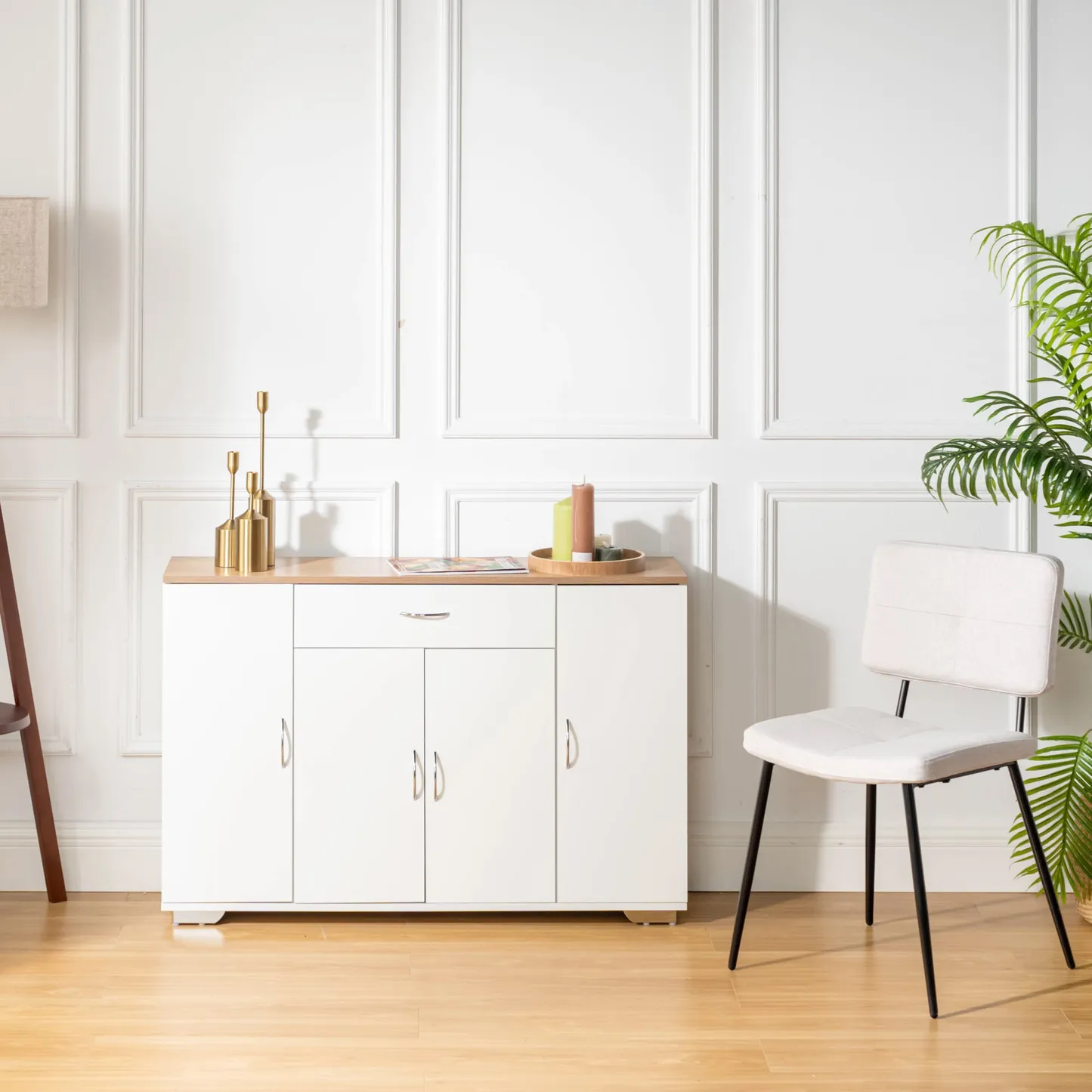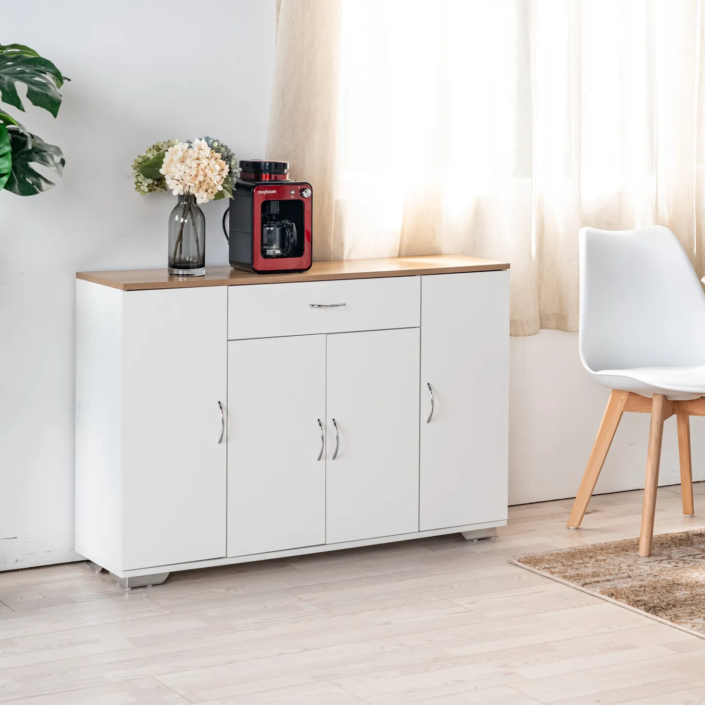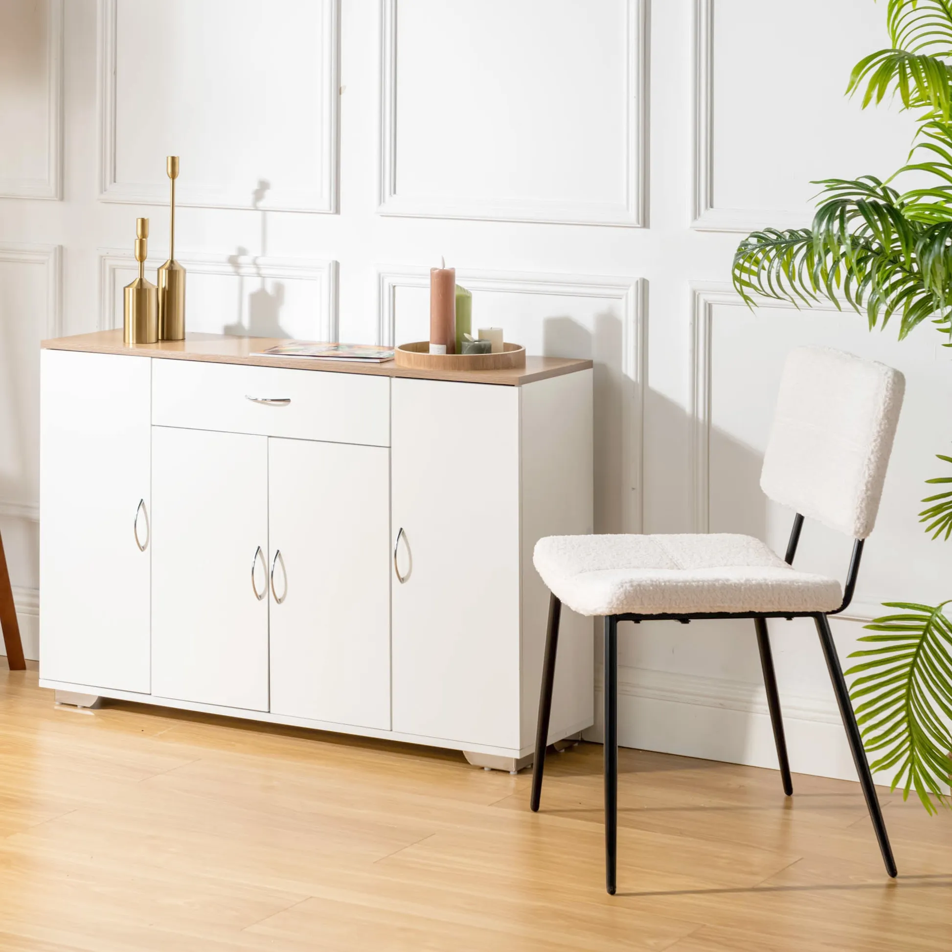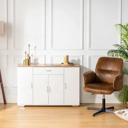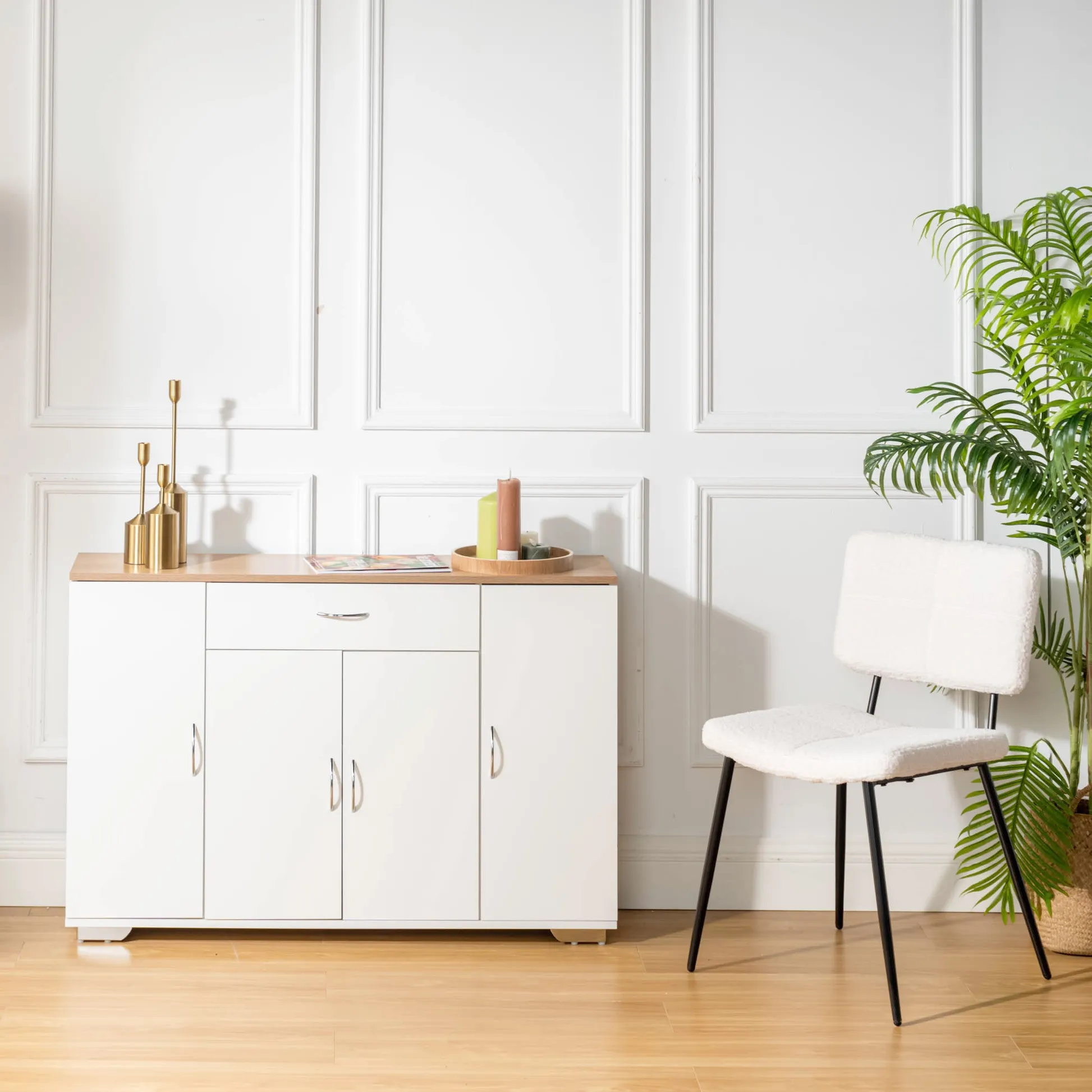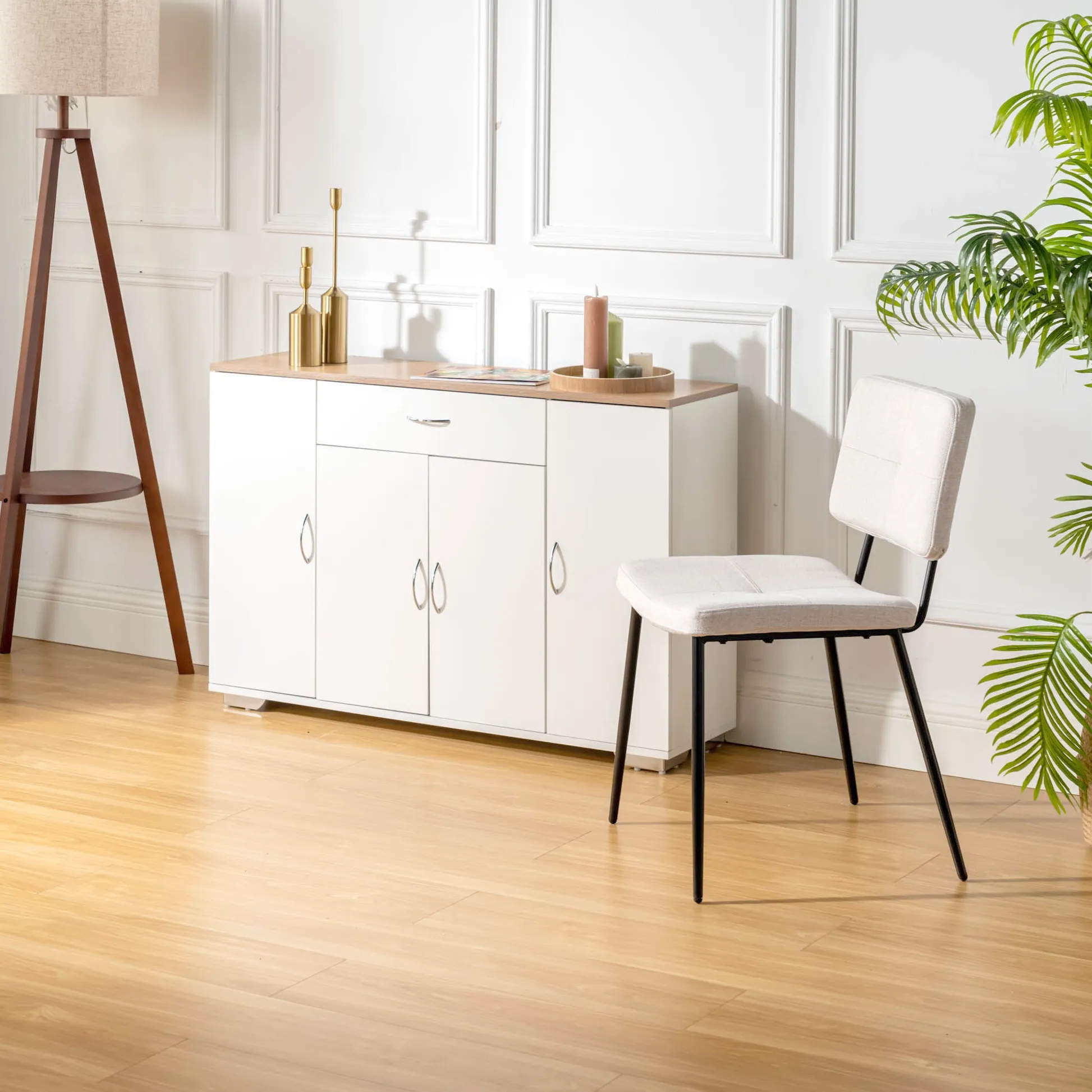 White sideboard with oak look top, one drawer and four doors. Organizes dinnerware and linens for dining room or entry and keeps daily clutter hidden and off the floor.