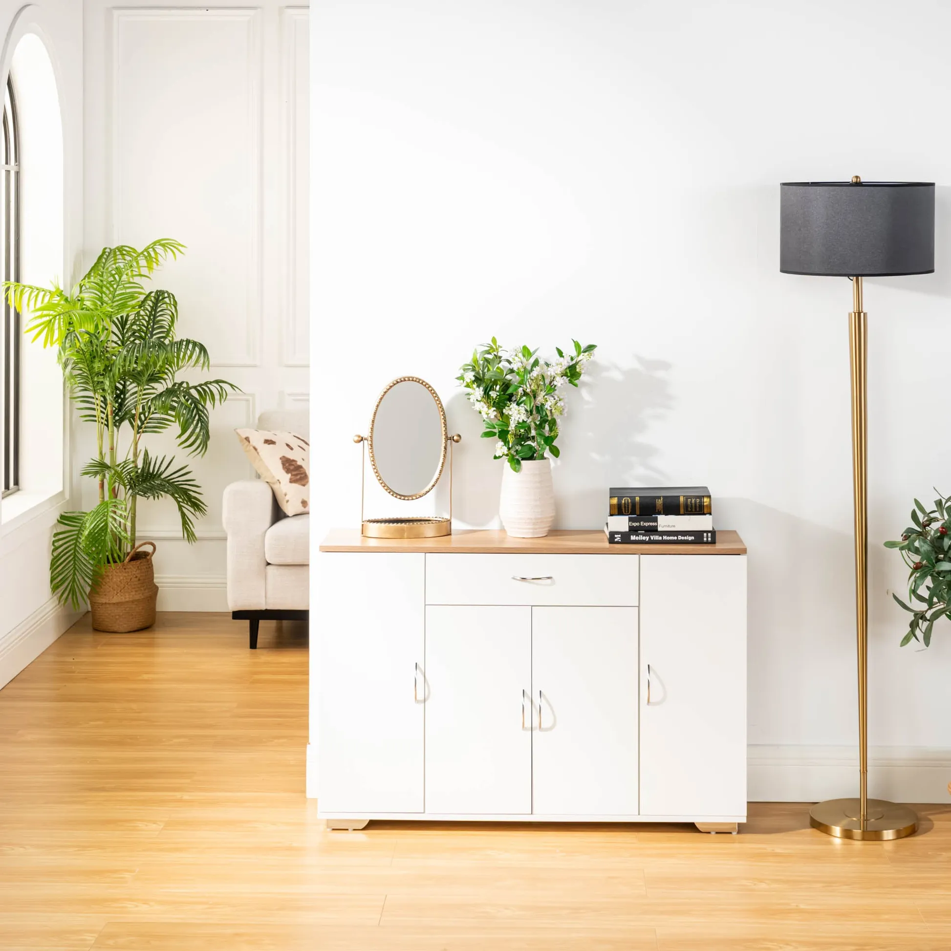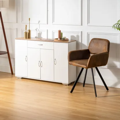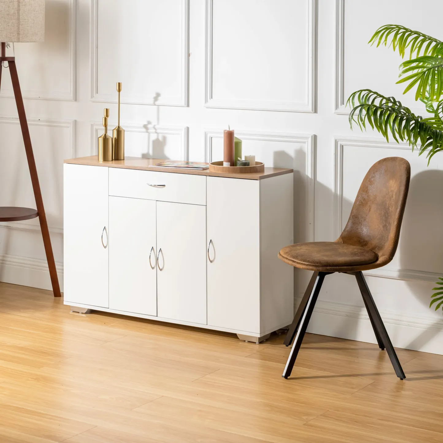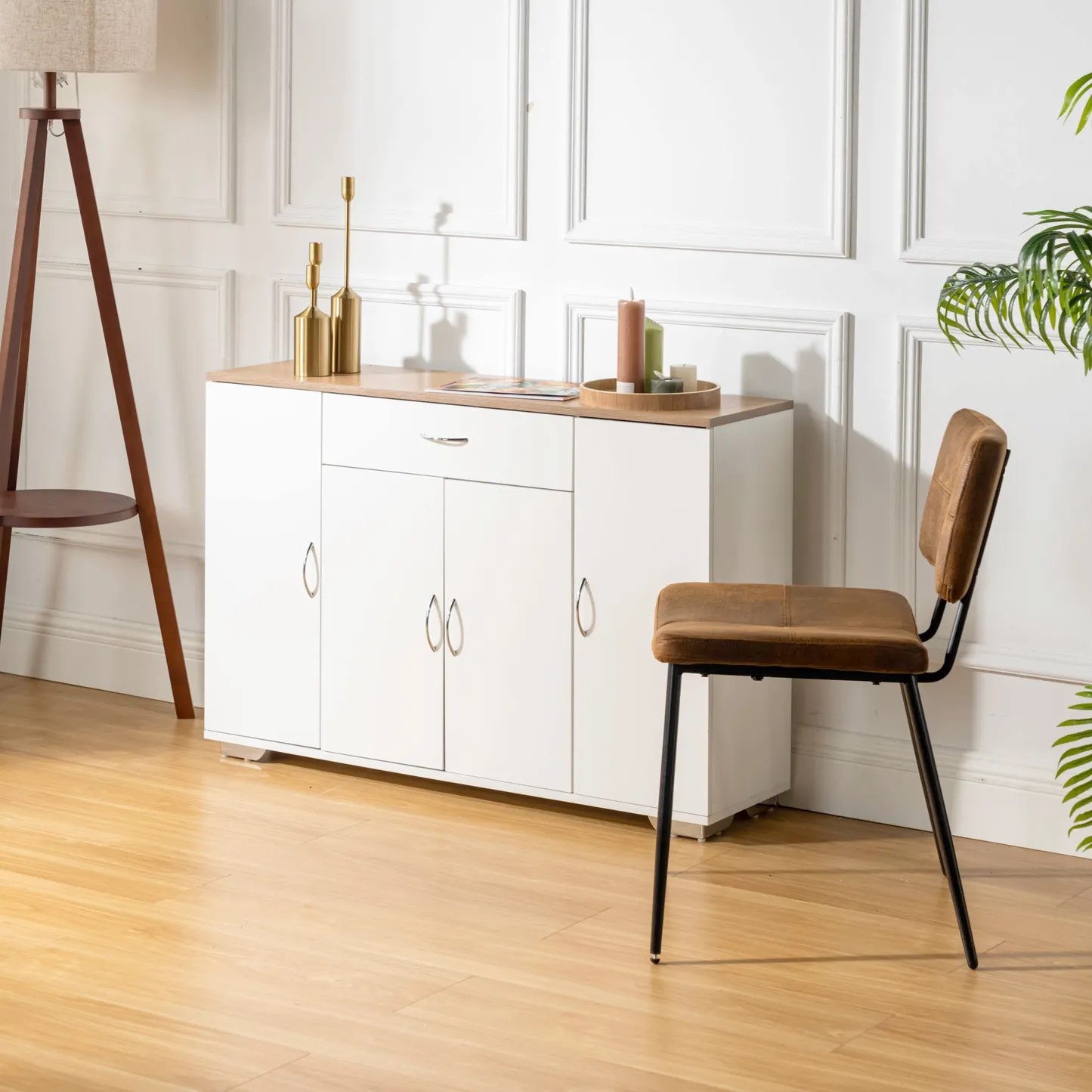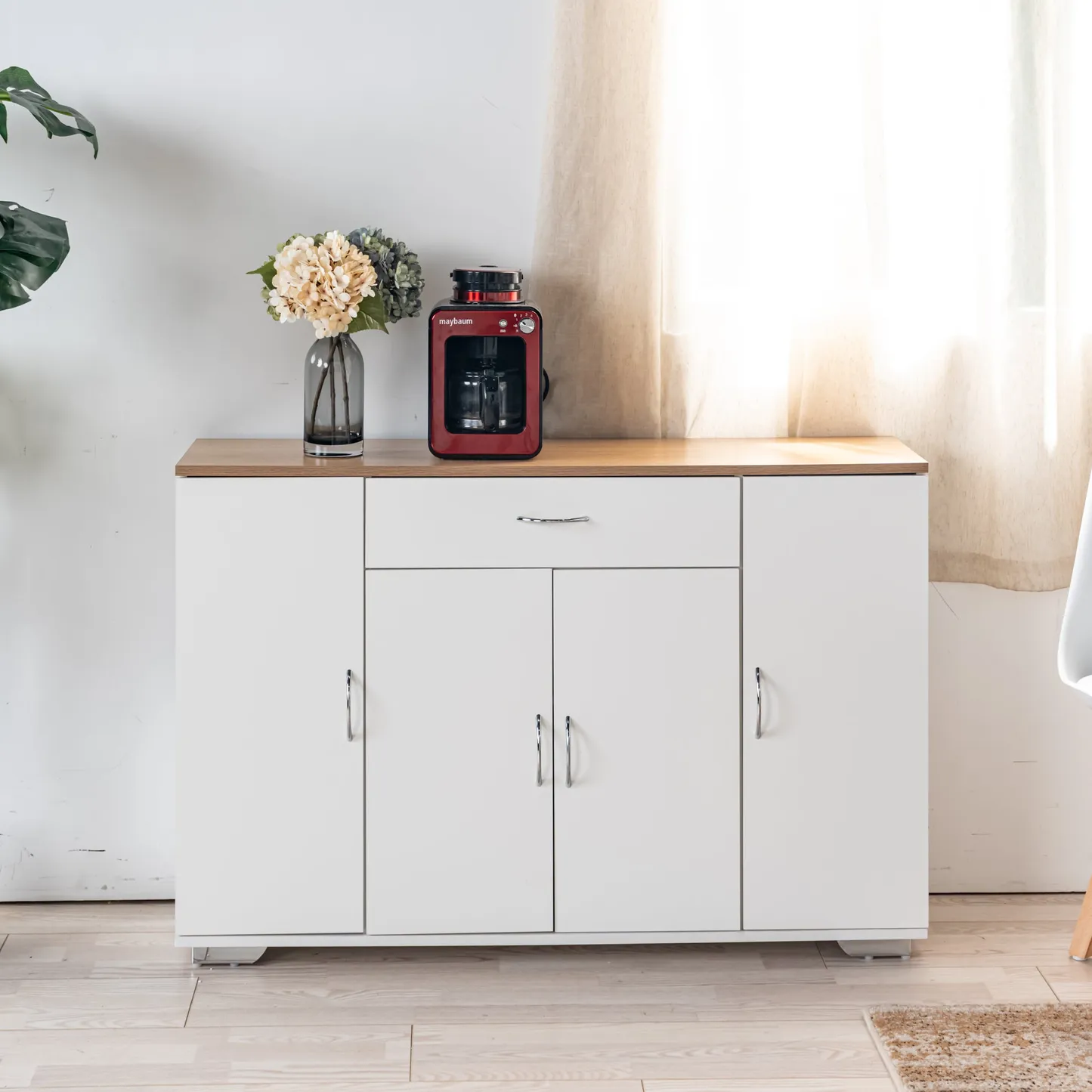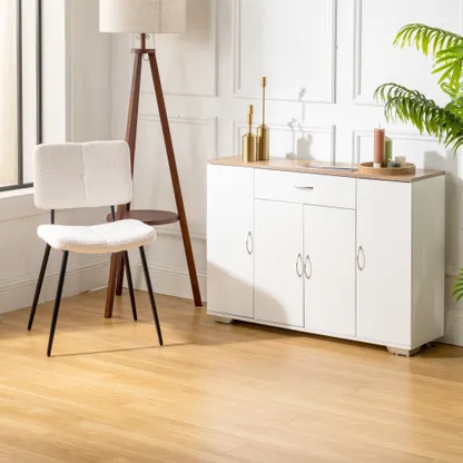 White sideboard with oak look top, one drawer and four doors. Organizes dinnerware and linens for dining room or entry and keeps daily clutter hidden and off the floor.