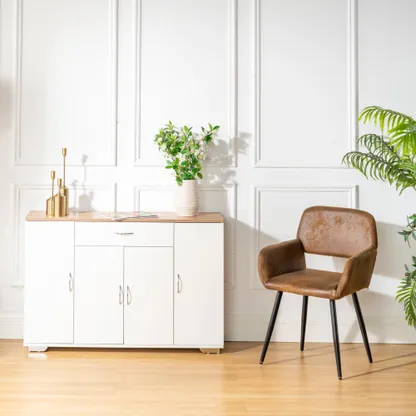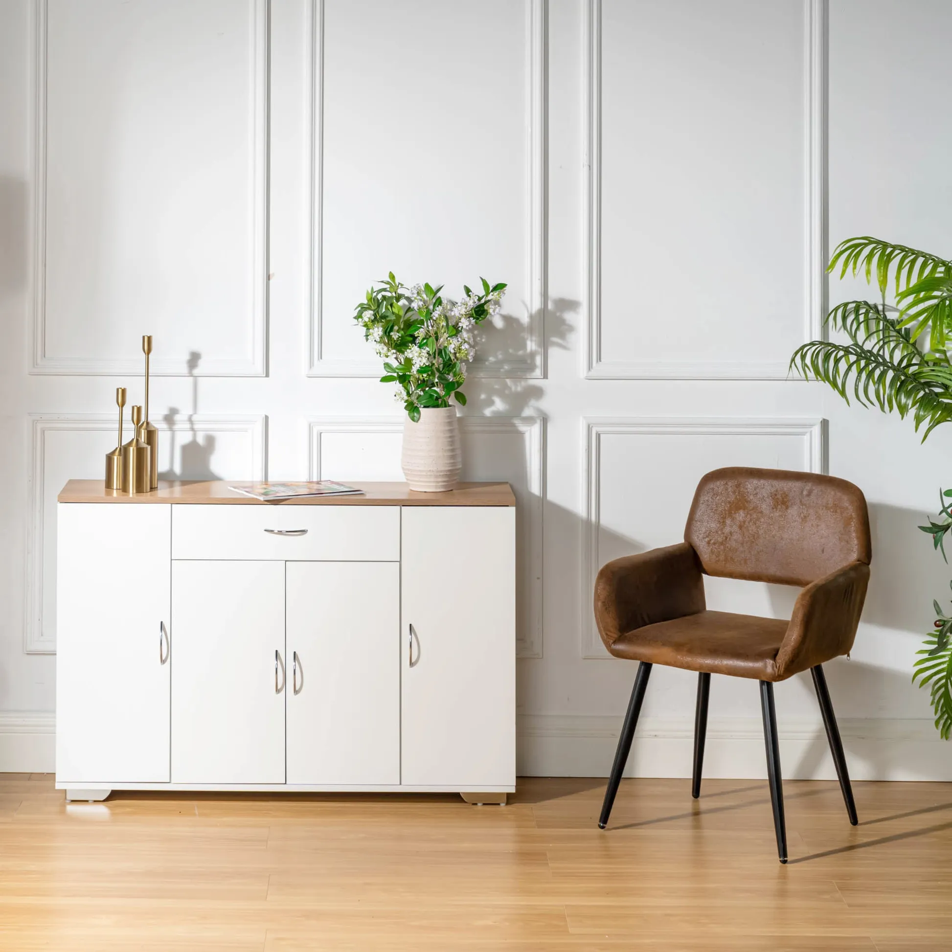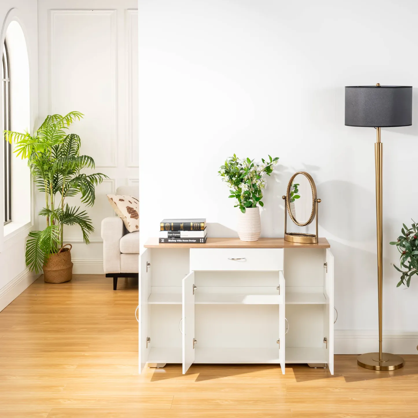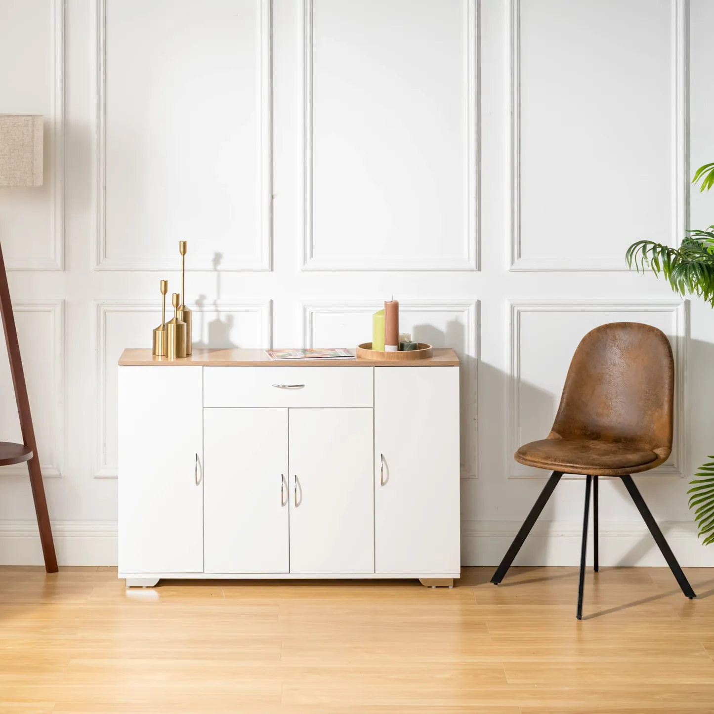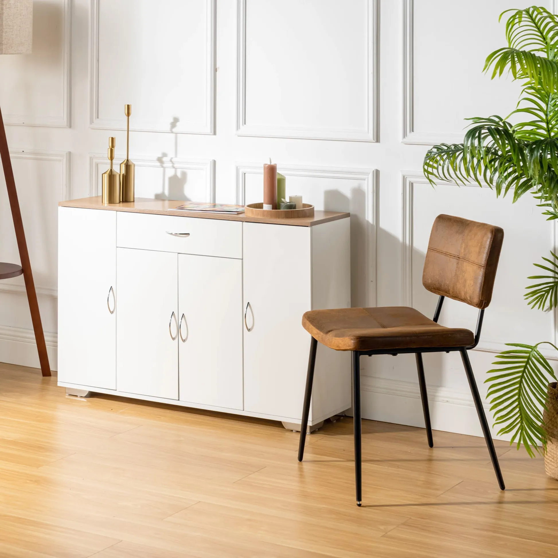 White sideboard with oak look top, one drawer and four doors. Organizes dinnerware and linens for dining room or entry and keeps daily clutter hidden and off the floor.