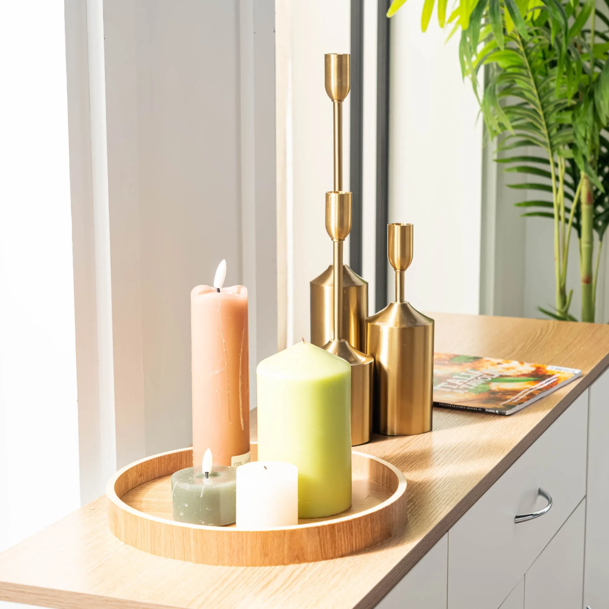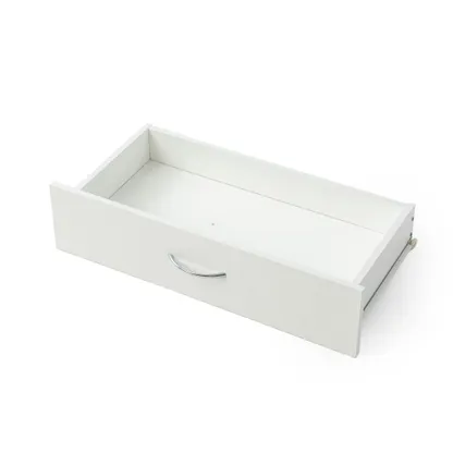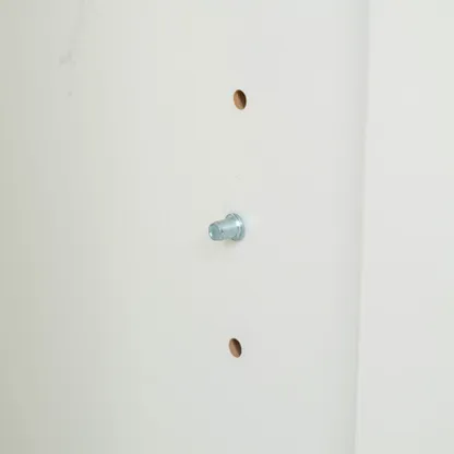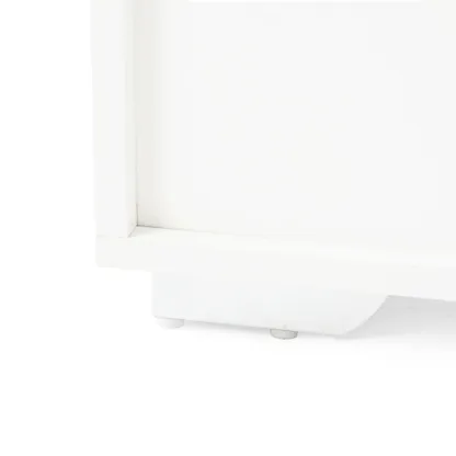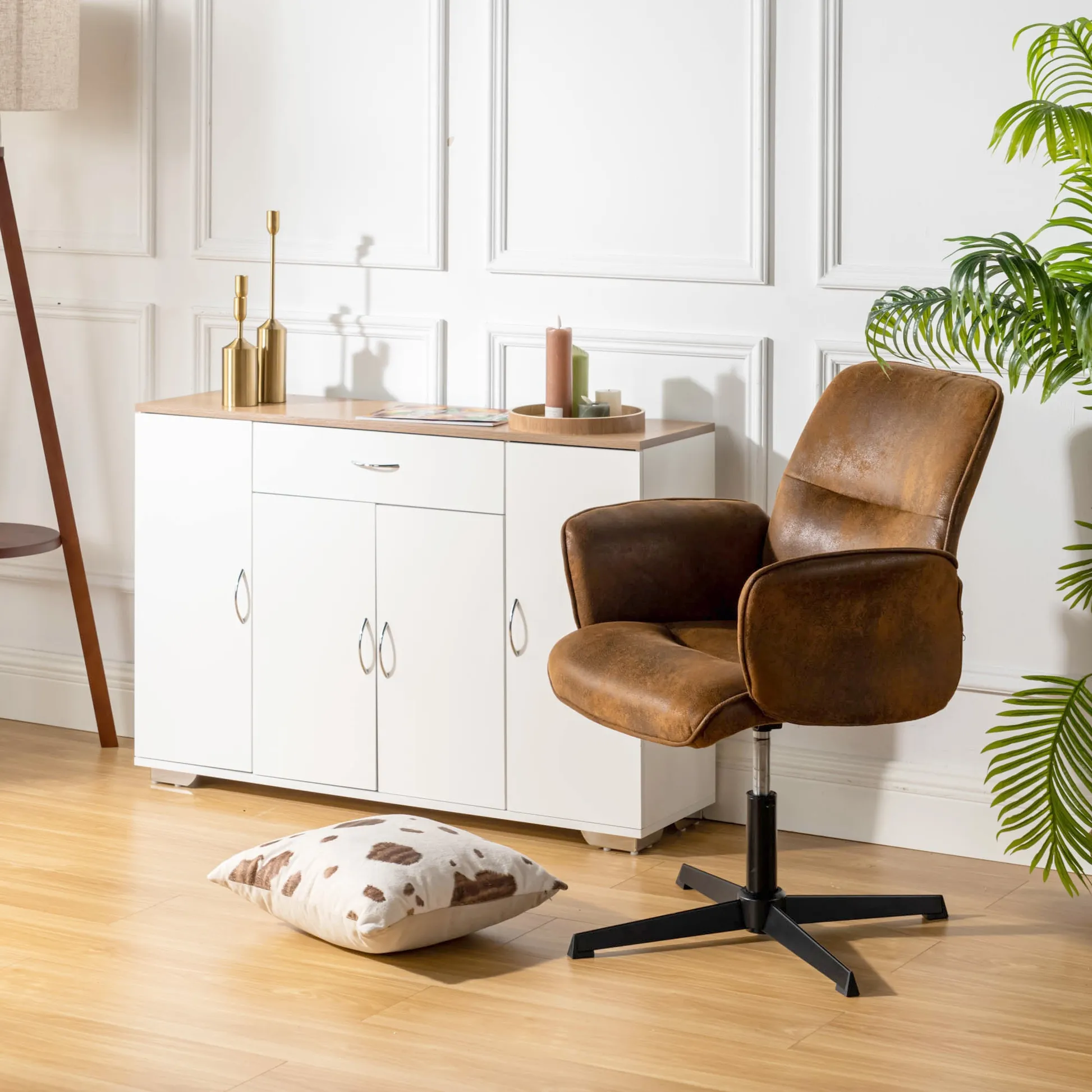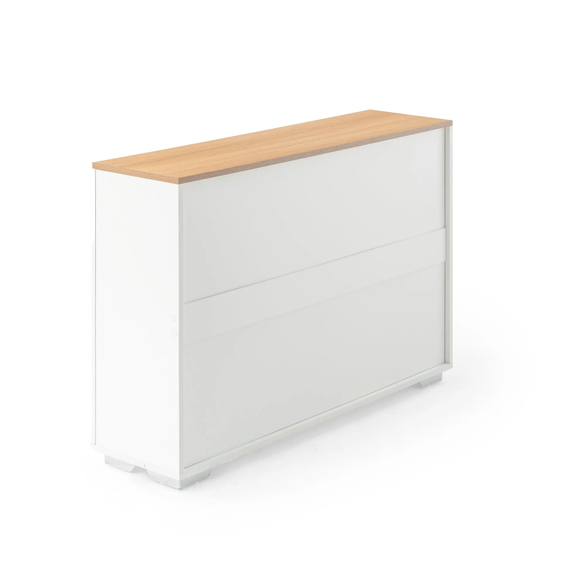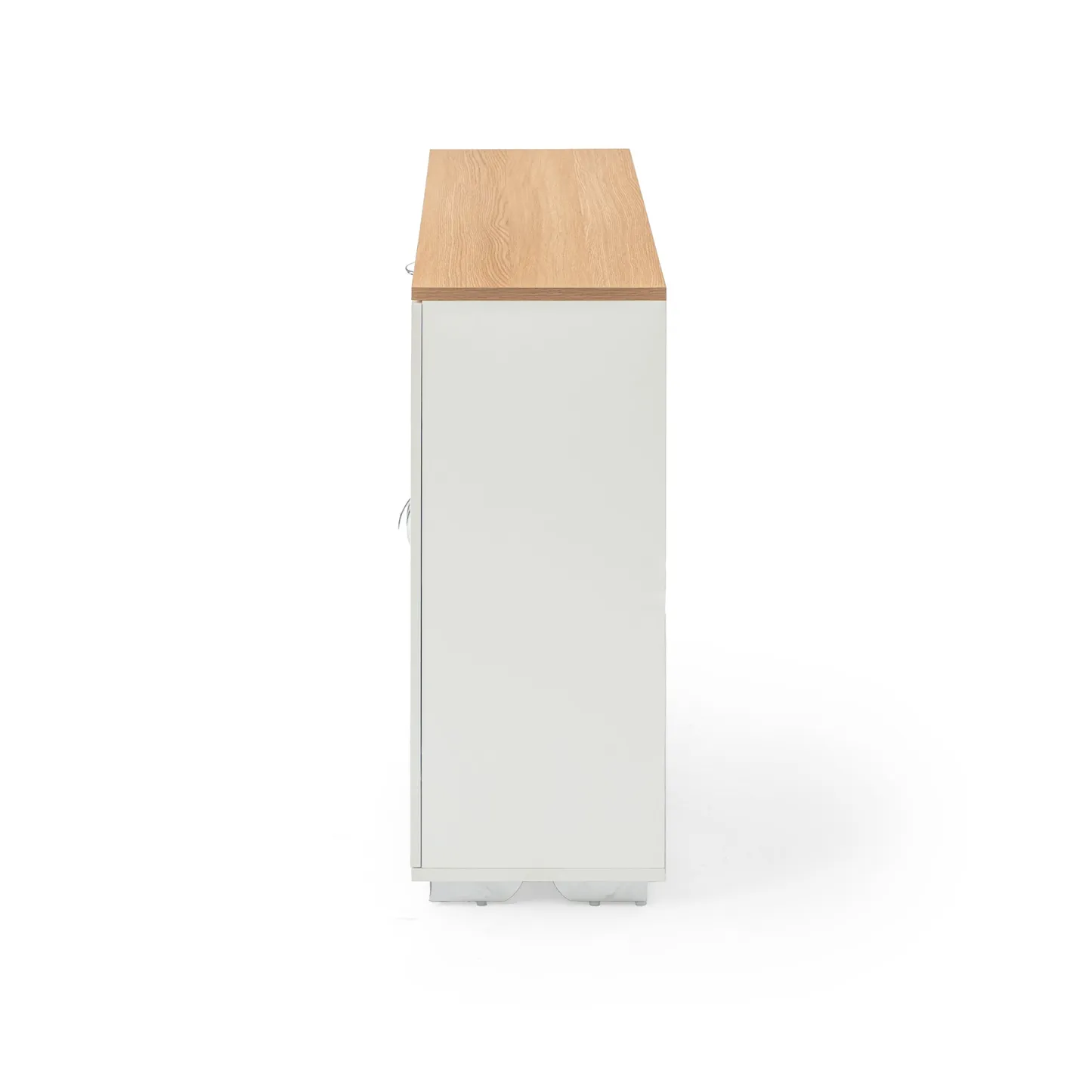 White sideboard with oak look top, one drawer and four doors. Organizes dinnerware and linens for dining room or entry and keeps daily clutter hidden and off the floor.