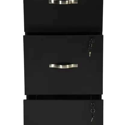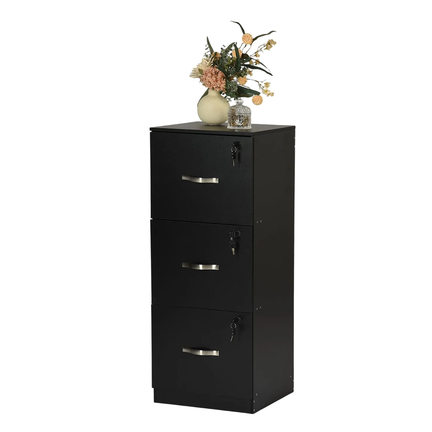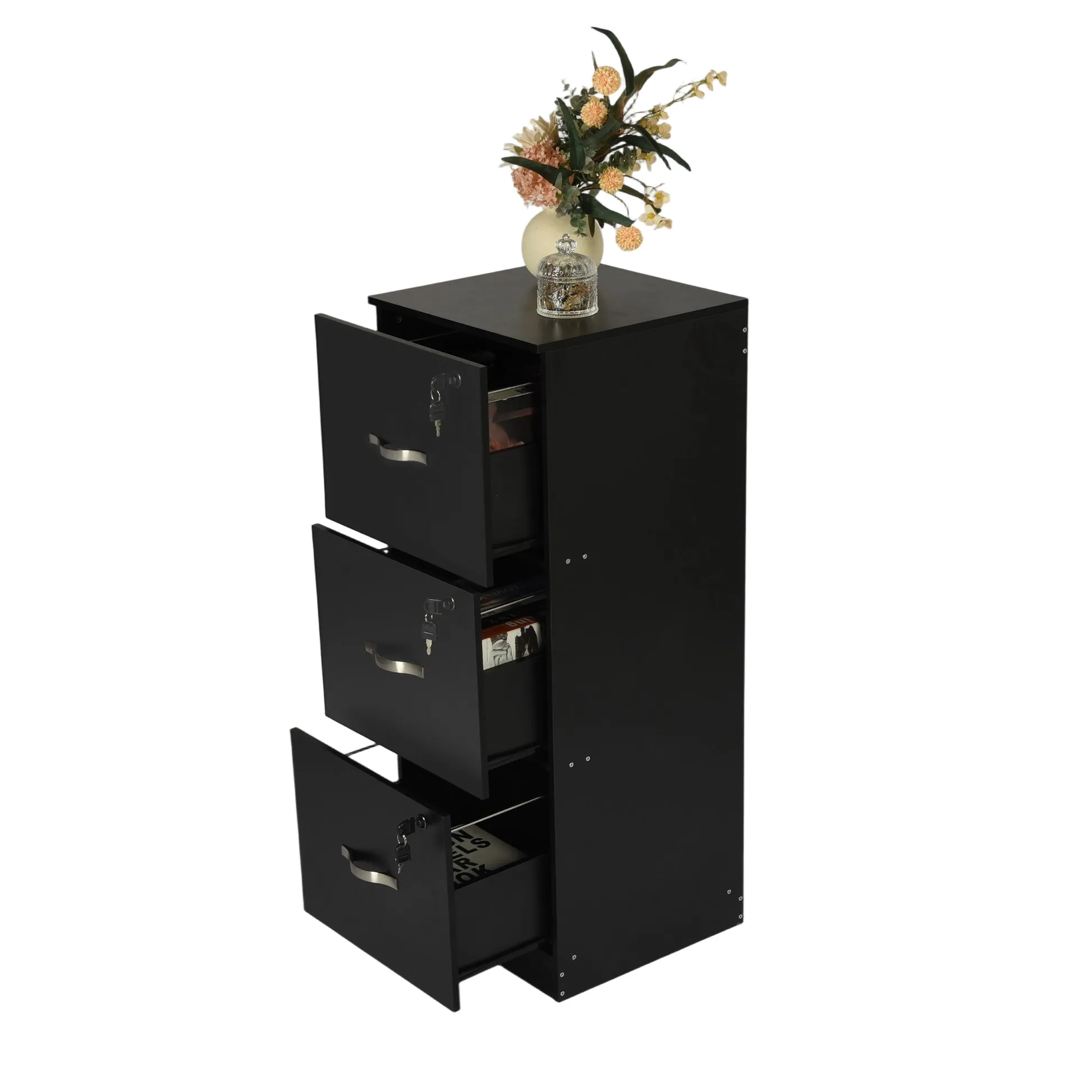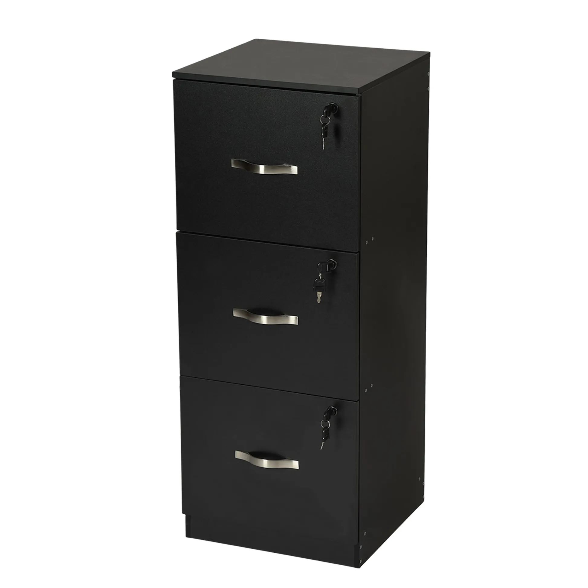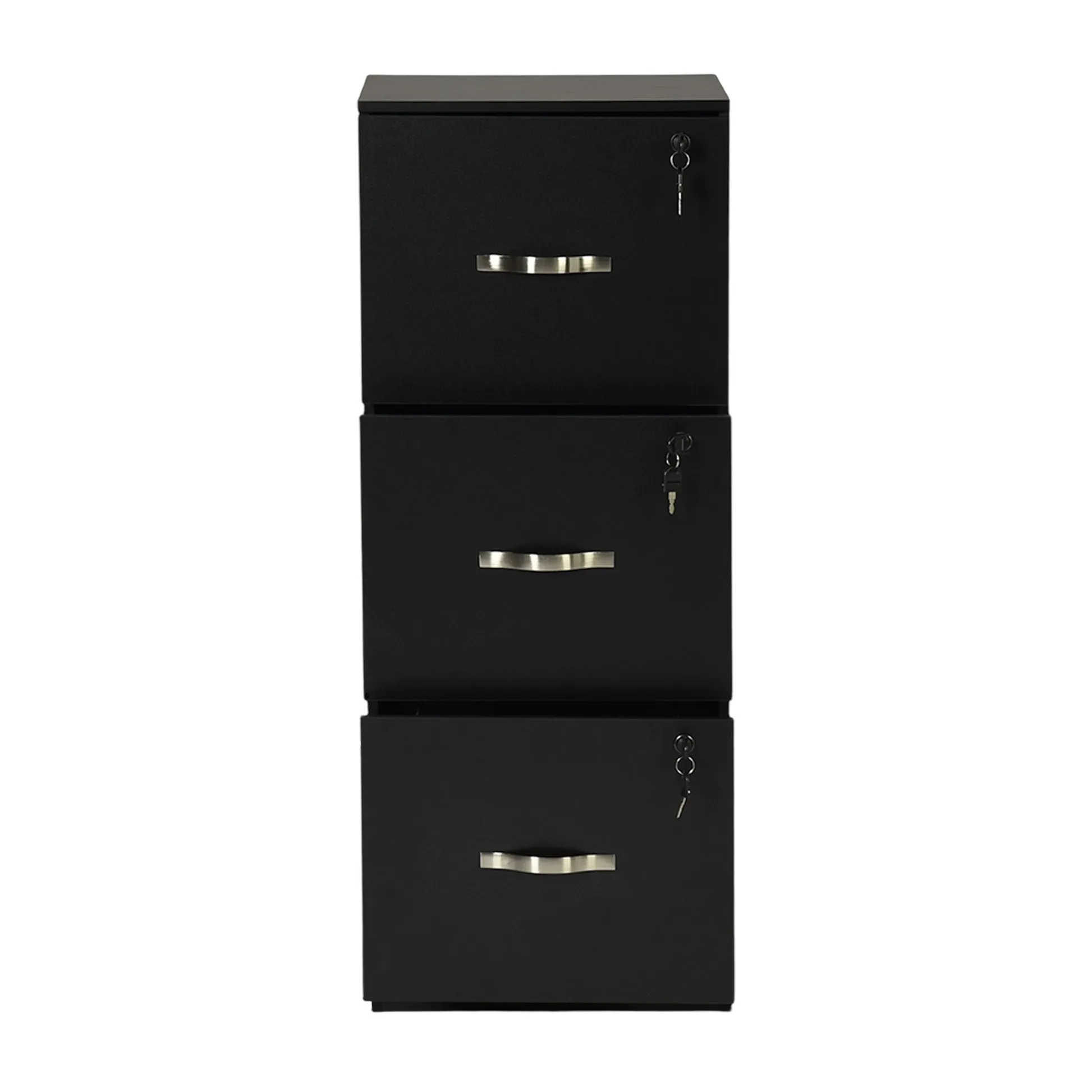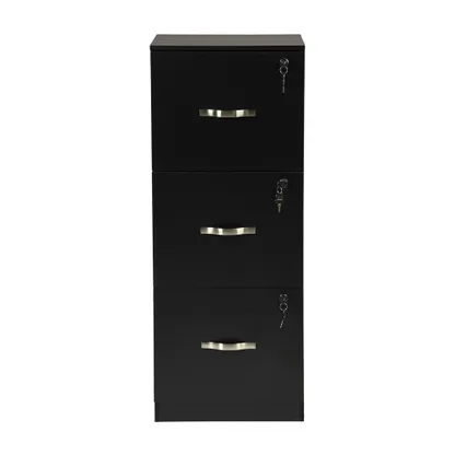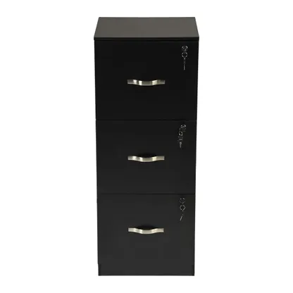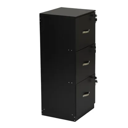 Tall 3 drawer locking file cabinet in black steel for secure home office storage. Deep drawers hold Letter or A4 files and supplies. Clean look suits any desk.