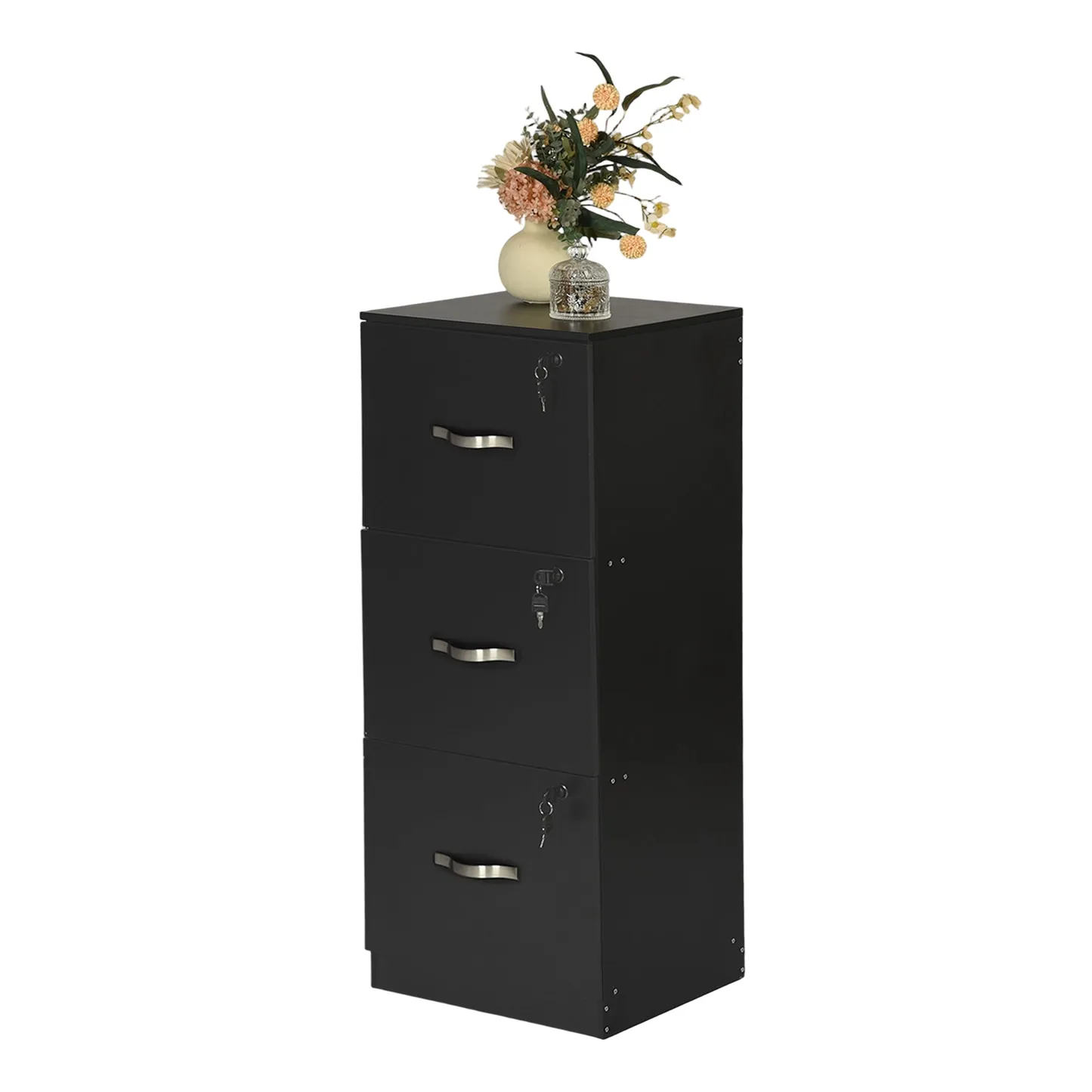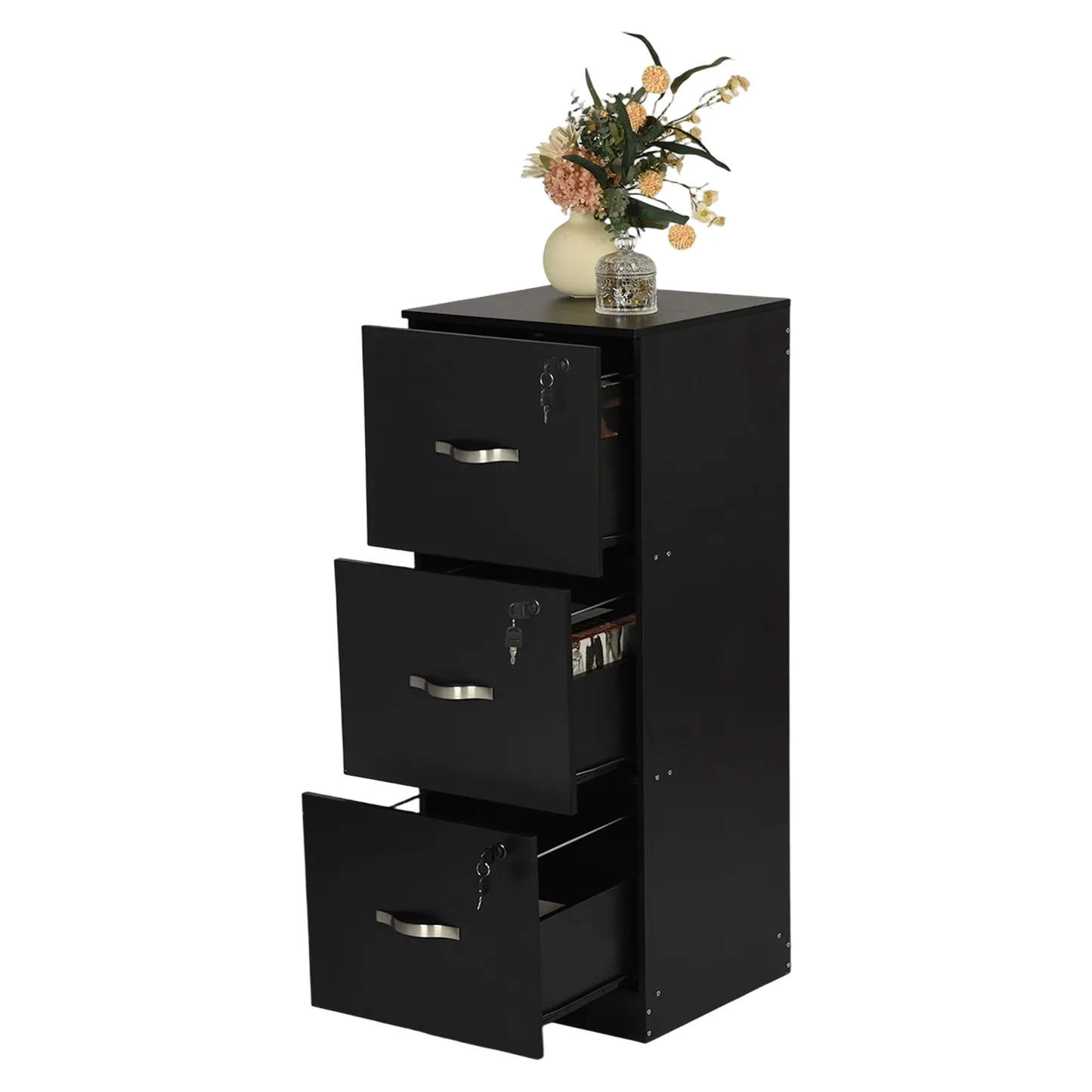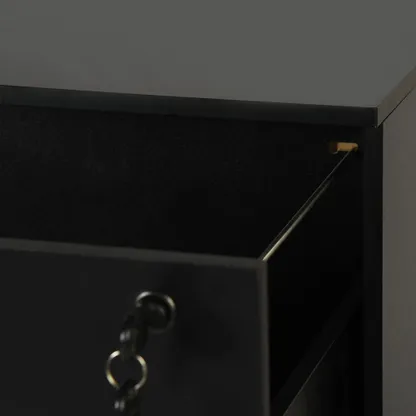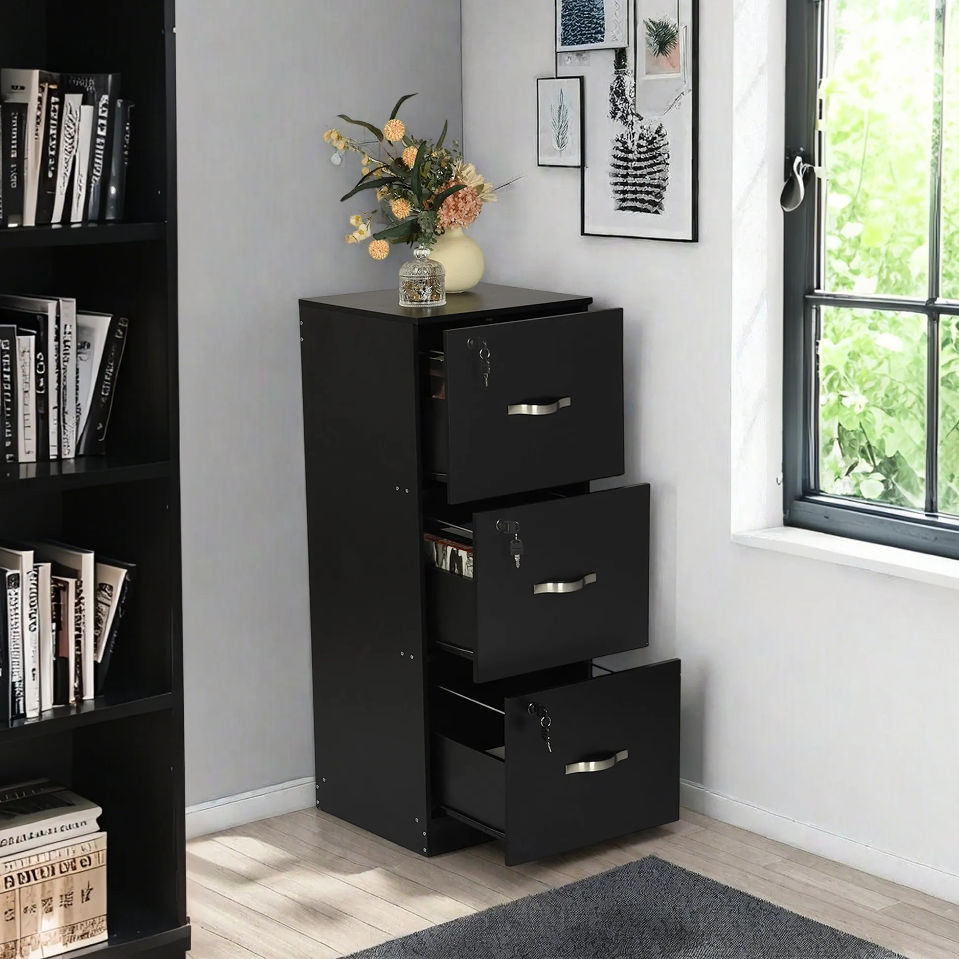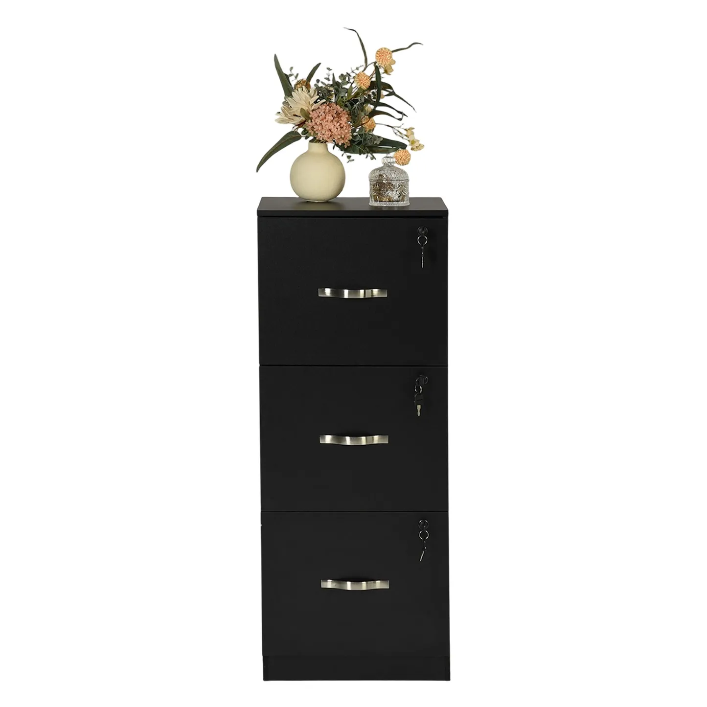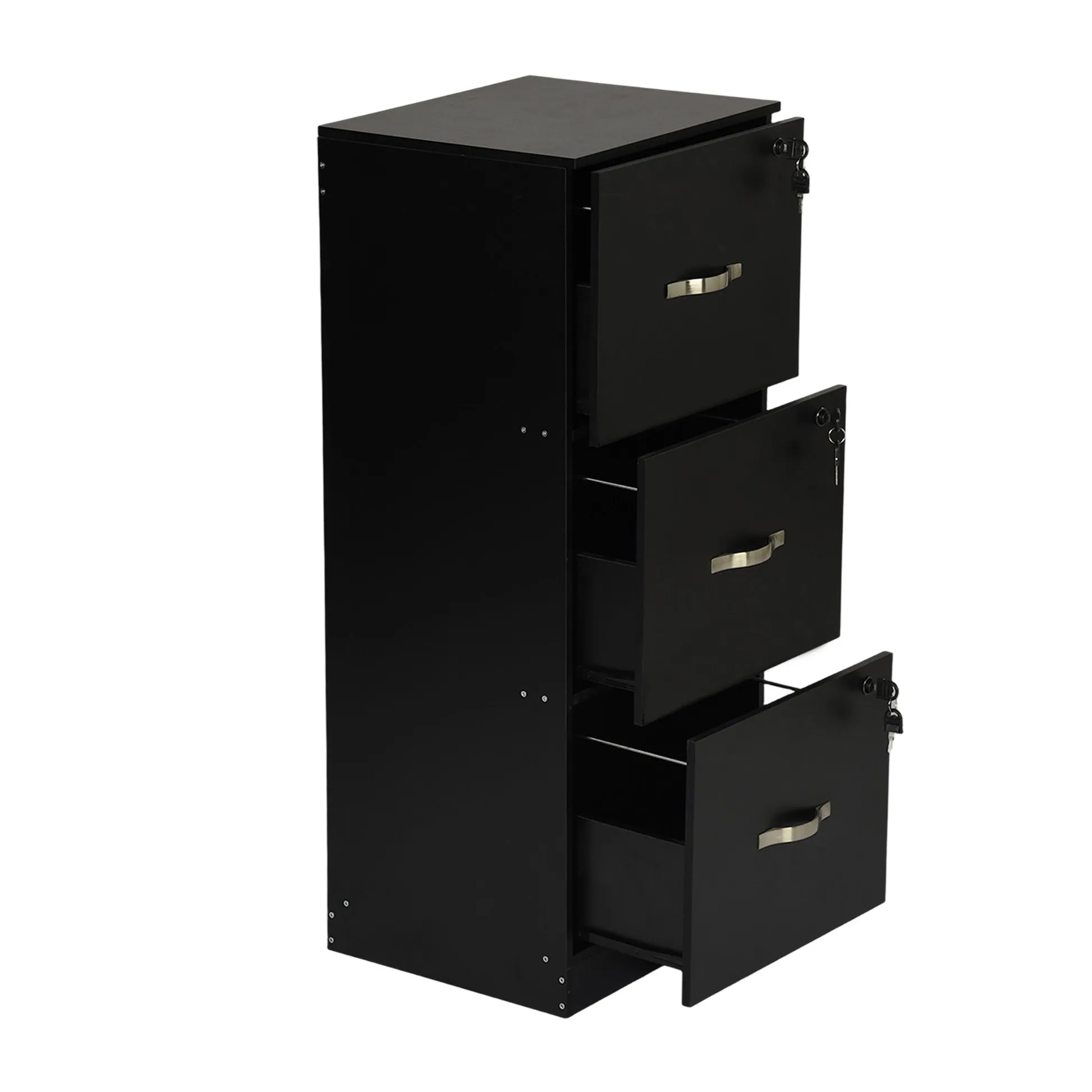 Tall 3 drawer locking file cabinet in black steel for secure home office storage. Deep drawers hold Letter or A4 files and supplies. Clean look suits any desk.