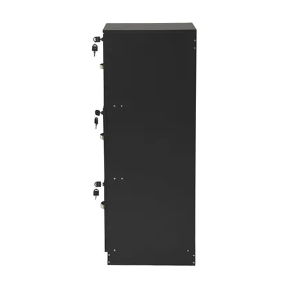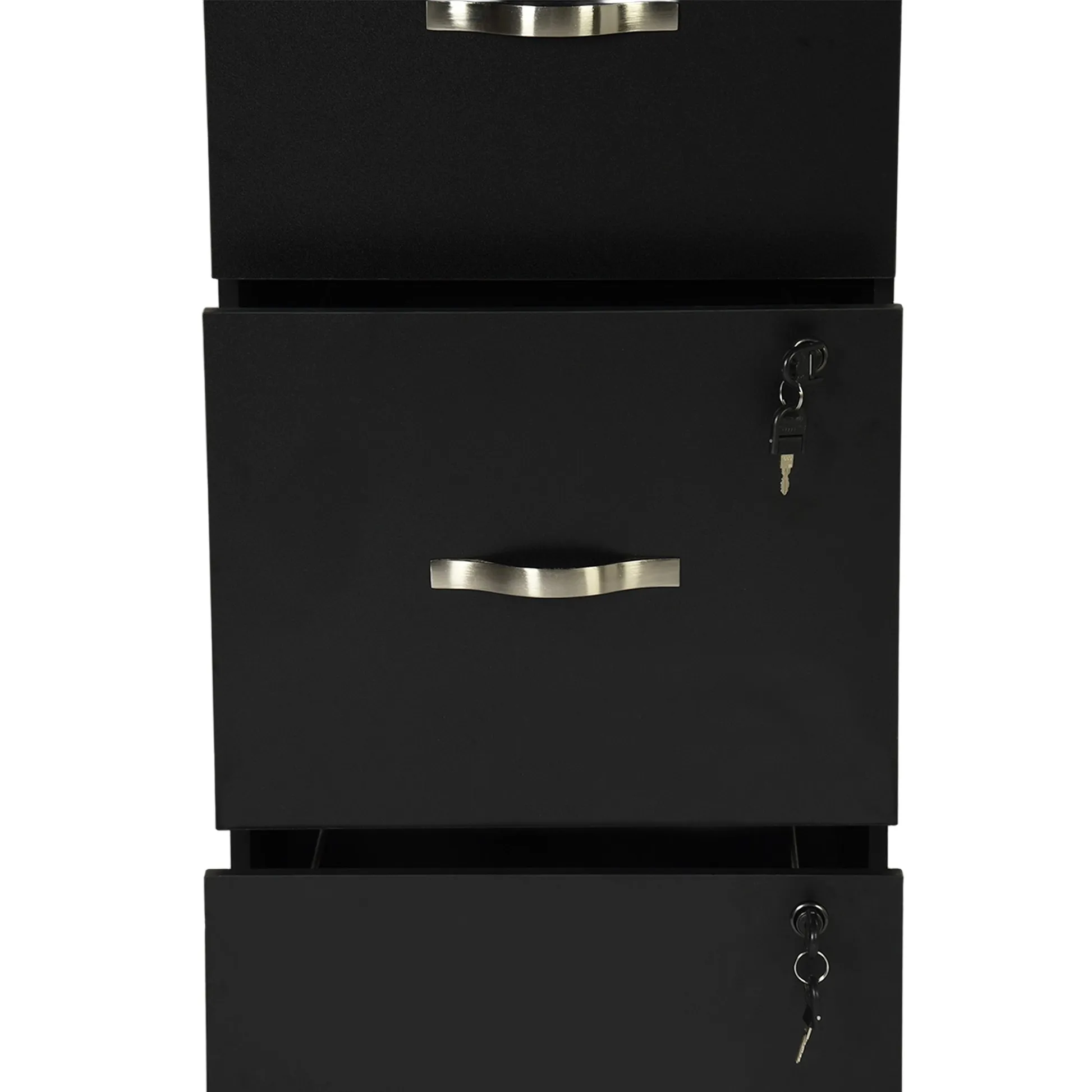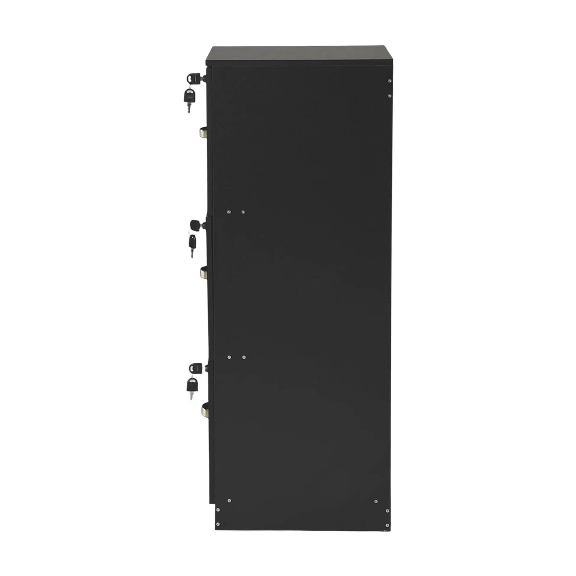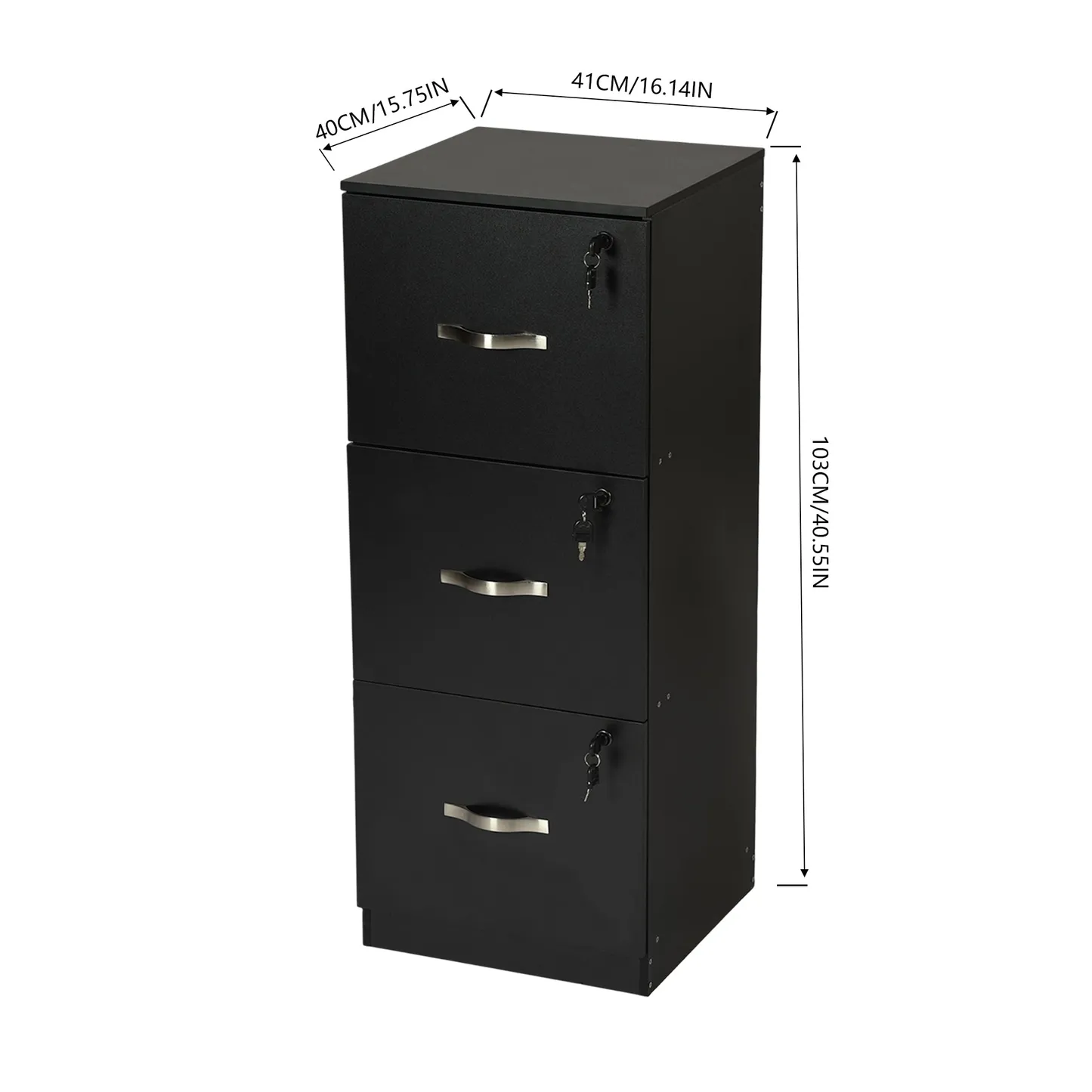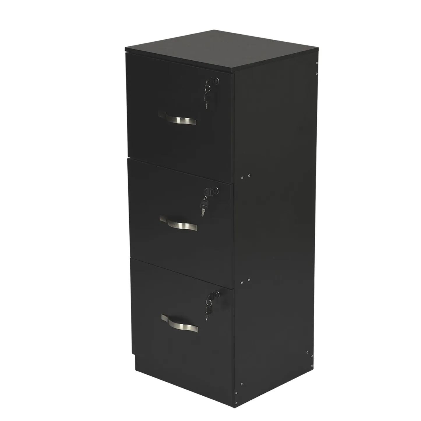 Tall 3 drawer locking file cabinet in black steel for secure home office storage. Deep drawers hold Letter or A4 files and supplies. Clean look suits any desk.