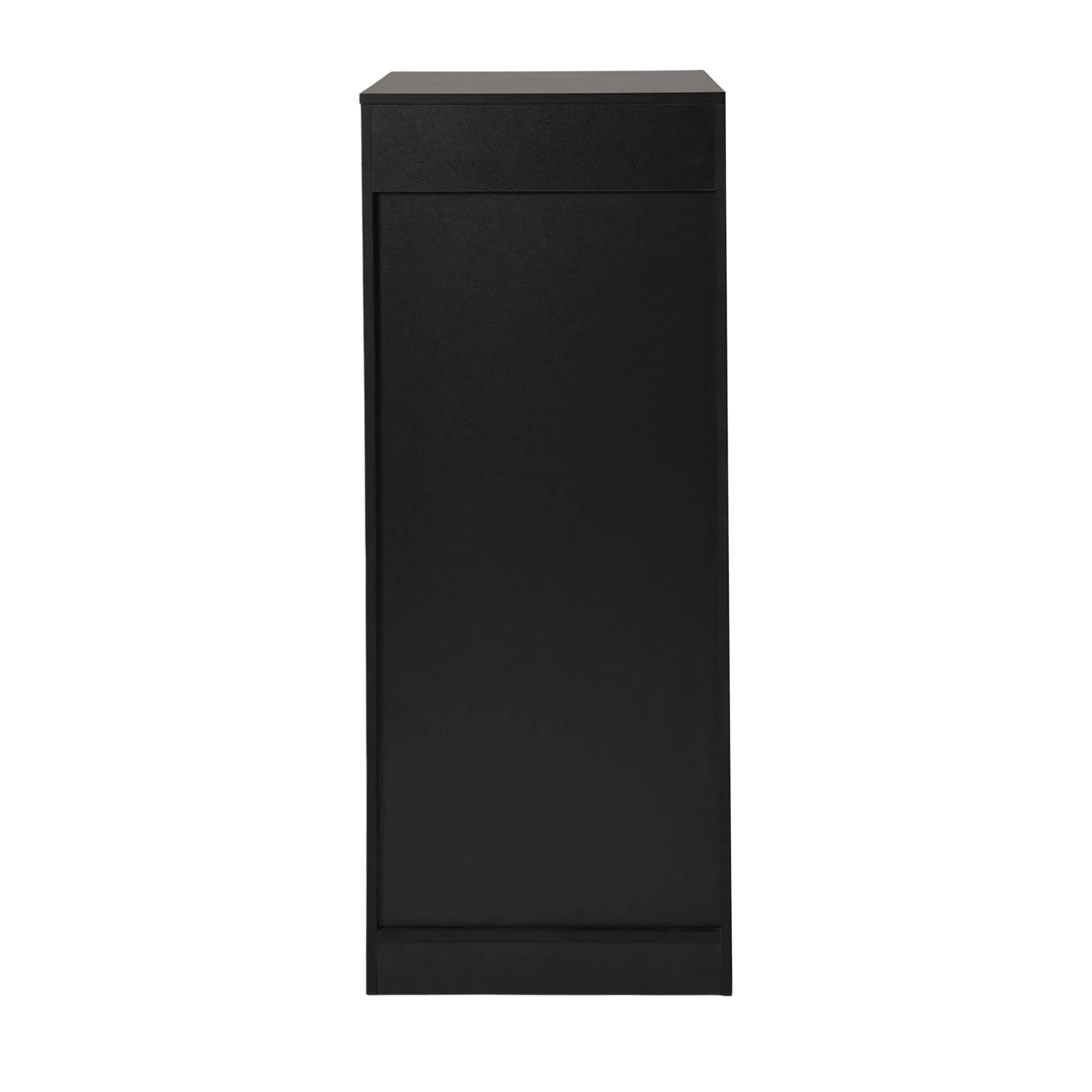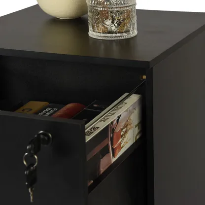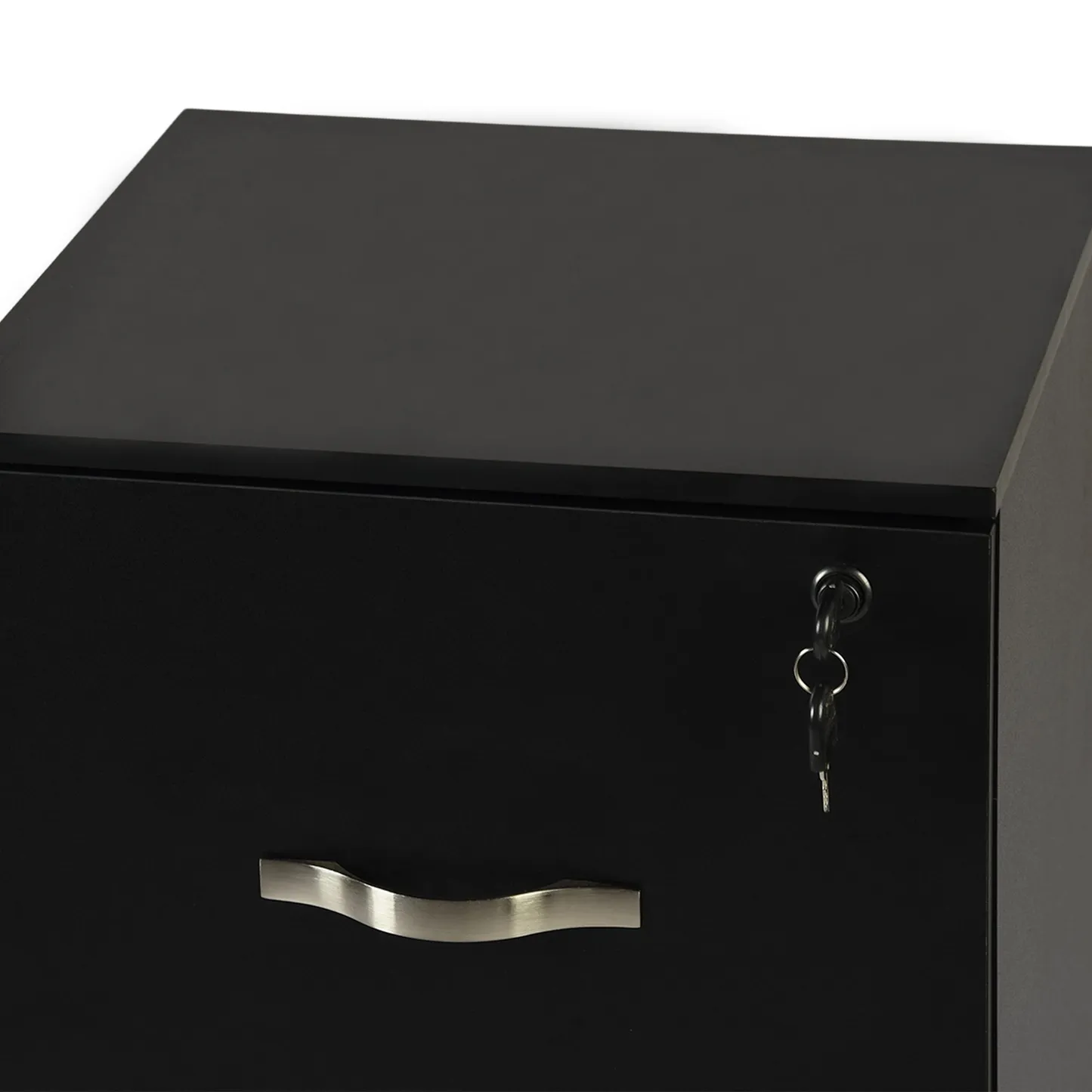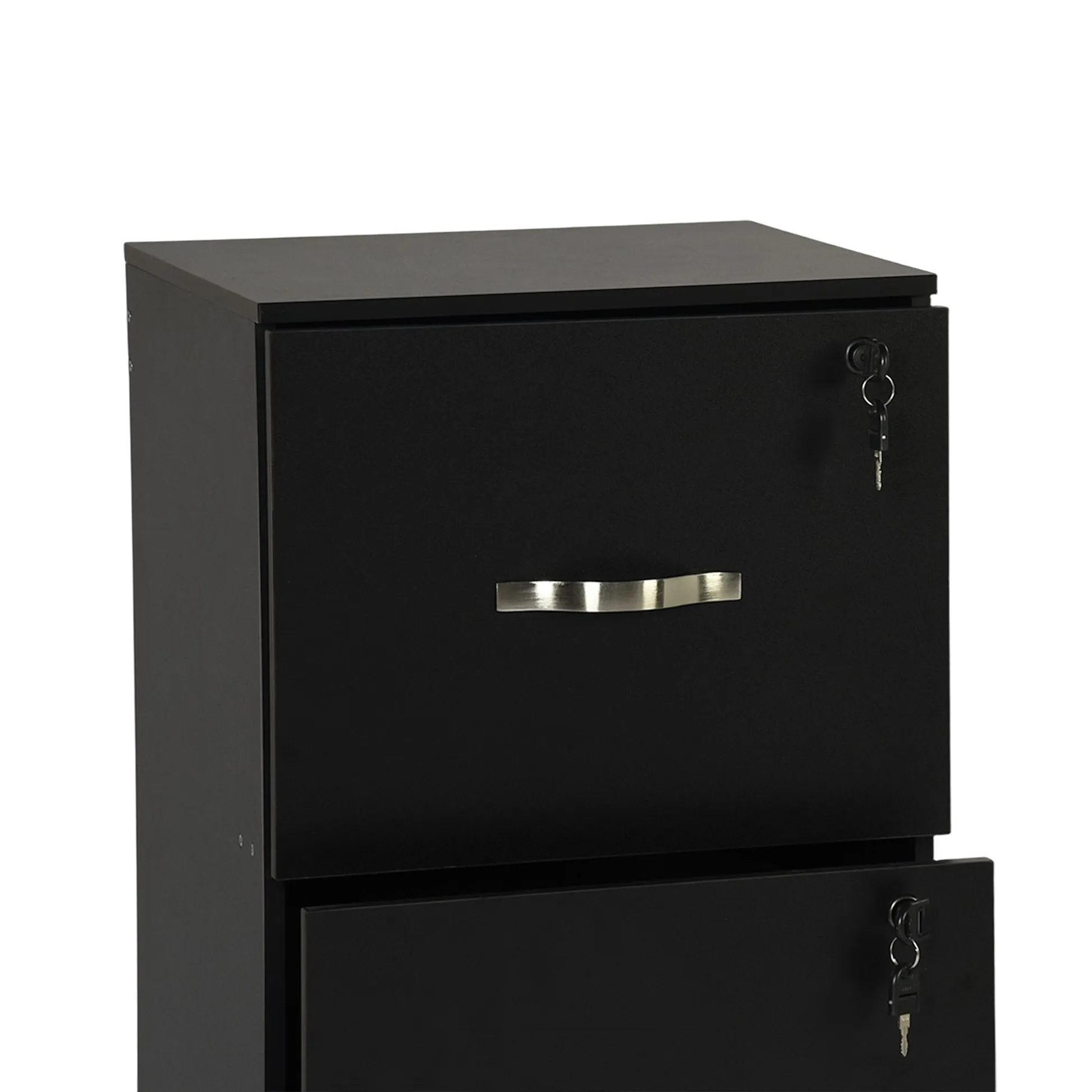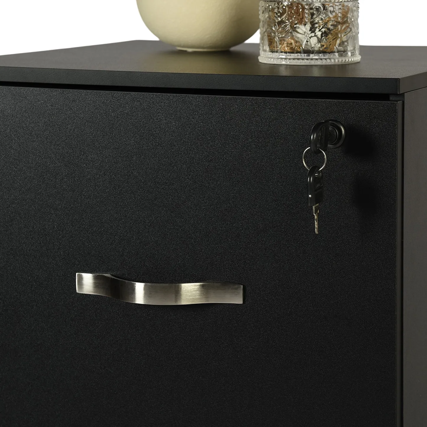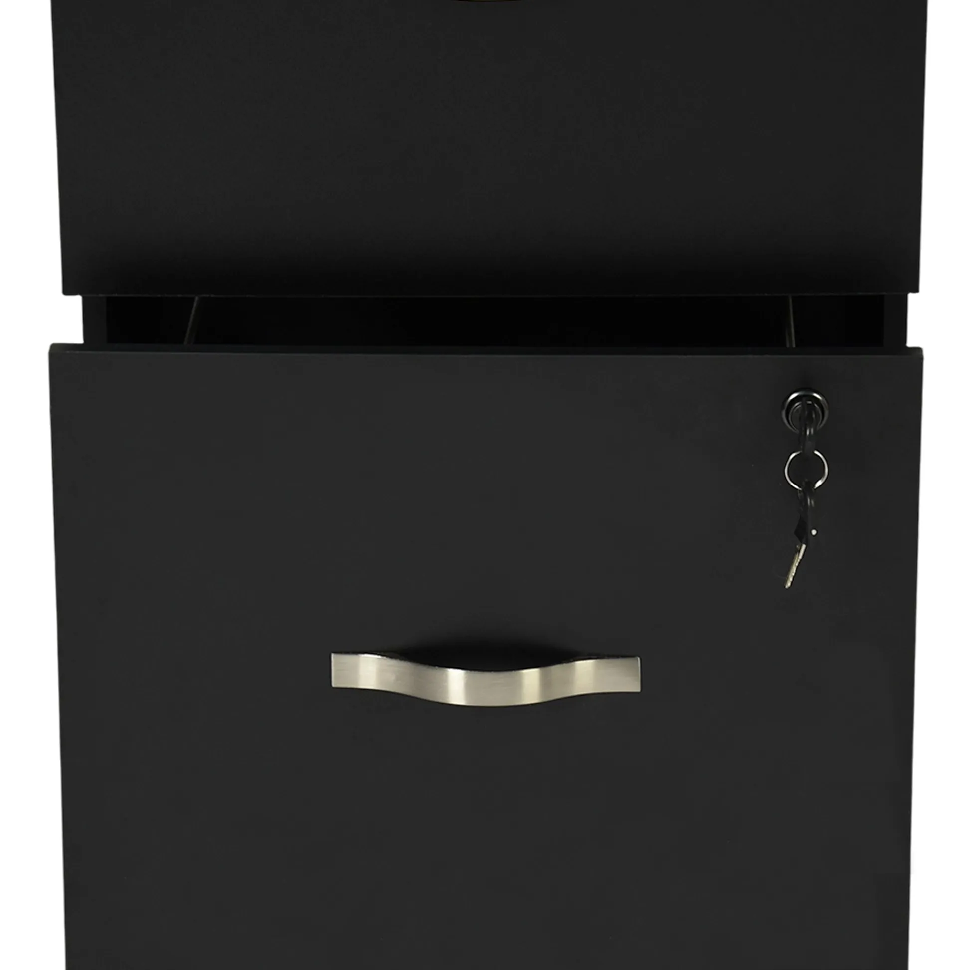 Tall 3 drawer locking file cabinet in black steel for secure home office storage. Deep drawers hold Letter or A4 files and supplies. Clean look suits any desk.