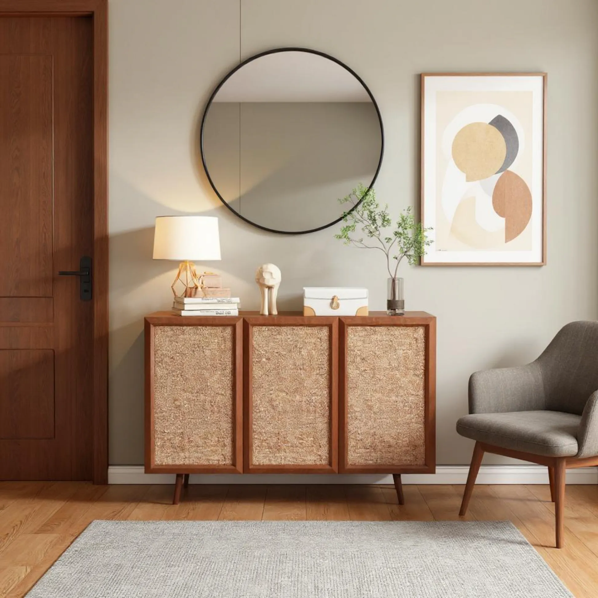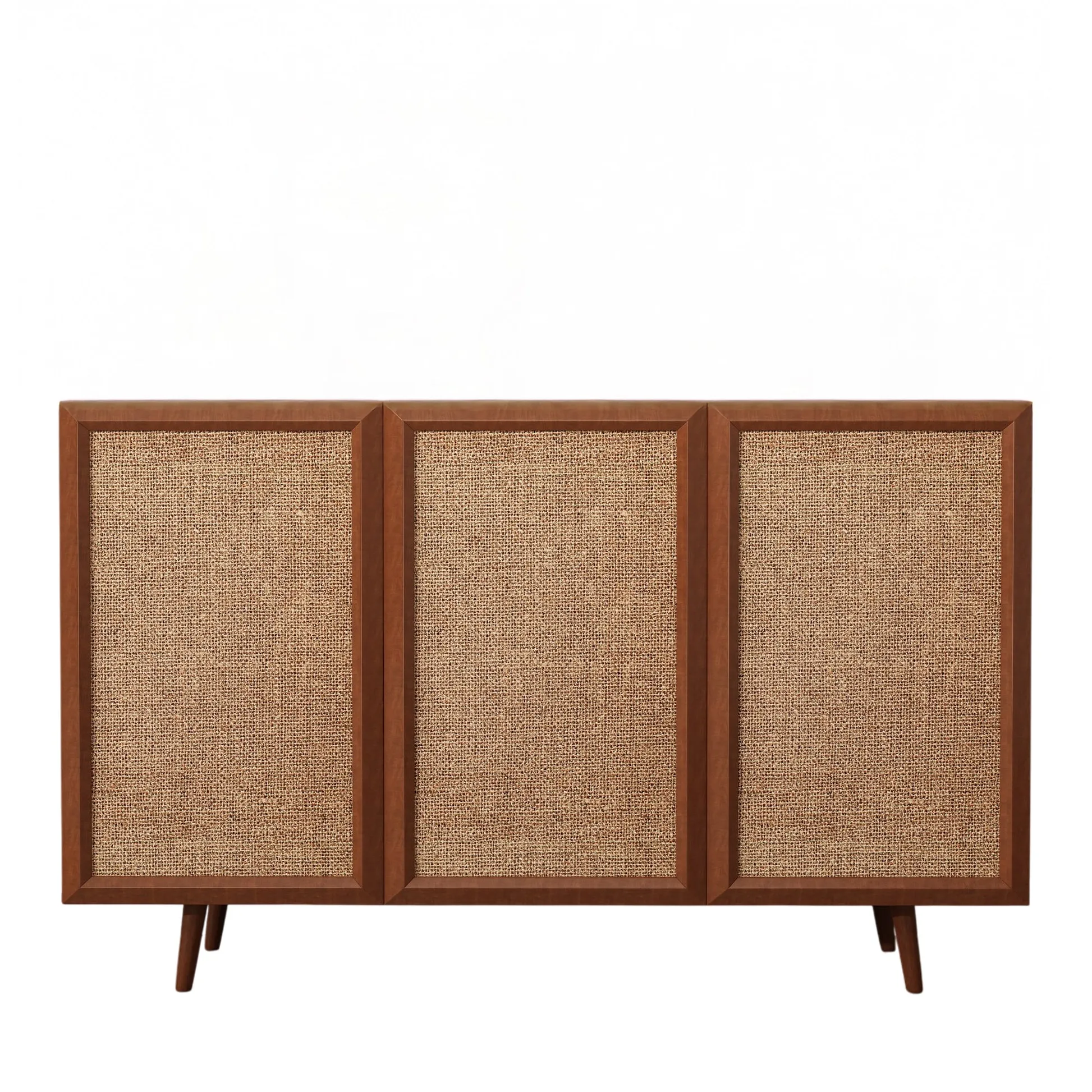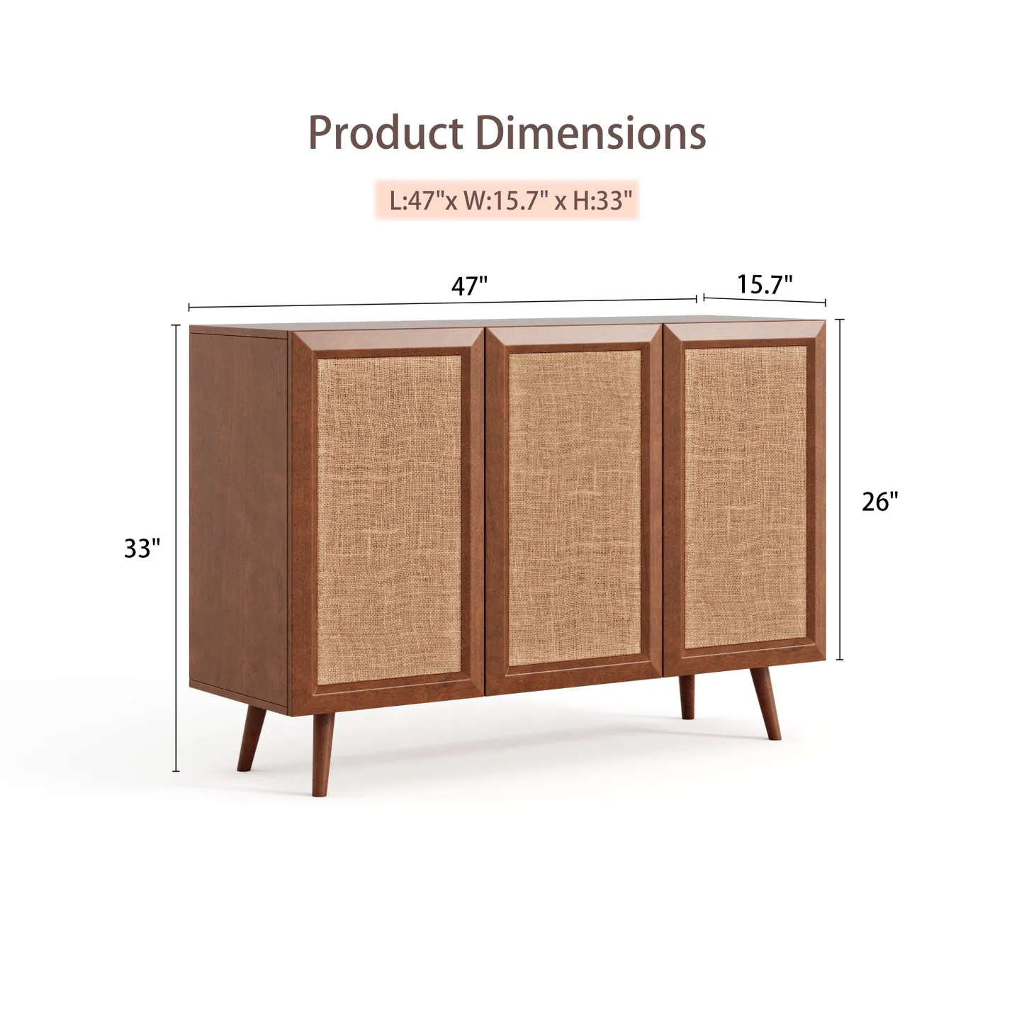 46.85" walnut sideboard with rattan doors, adjustable shelves, and mid-century farmhouse style, perfect for dining room, entryway, or living space storage.