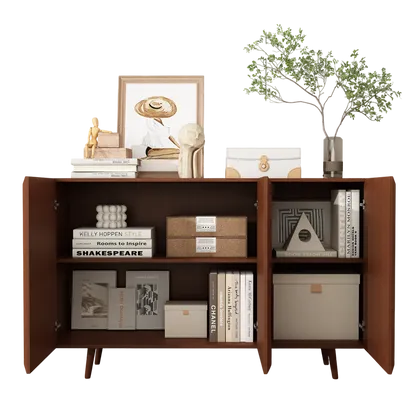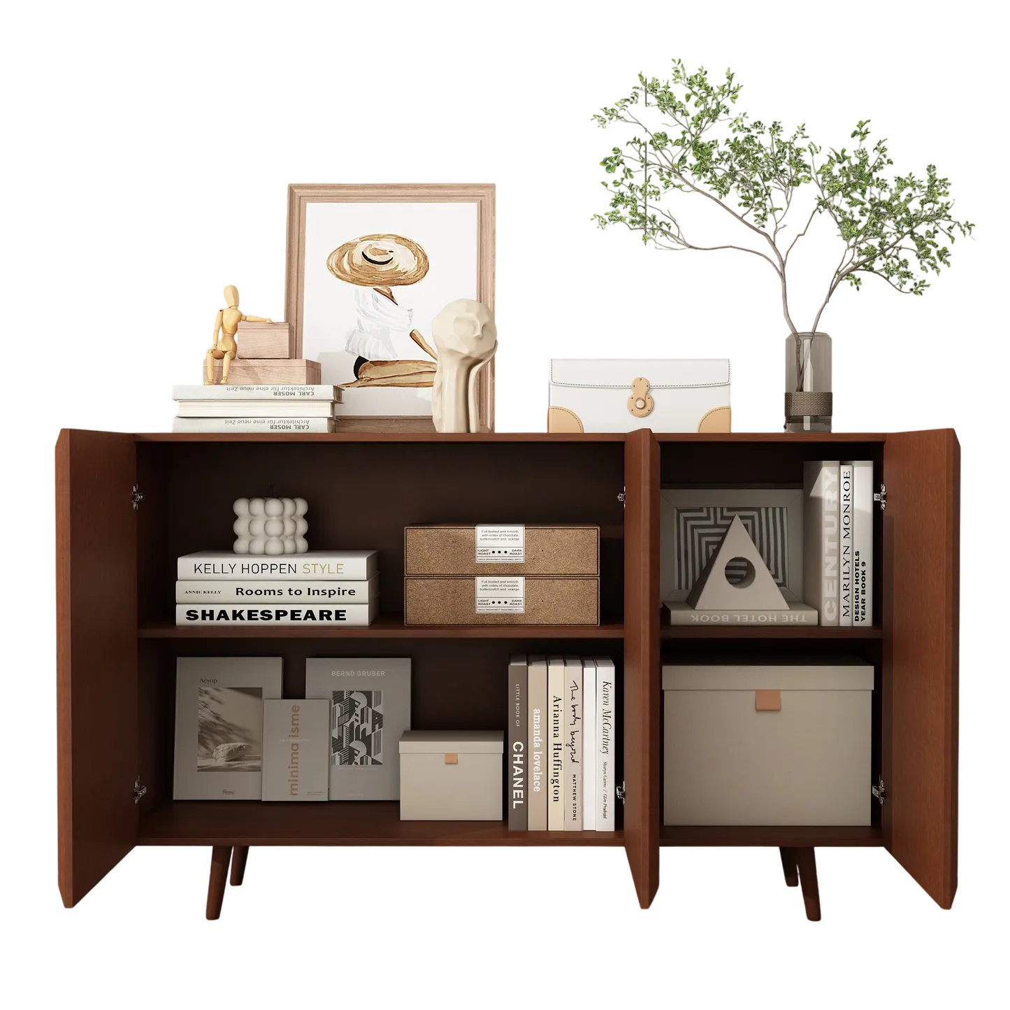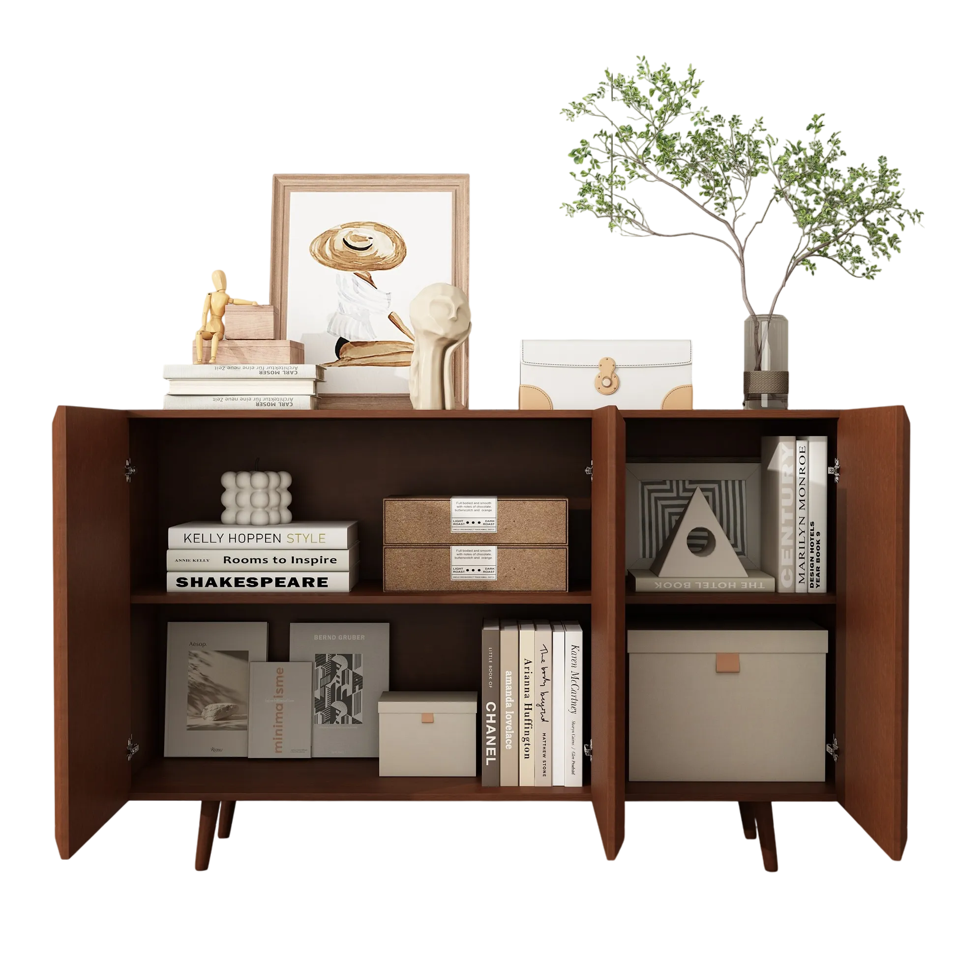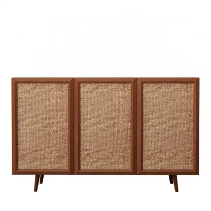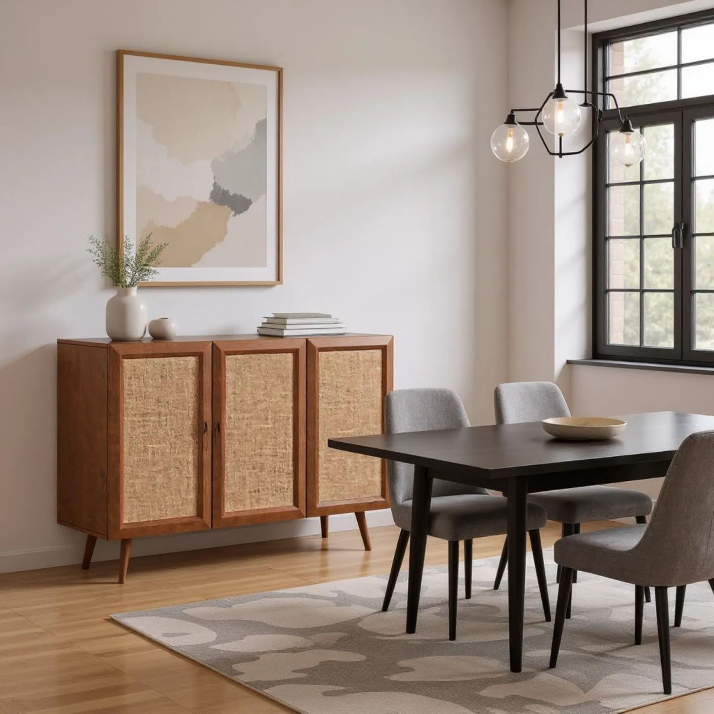 46.85" walnut sideboard with rattan doors, adjustable shelves, and mid-century farmhouse style, perfect for dining room, entryway, or living space storage.