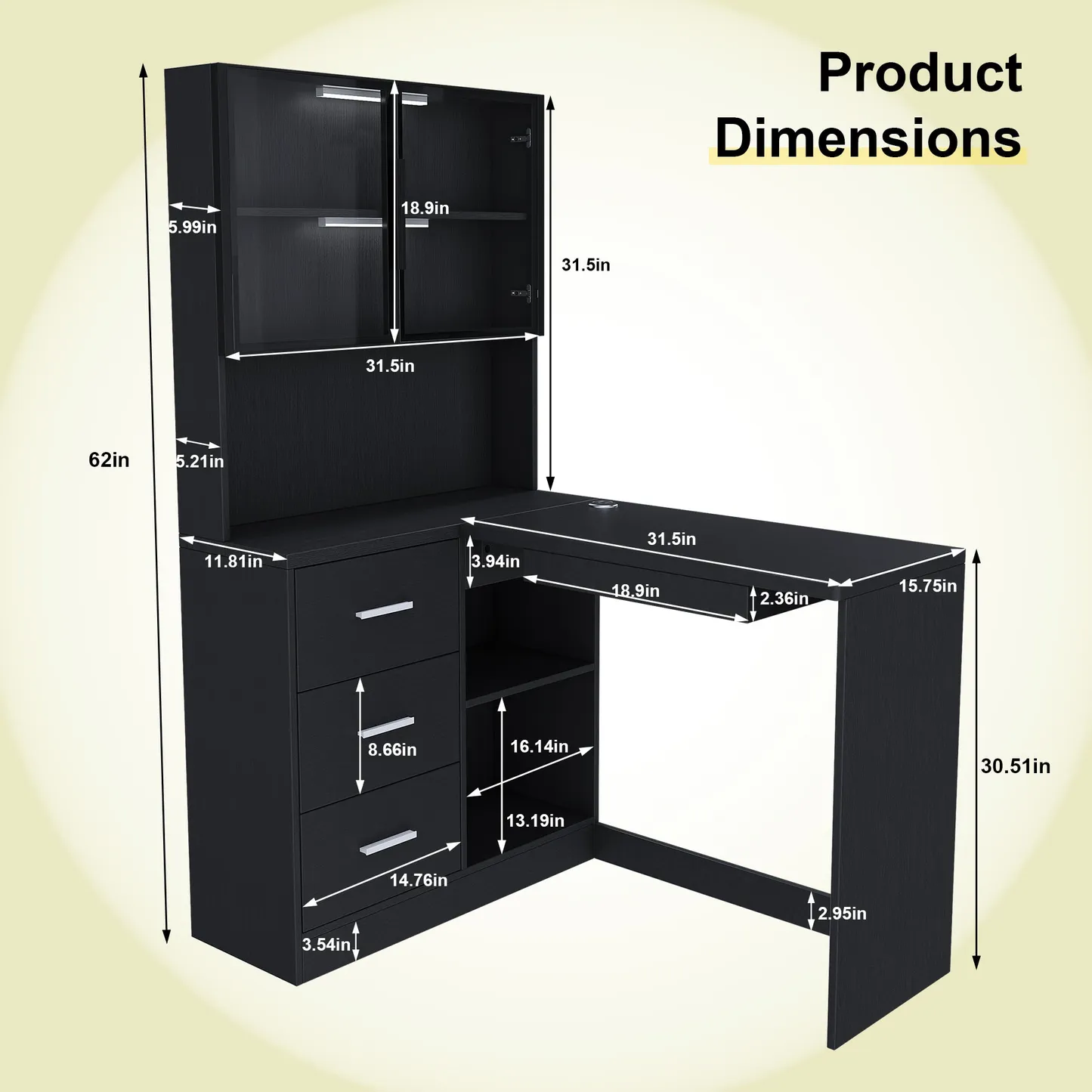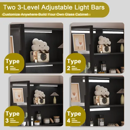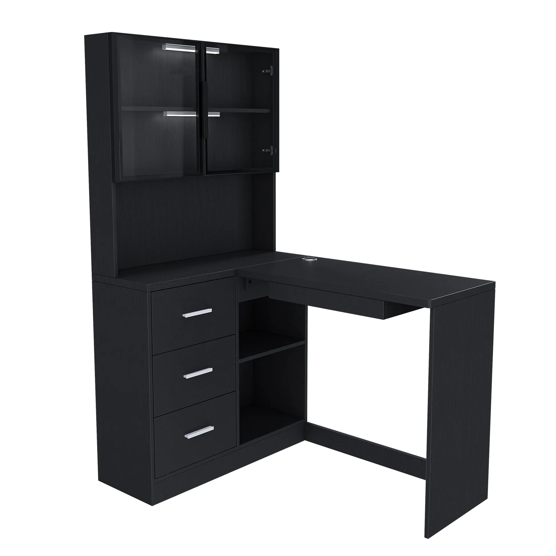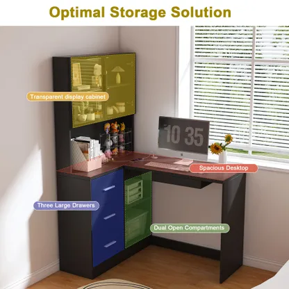 - Spacious L-Shaped Design with Customizable LED Lighting: Features a large, corner-optimized L-shaped layout providing ample work surface and integrated organization with glass cabinets. Enhanced by two versatile, customizable LED light tubes, this setup allows you to precisely direct accent lighting inside the glass cabinets鈥攅nsuring optimal brightness for showcased items while elevating the sleek display aesthetic.