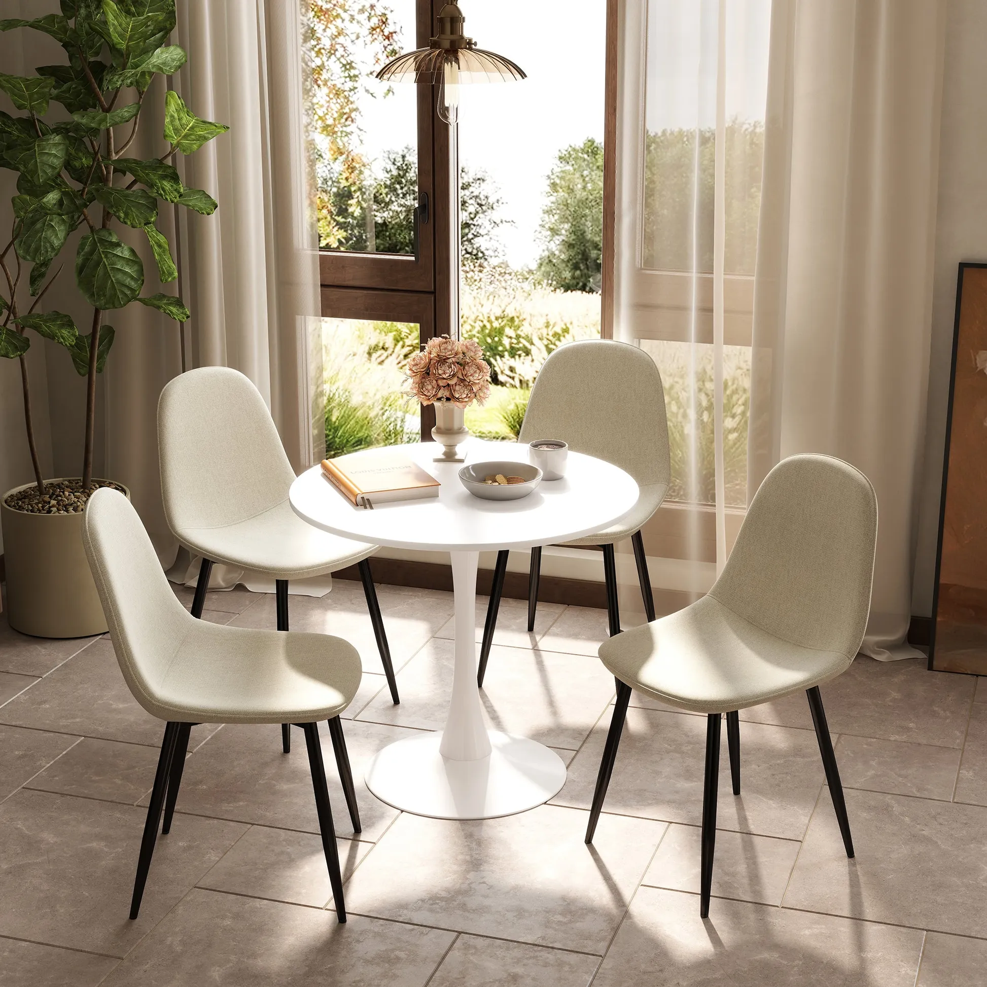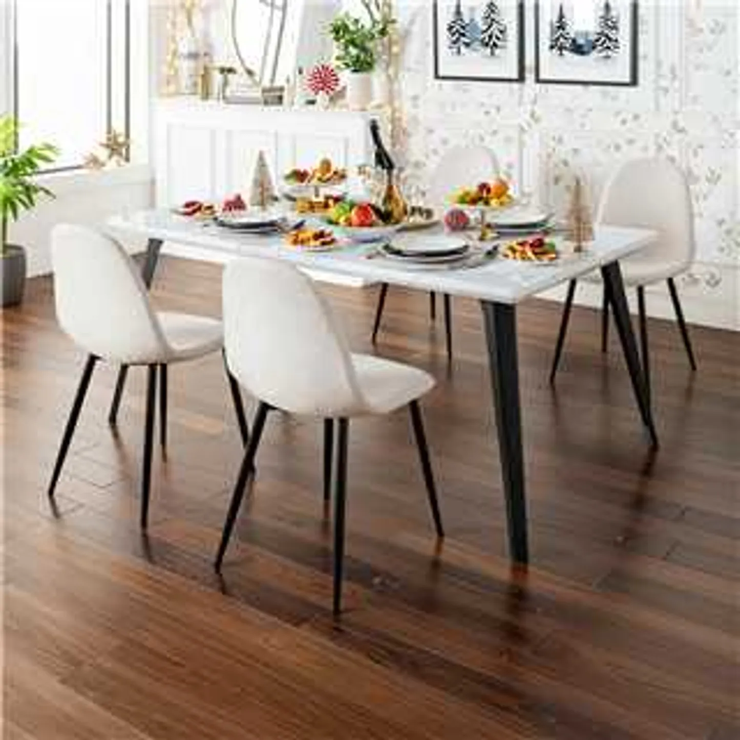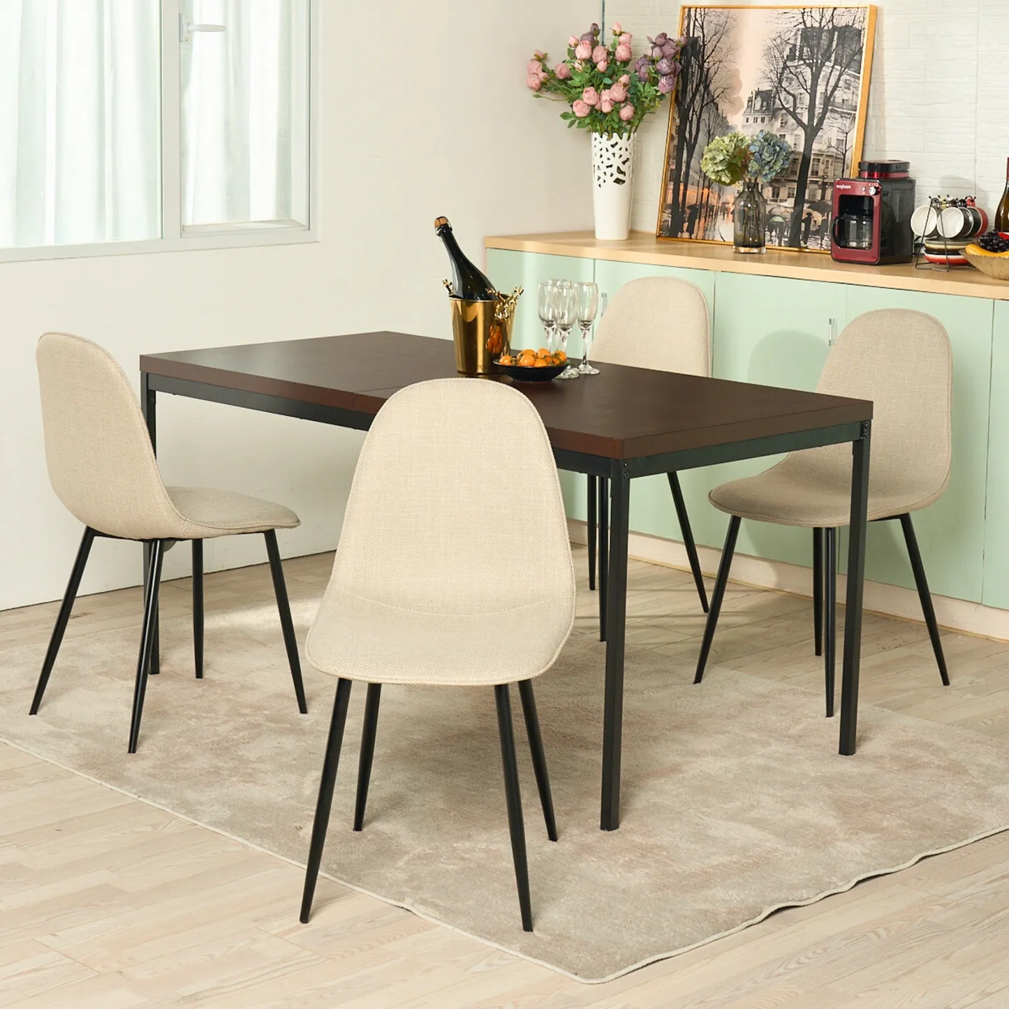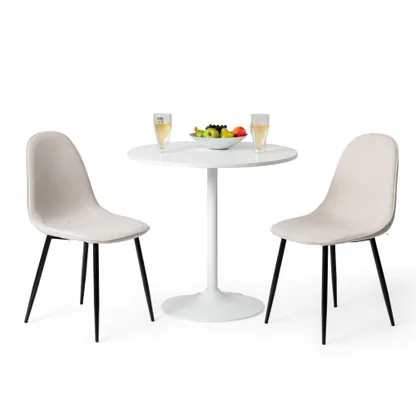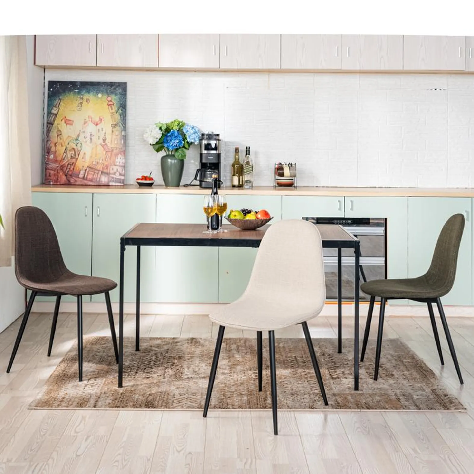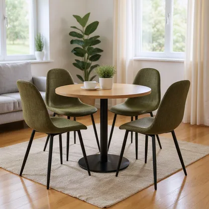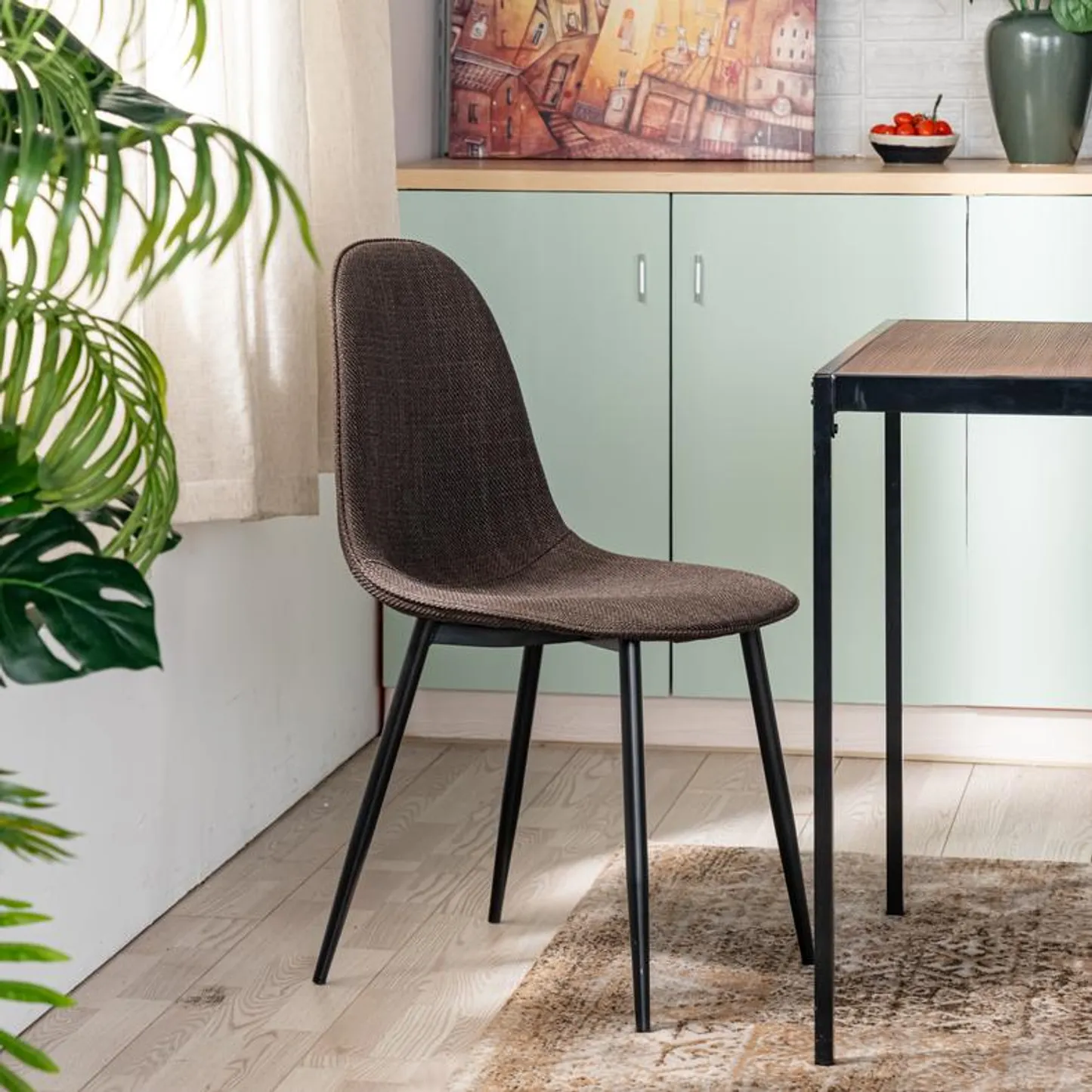 This stylish dining chair features a soft, fabric seat with a sleek black metal frame. Its modern design offers both comfort and durability, making it the perfect addition to your dining room or kitchen. With a weight capacity of 250 lbs, this chair provides long-lasting support for casual dining or extra seating.