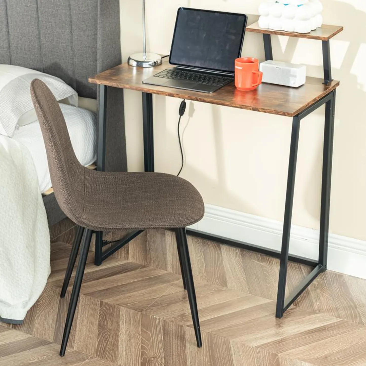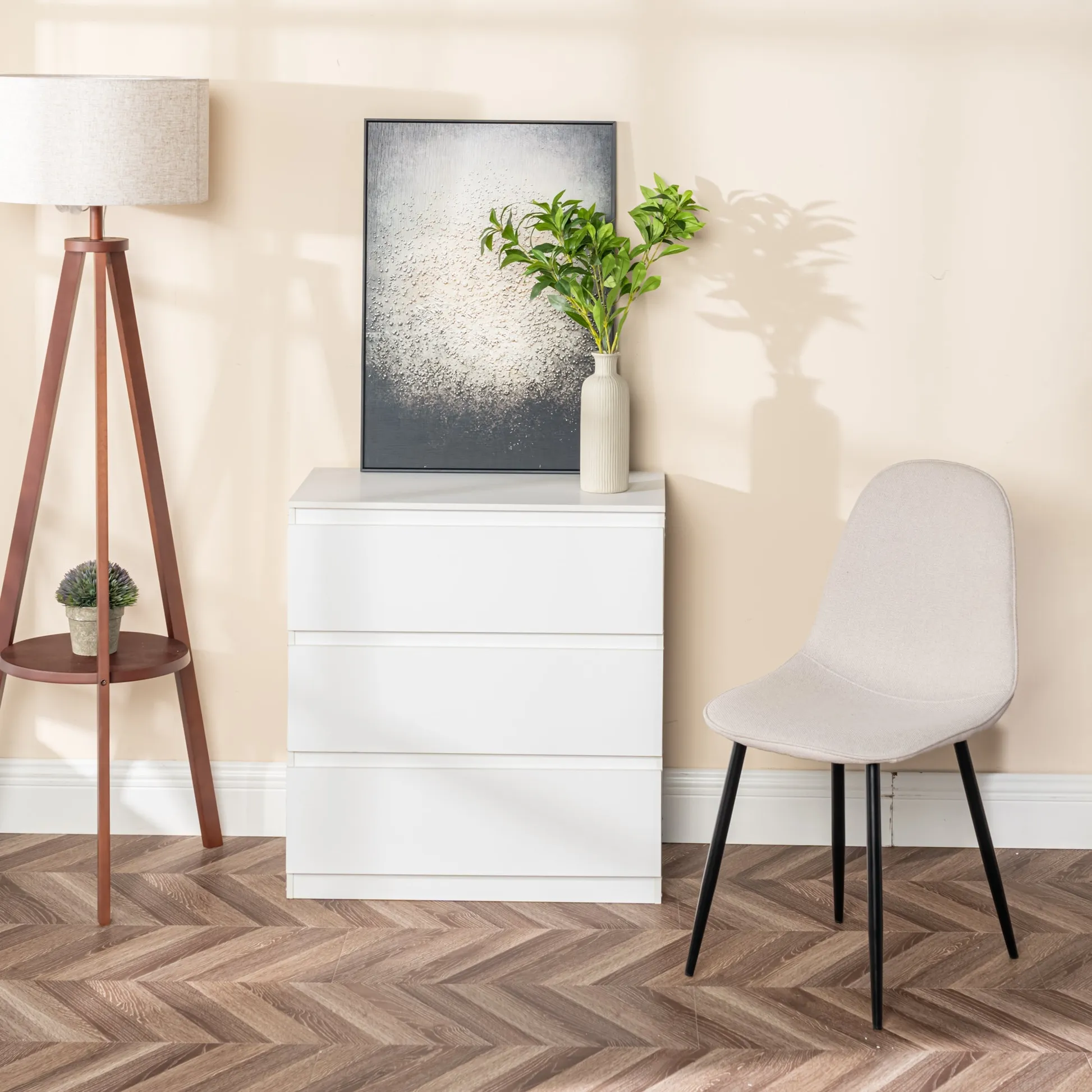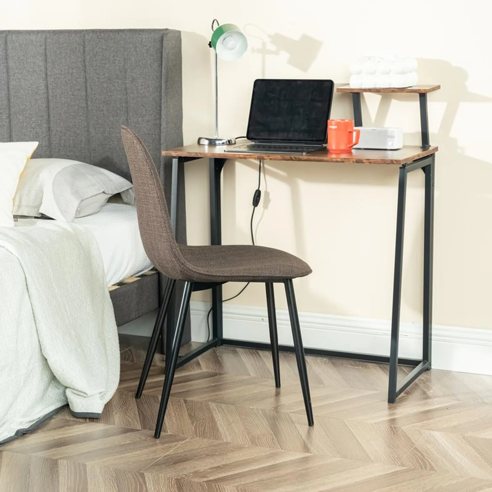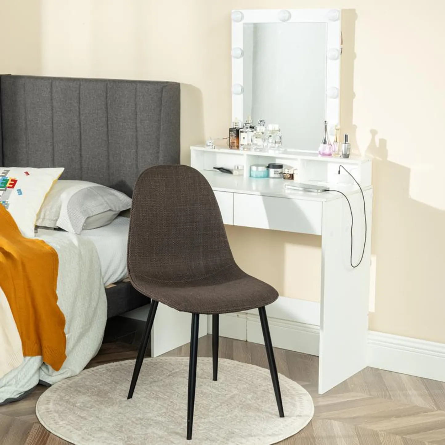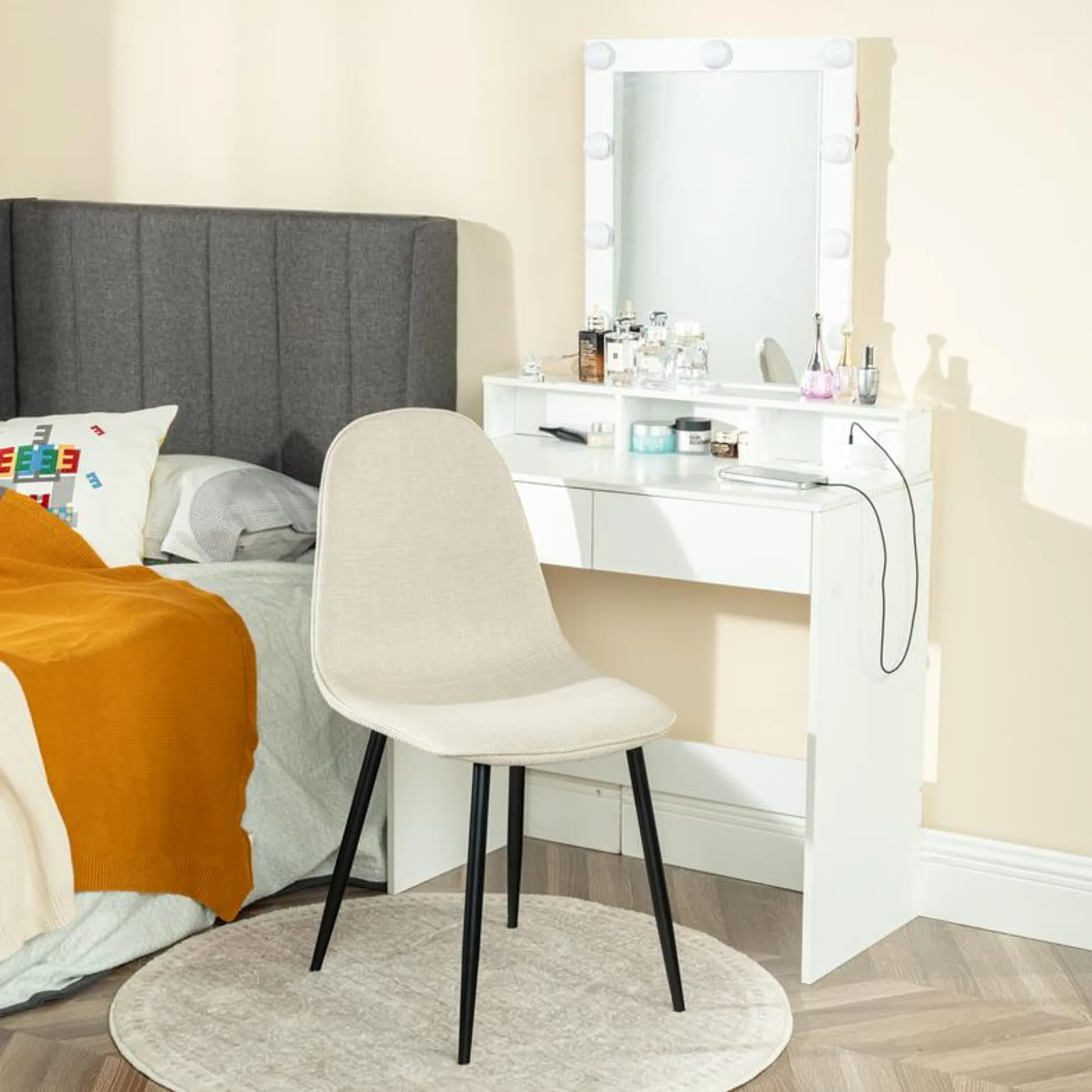 This stylish dining chair features a soft, fabric seat with a sleek black metal frame. Its modern design offers both comfort and durability, making it the perfect addition to your dining room or kitchen. With a weight capacity of 250 lbs, this chair provides long-lasting support for casual dining or extra seating.