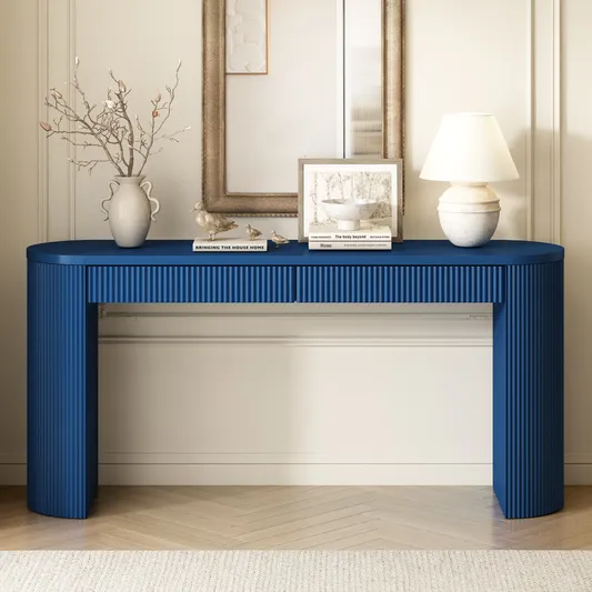 58.2' Entryway Table with Large Top and Dual Drawers,Console Table with Arched Sturdy Legs Stripe Design,Pine Veneer Sofa Table with Adjustable Feet for Living Room, Hallway,Foyer, Kitchen