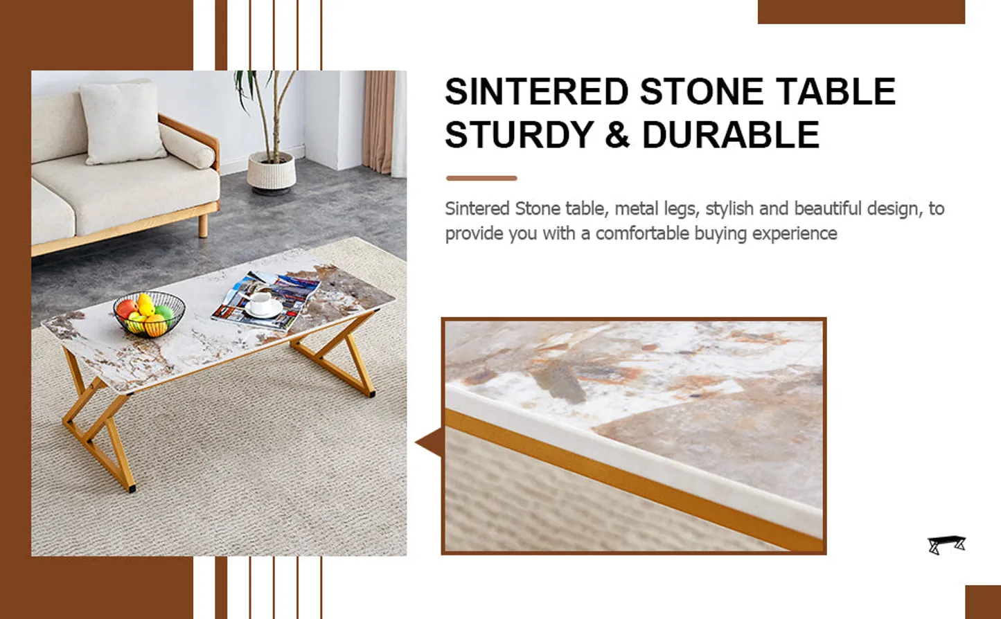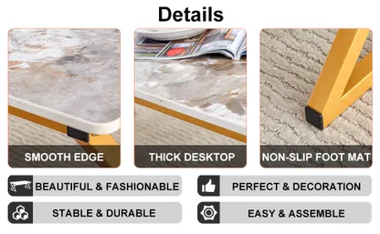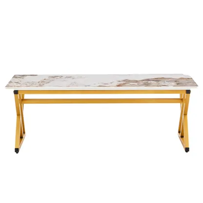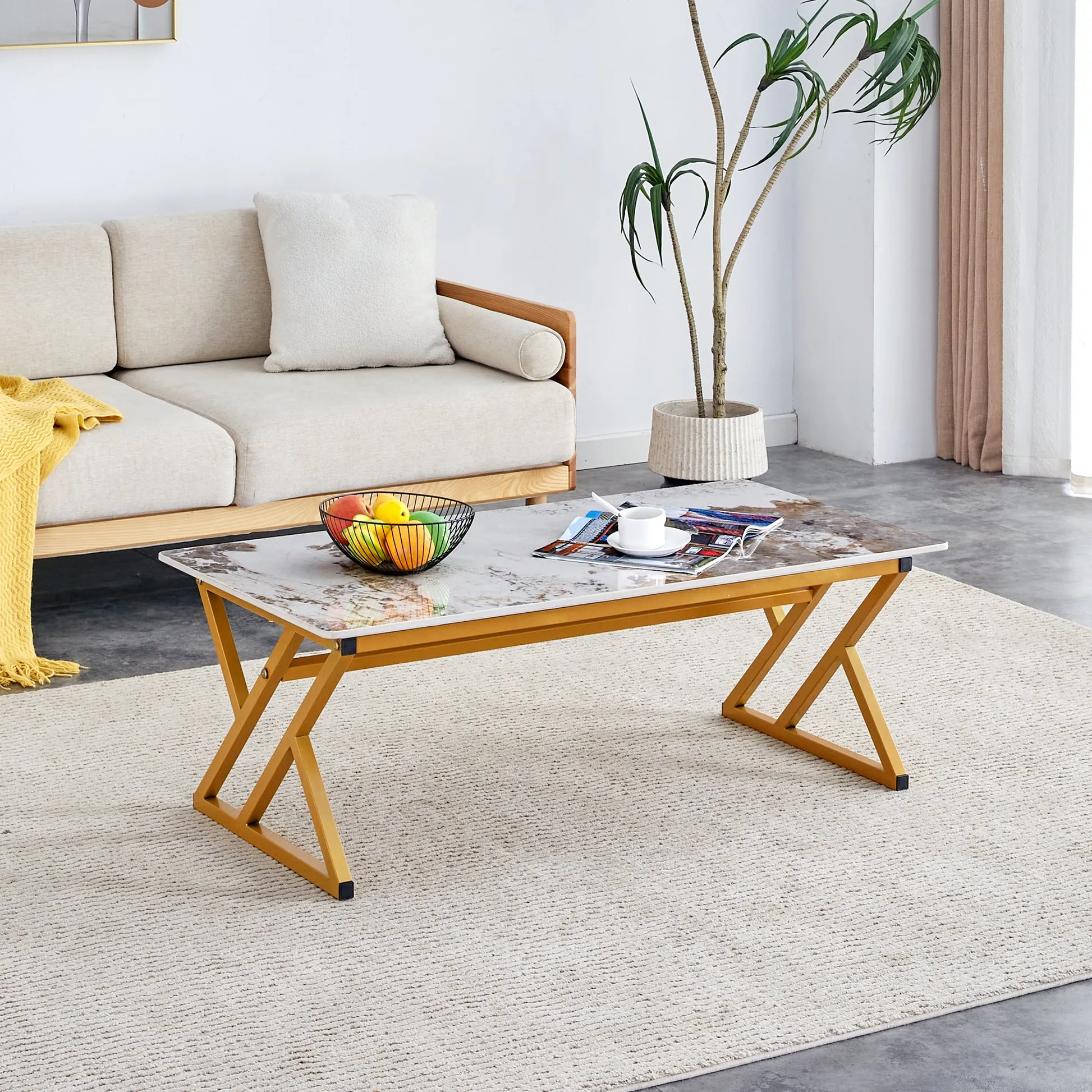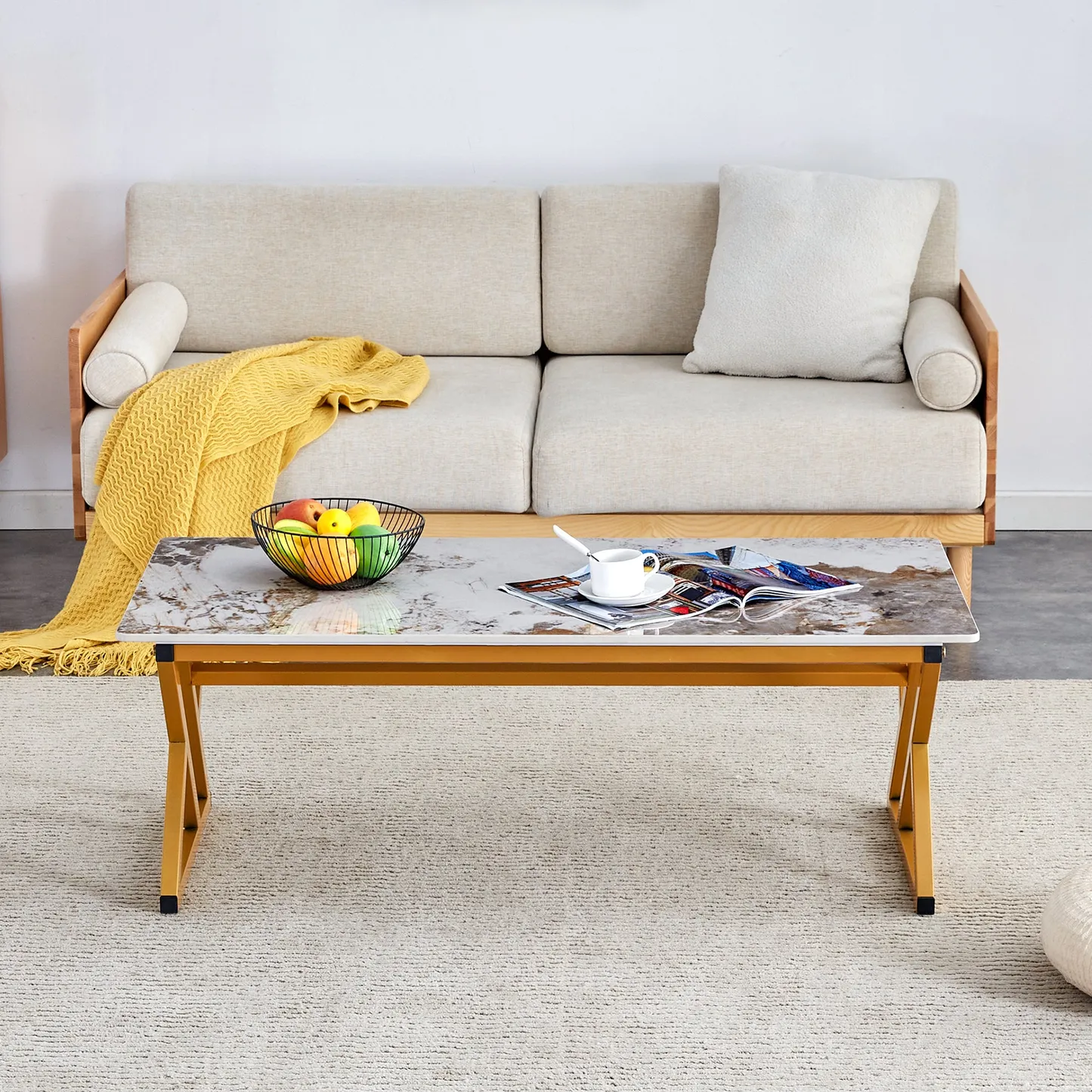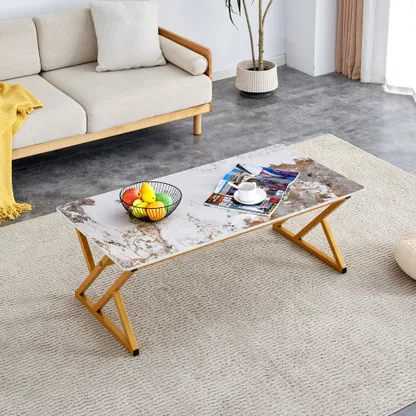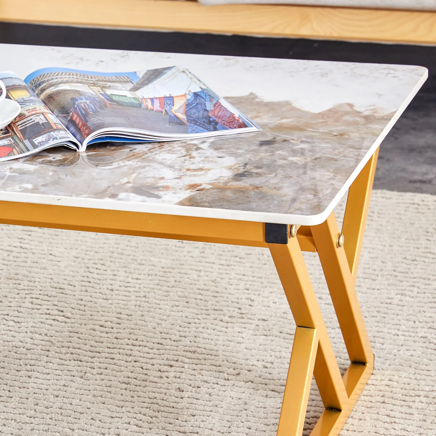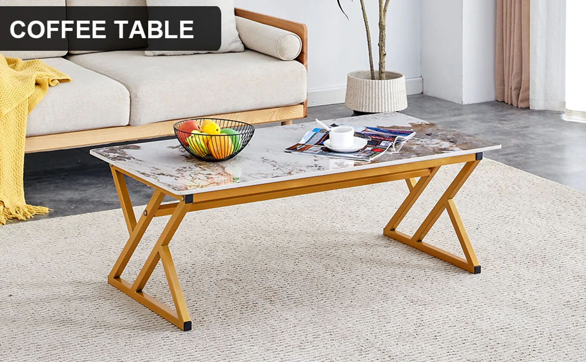 A refined balance of luxury and minimalism. The Alora Coffee Table pairs a natural marble-effect stone top with a golden metal base to create an elegant centerpiece for modern living spaces.