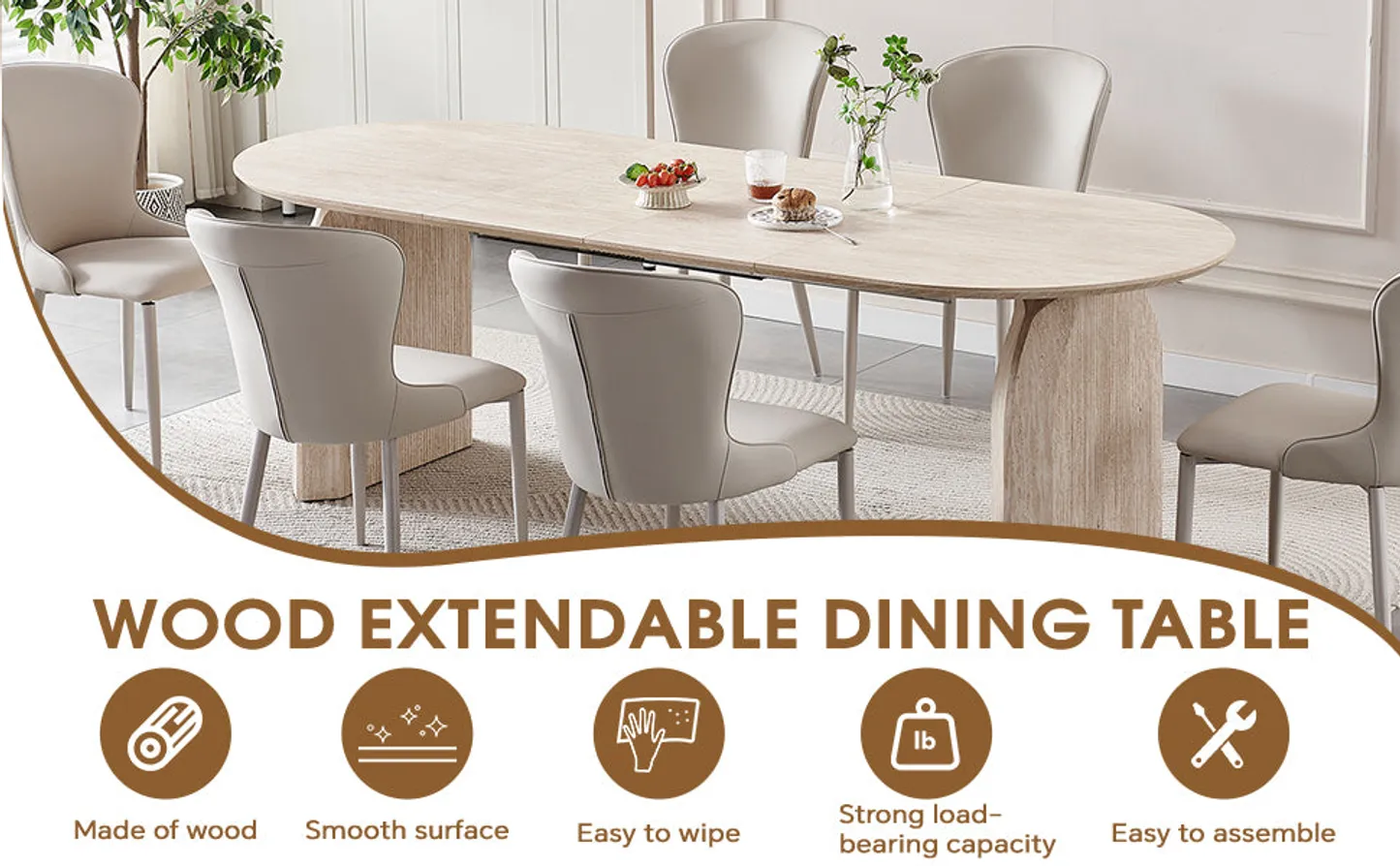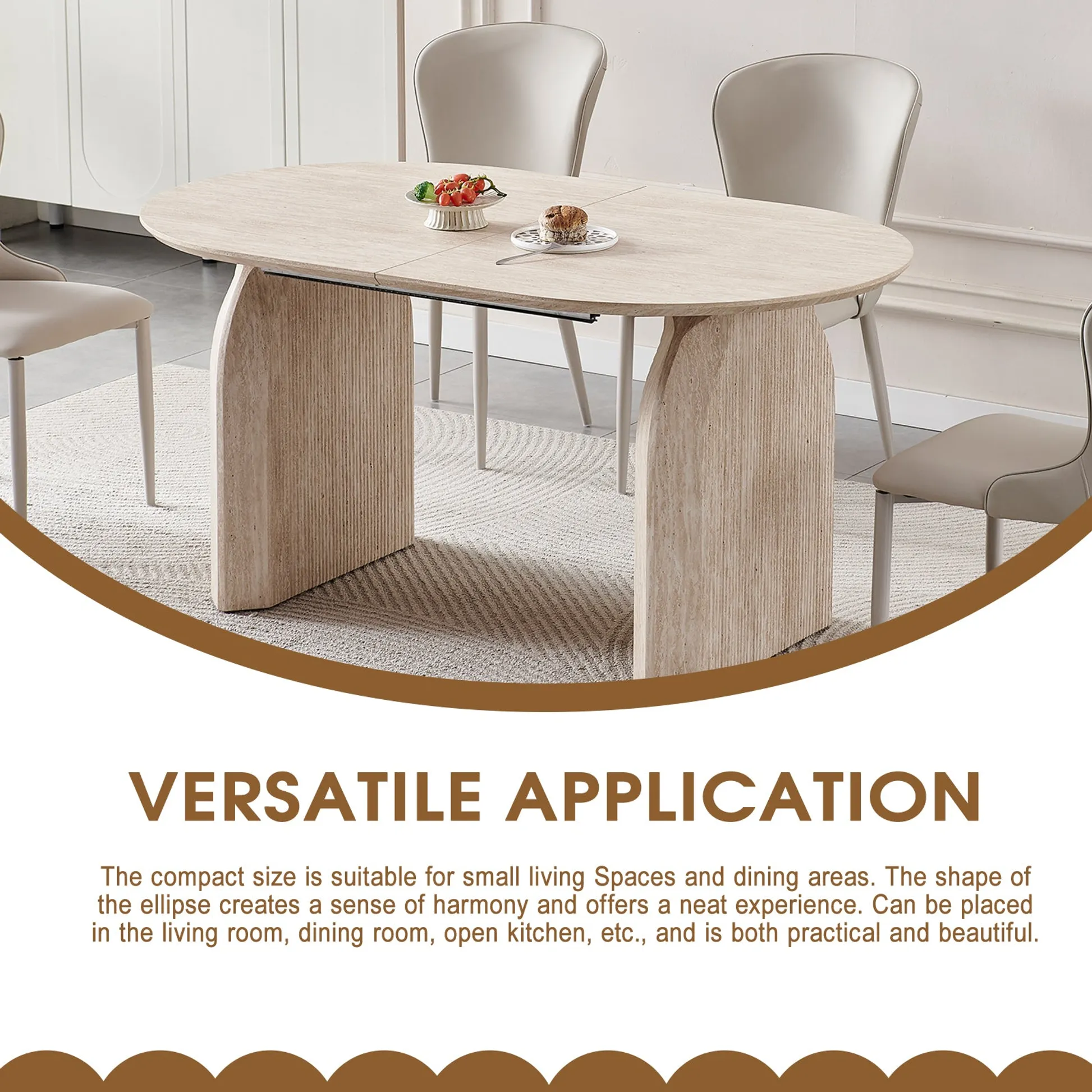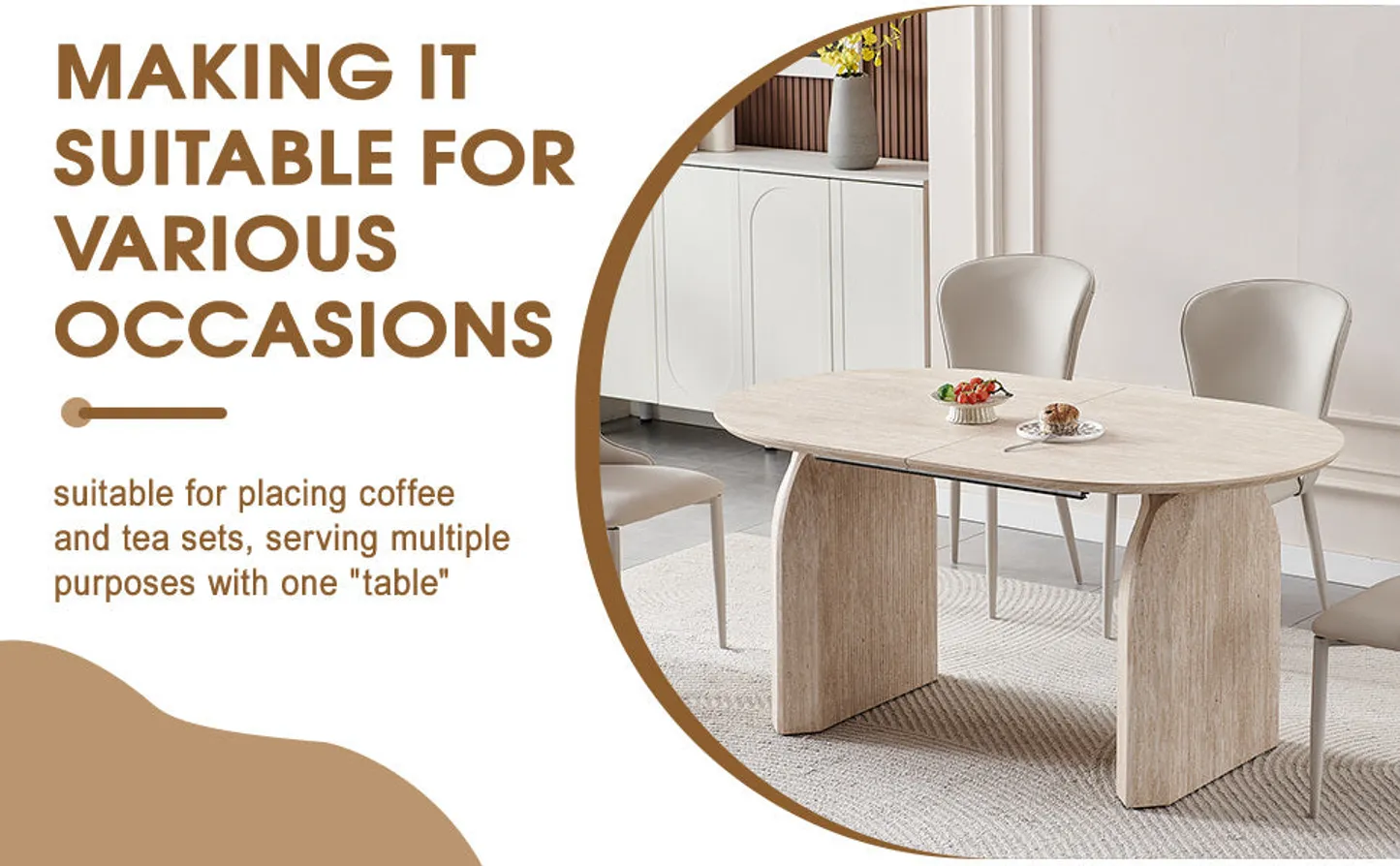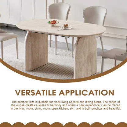 It adopts a classic oval desktop design. The smooth arc lines break the stereotype of traditional furniture and are suitable for modern and simple home styles. The double-column table legs are constructed with a neat geometric shape for support, integrating an artistic sense into the structure. Placed in the space, they infuse the living room and dining room with a dynamic and artistic atmosphere.Selected MDF and wood, with meticulous craftsmanship, it presents a natural and original texture. Durable, with strong load-bearing capacity, it provides reliable support and can stand the test of time.The spacious oval desktop can be adjusted in size according to needs, making it suitable for various occasions.It can also be used as a temporary workbench during office work, carrying computers and files. a