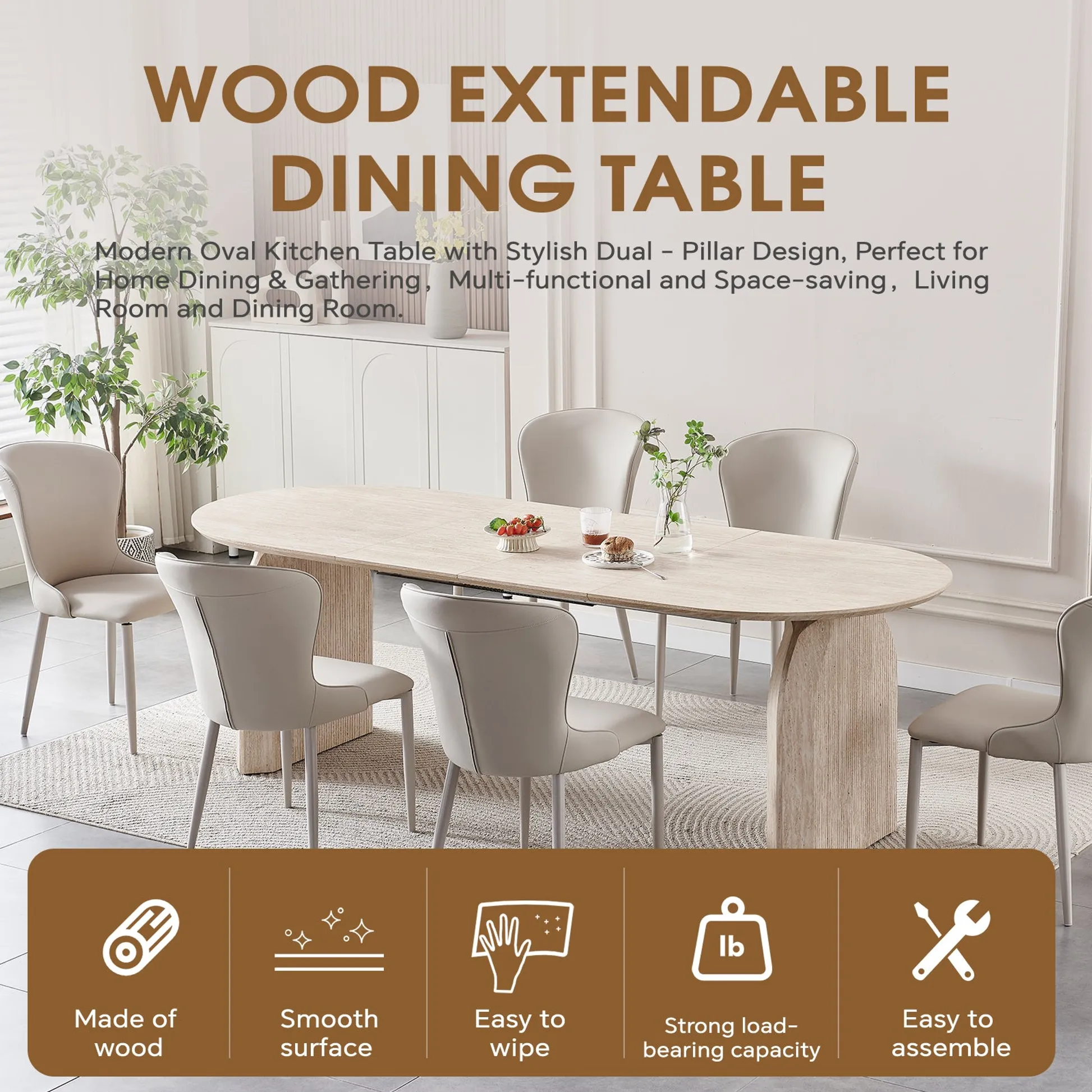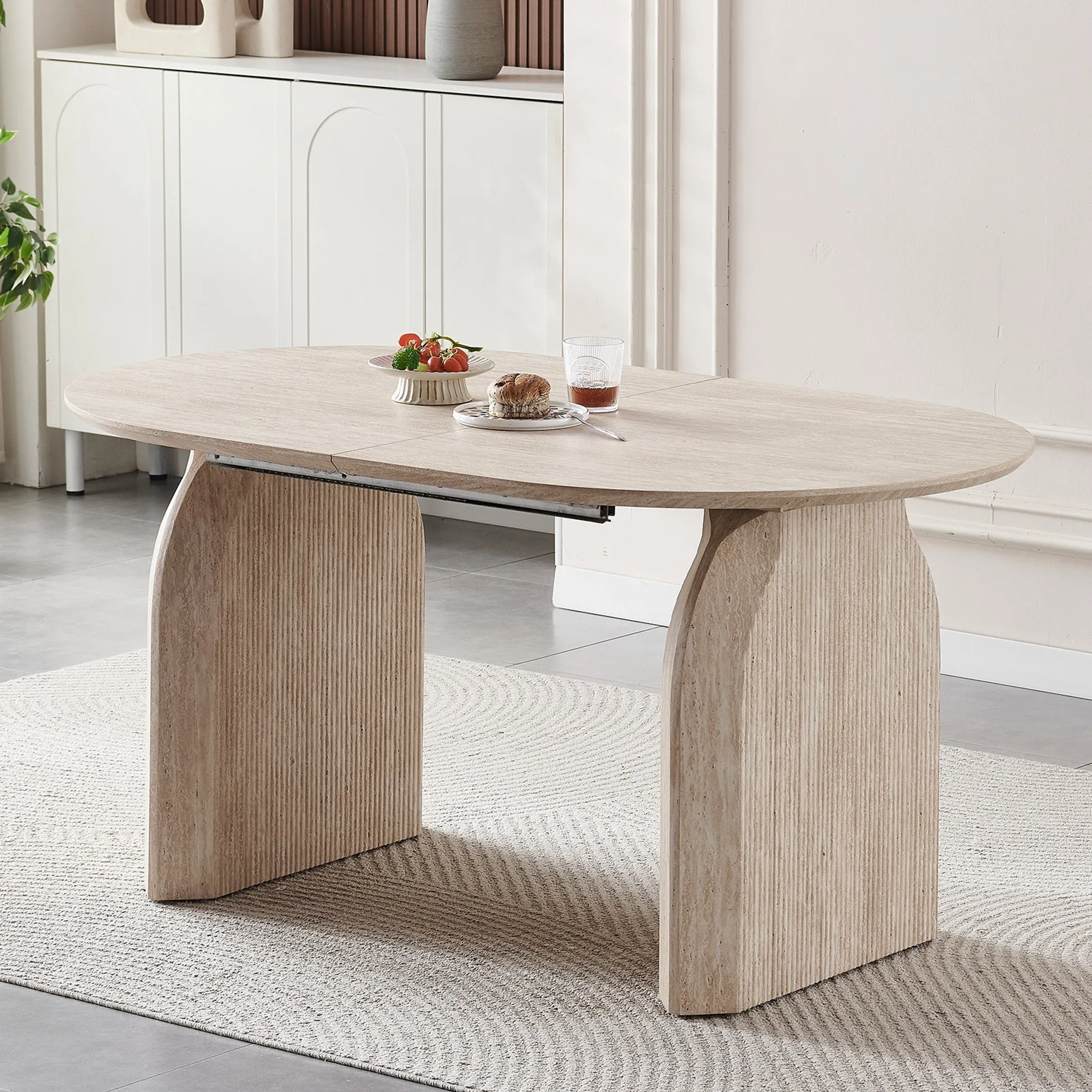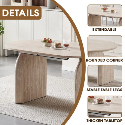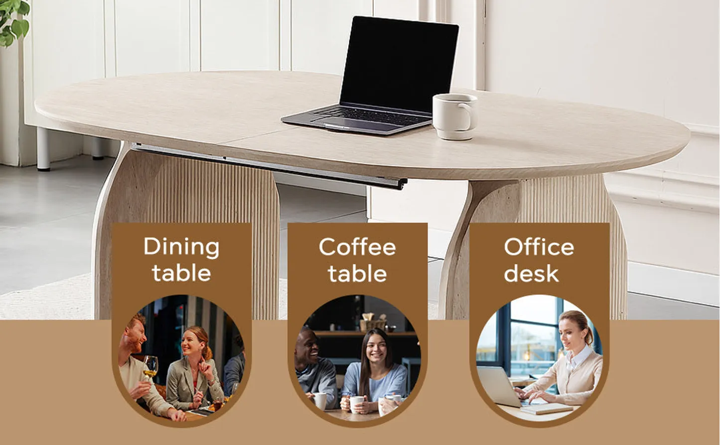 It adopts a classic oval desktop design. The smooth arc lines break the stereotype of traditional furniture and are suitable for modern and simple home styles. The double-column table legs are constructed with a neat geometric shape for support, integrating an artistic sense into the structure. Placed in the space, they infuse the living room and dining room with a dynamic and artistic atmosphere.Selected MDF and wood, with meticulous craftsmanship, it presents a natural and original texture. Durable, with strong load-bearing capacity, it provides reliable support and can stand the test of time.The spacious oval desktop can be adjusted in size according to needs, making it suitable for various occasions.It can also be used as a temporary workbench during office work, carrying computers and files. a