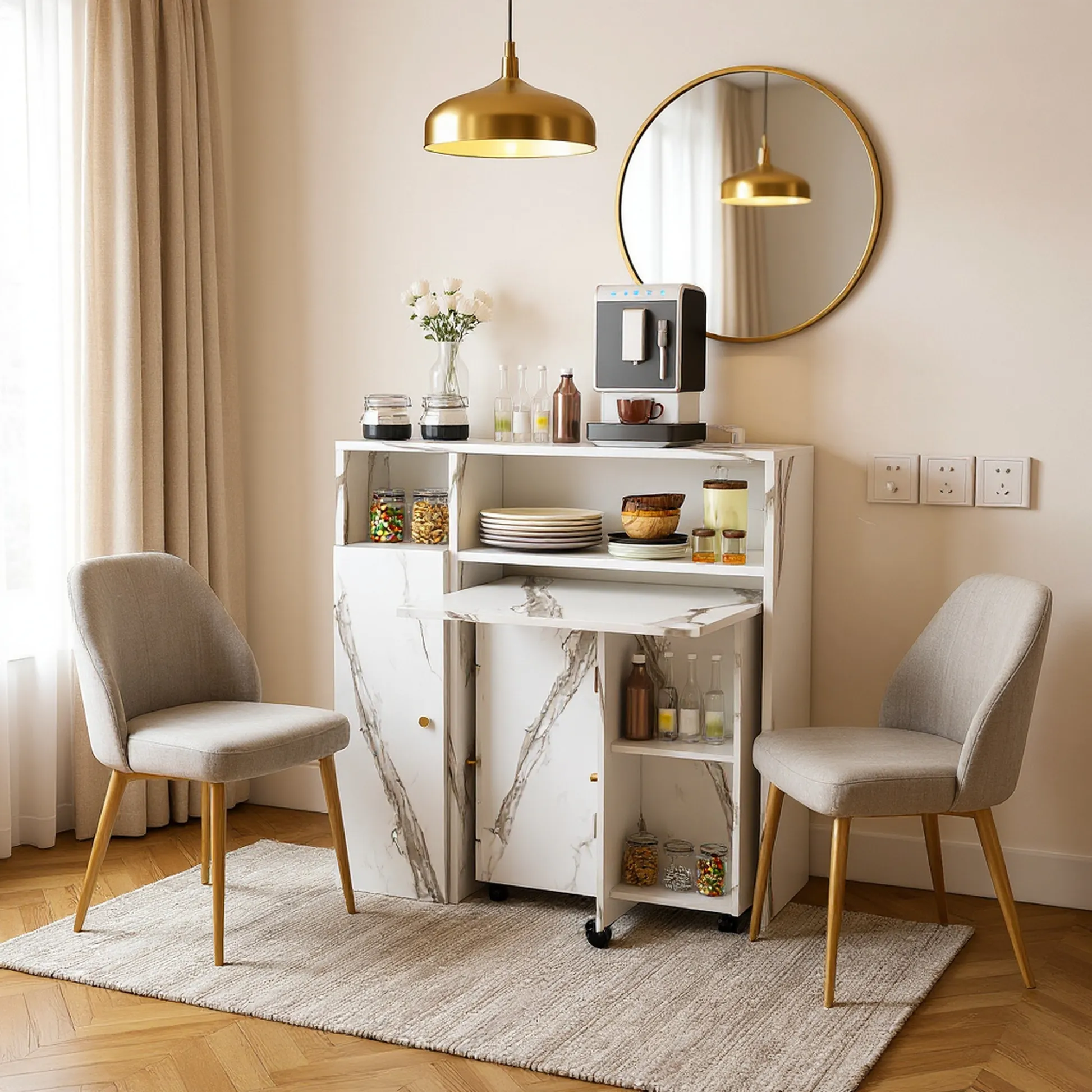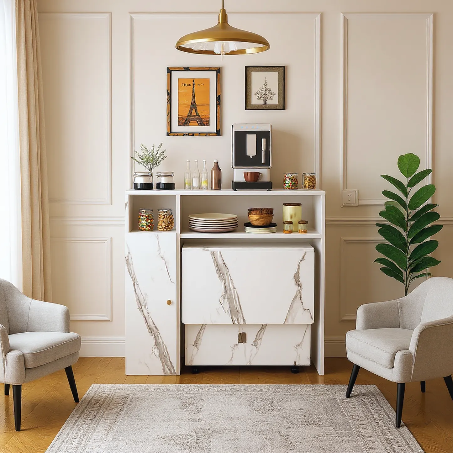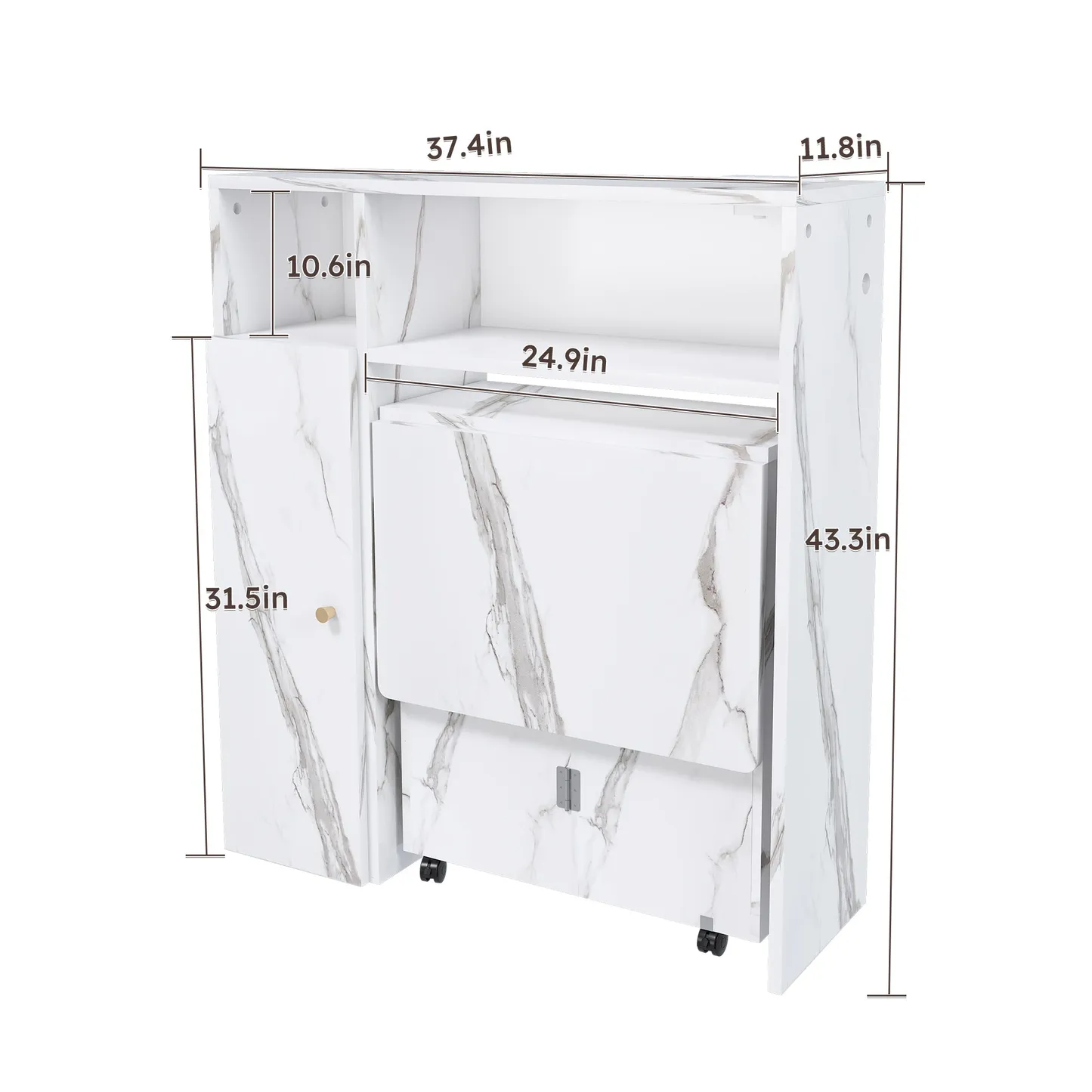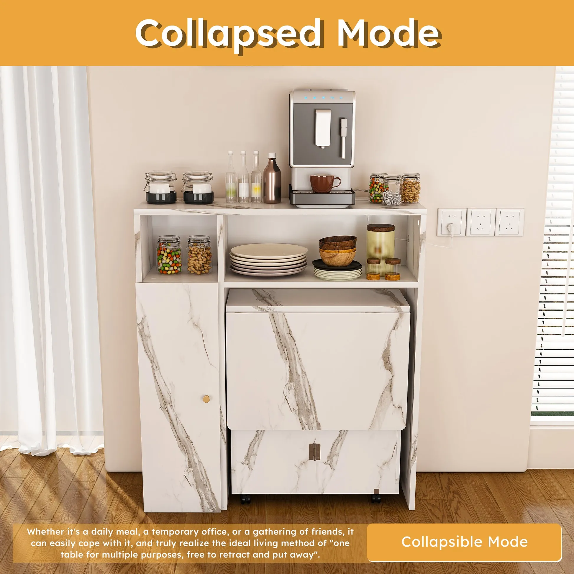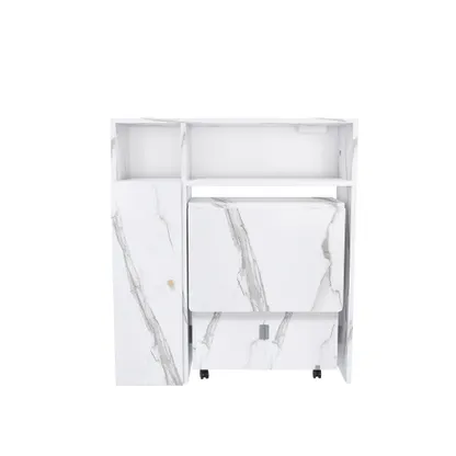 The Agus Folding Dining Table with Wall-Mounted Sideboard features a white marble finish, space-saving foldable design, and integrated storage, making it ideal for small apartments and multifunctional living spaces.