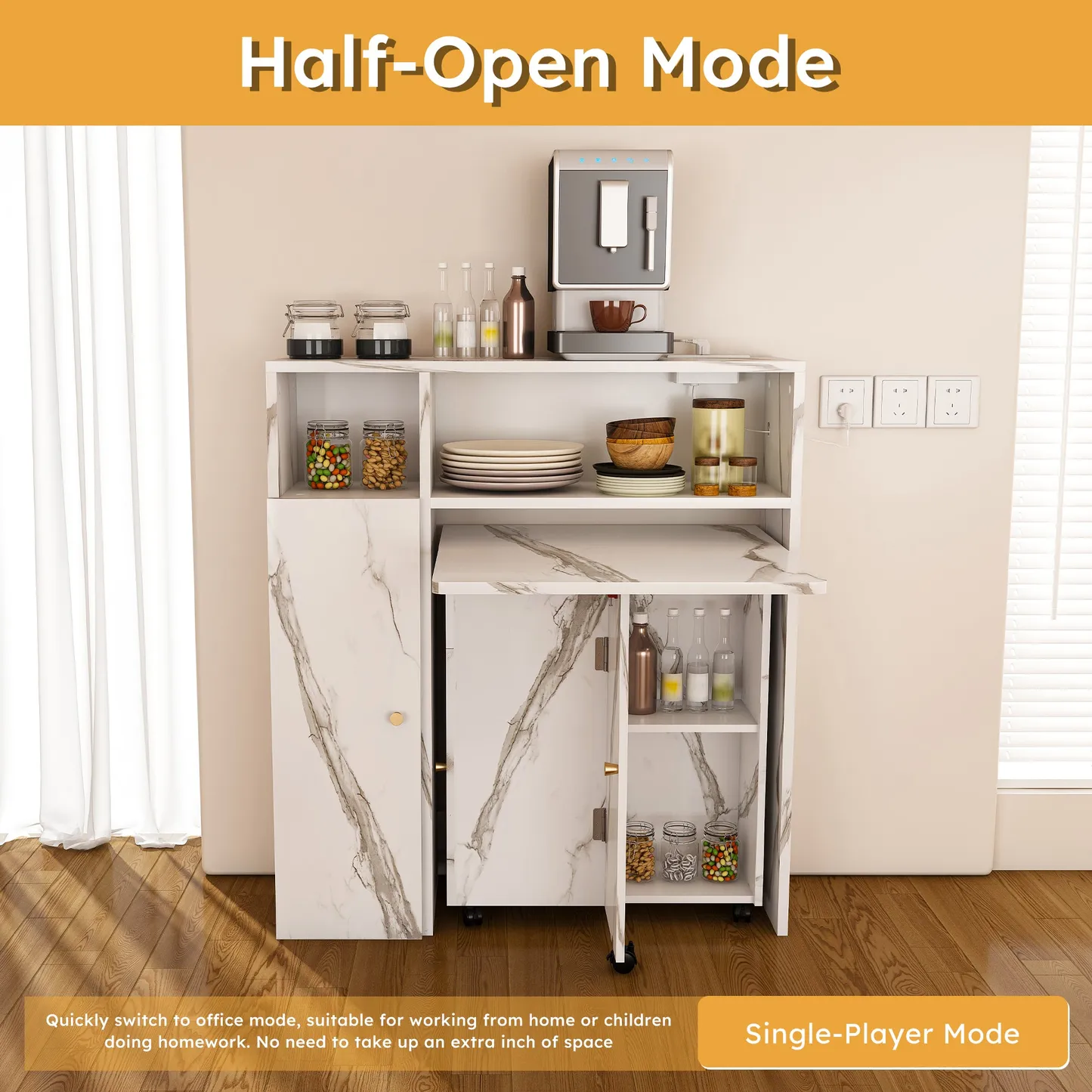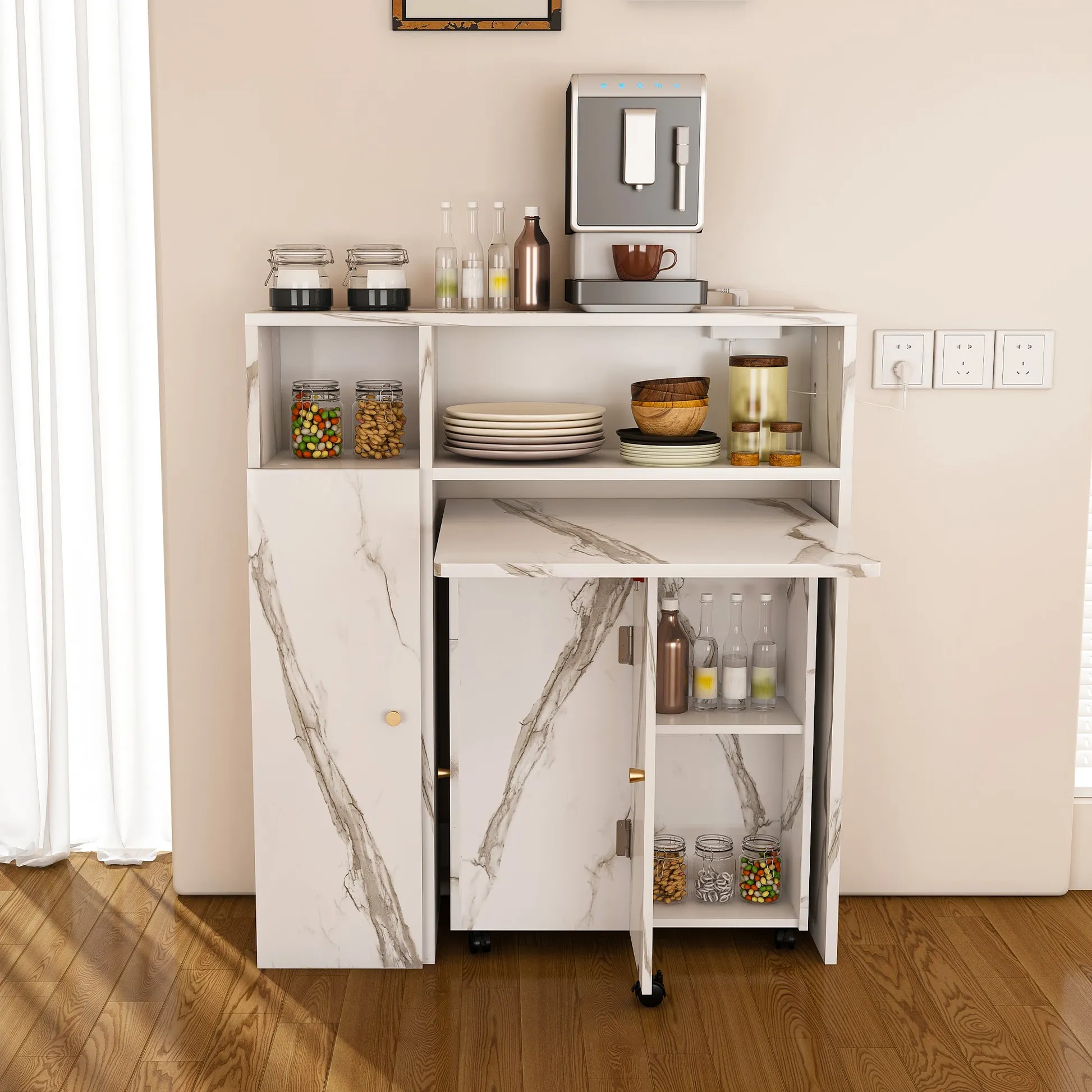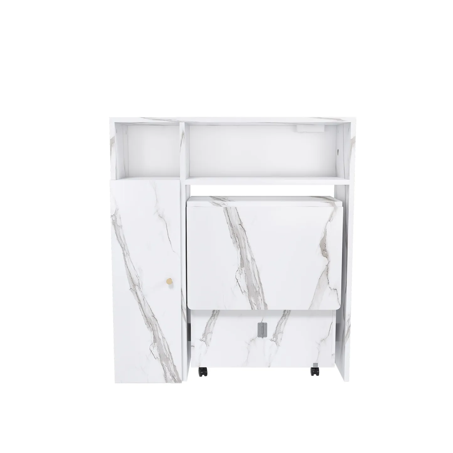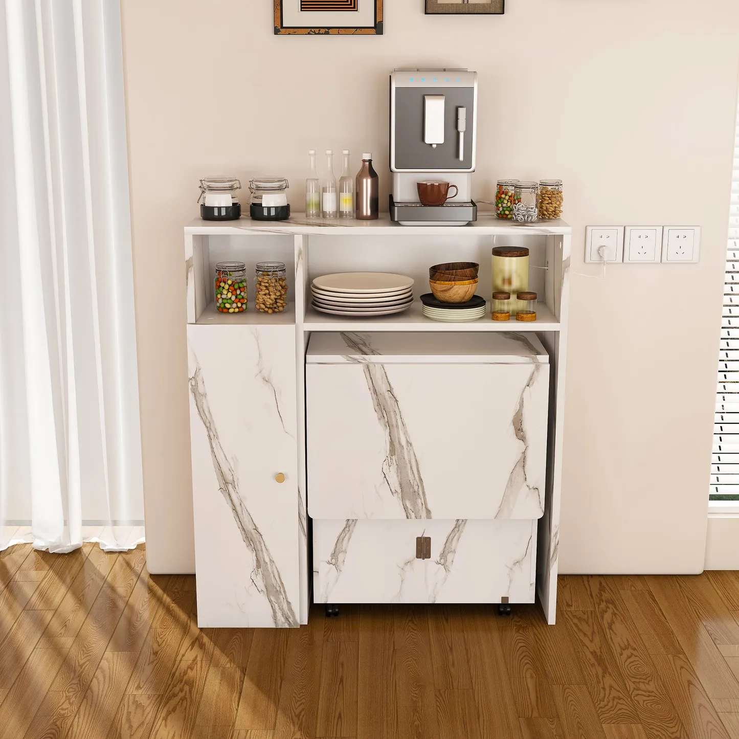 The Agus Folding Dining Table with Wall-Mounted Sideboard features a white marble finish, space-saving foldable design, and integrated storage, making it ideal for small apartments and multifunctional living spaces.