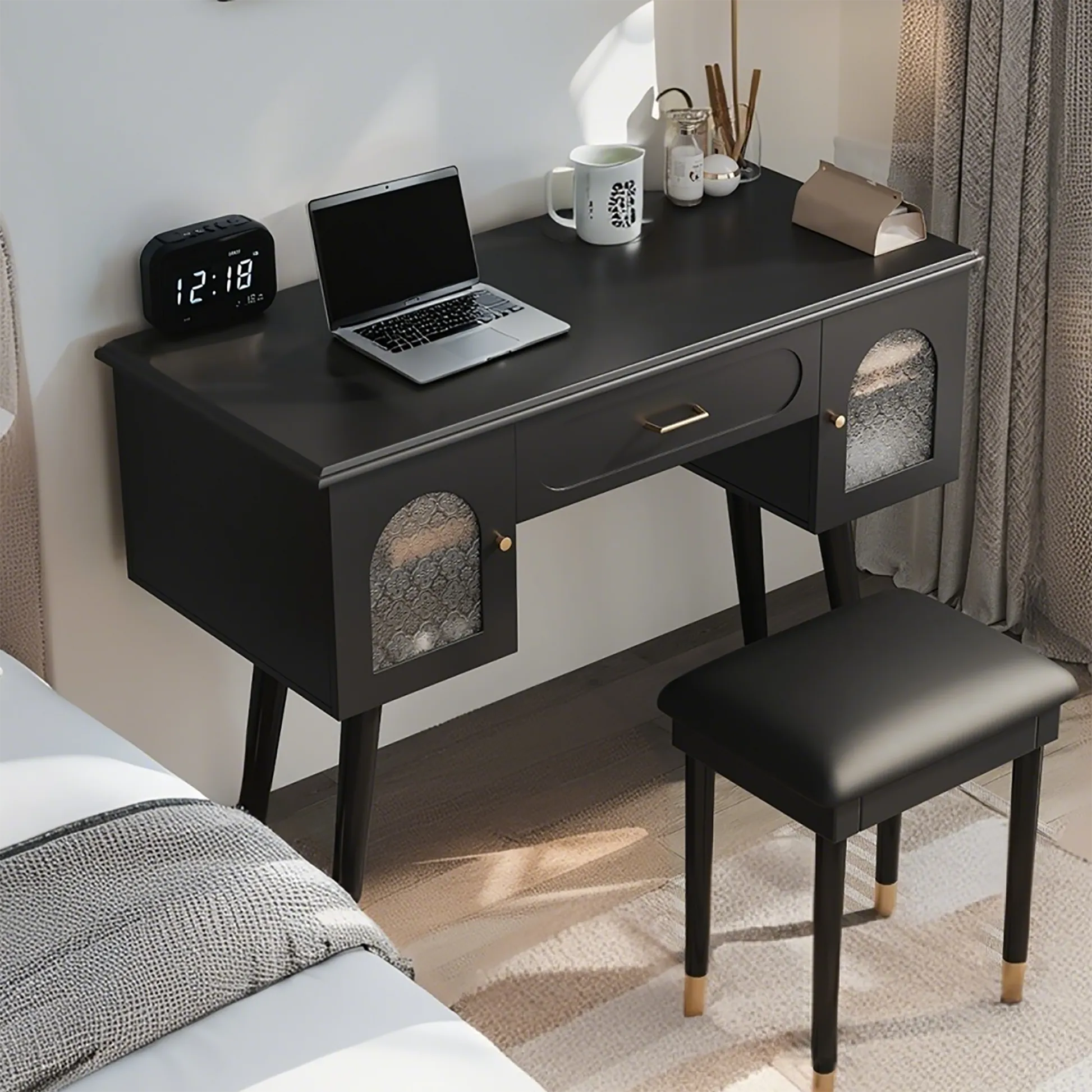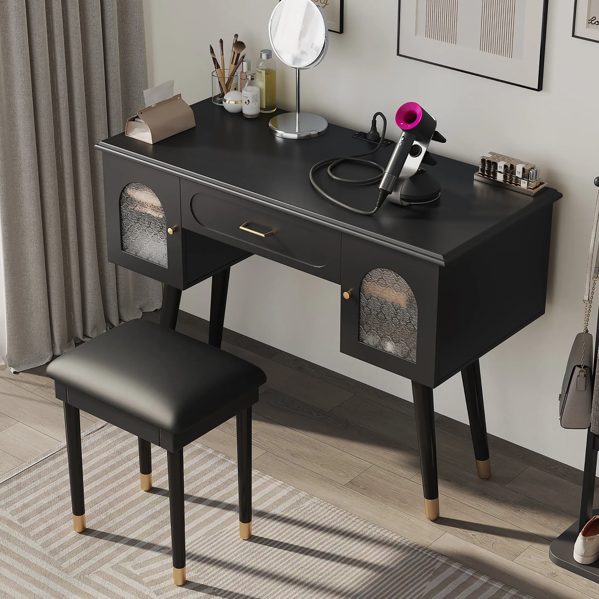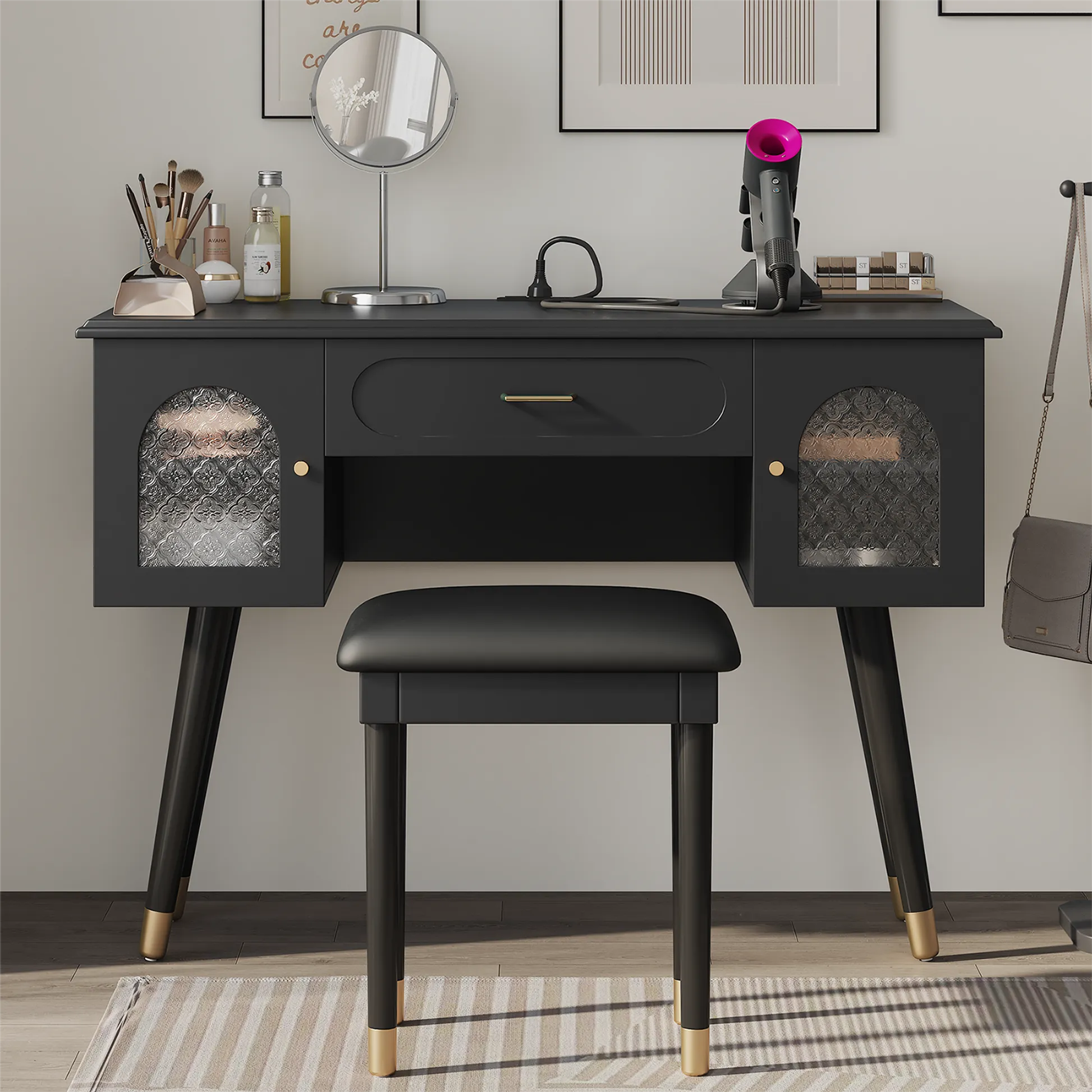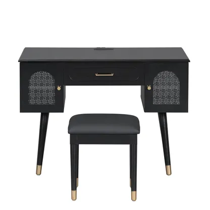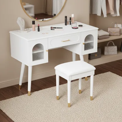 Modern vanity table and stool set with integrated charging station, carved glass doors, and plush seating. Available in black or white, Amara brings elegant storage and smart power to your bedroom or dressing area.