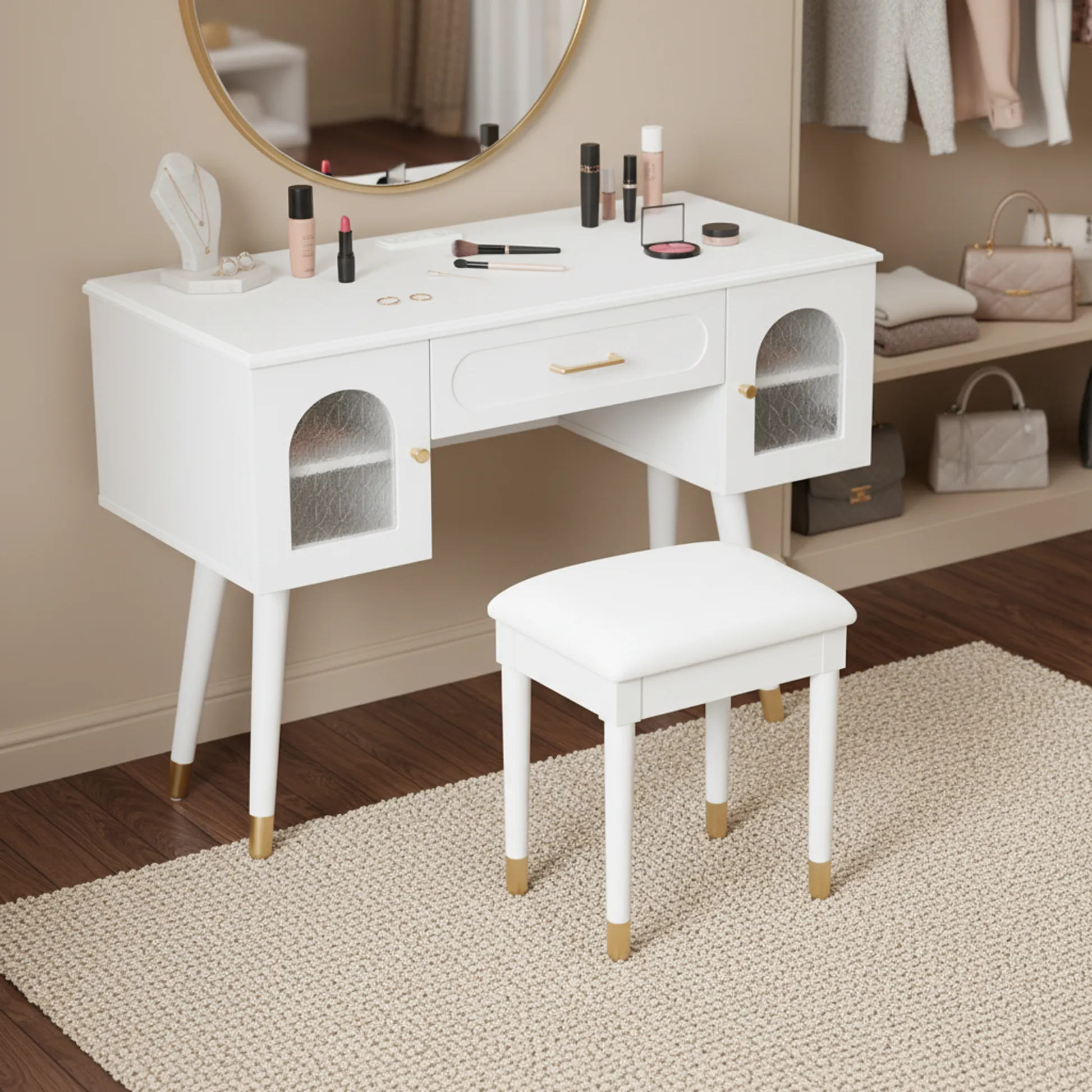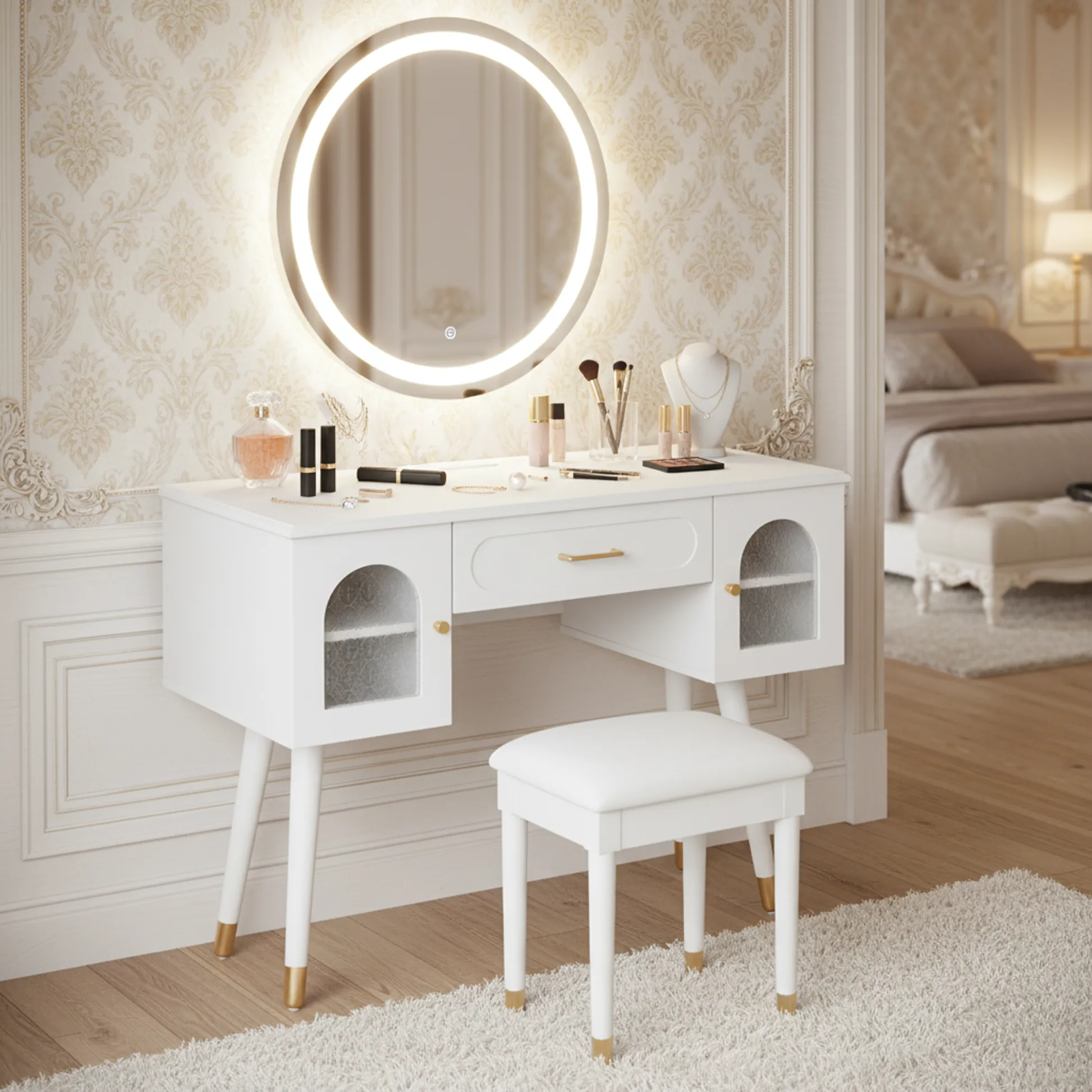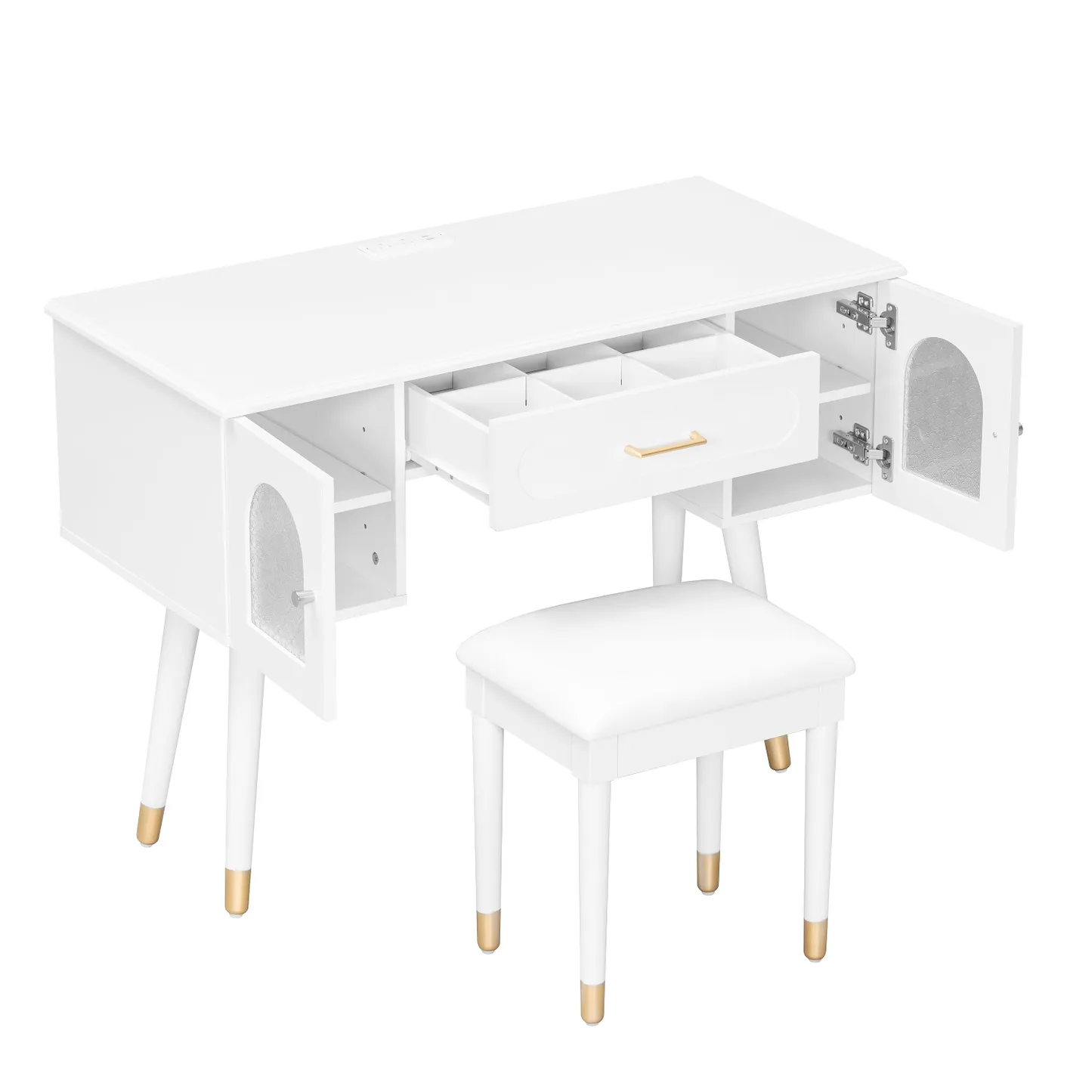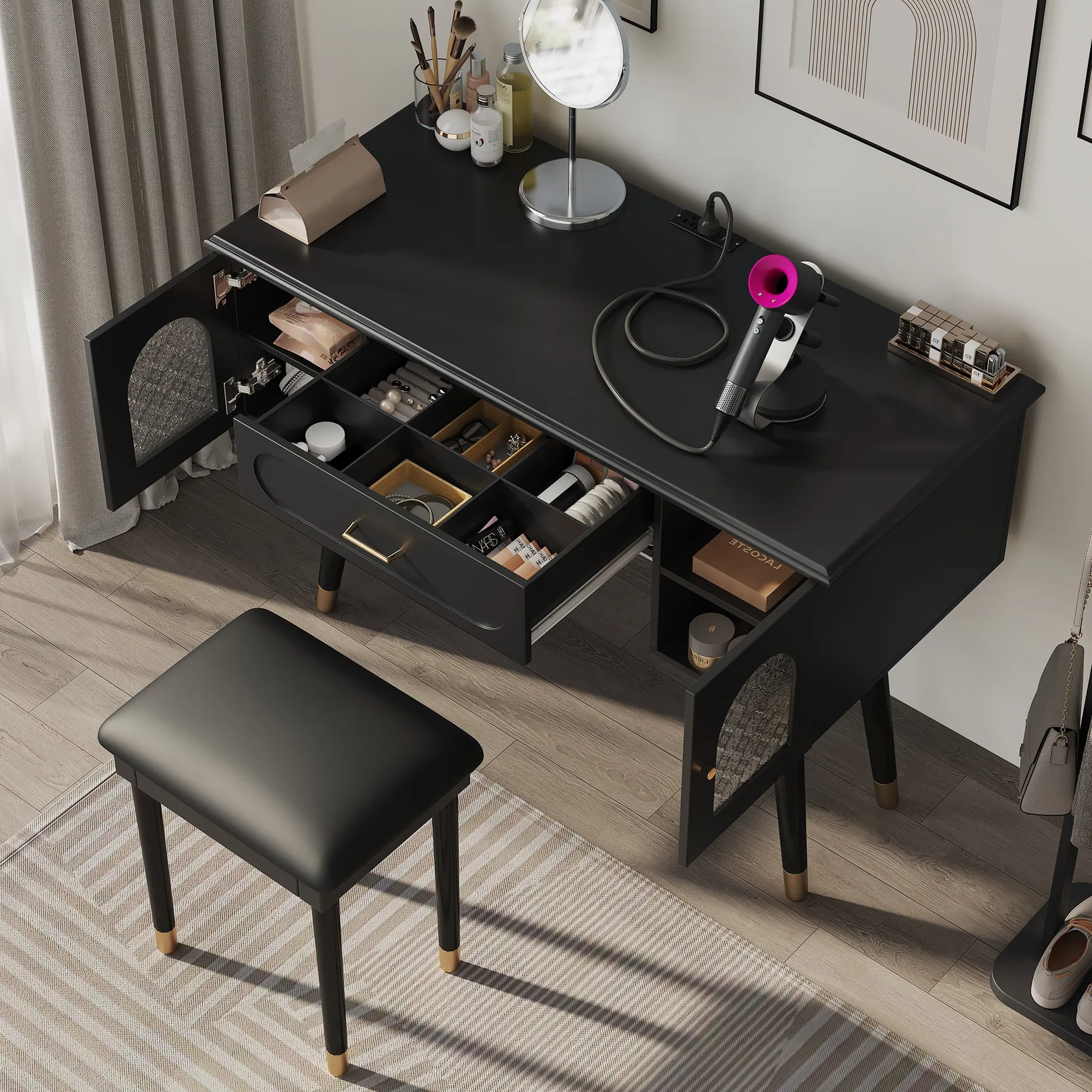 Modern vanity table and stool set with integrated charging station, carved glass doors, and plush seating. Available in black or white, Amara brings elegant storage and smart power to your bedroom or dressing area.