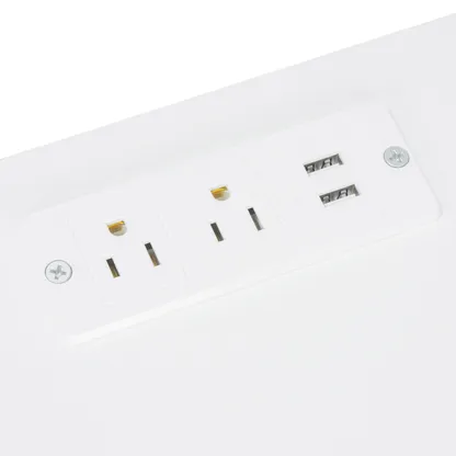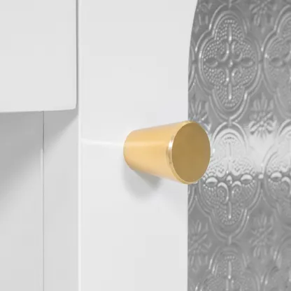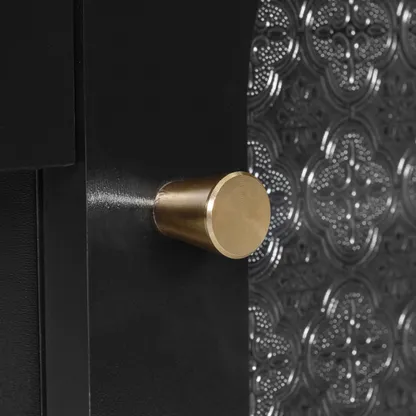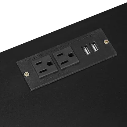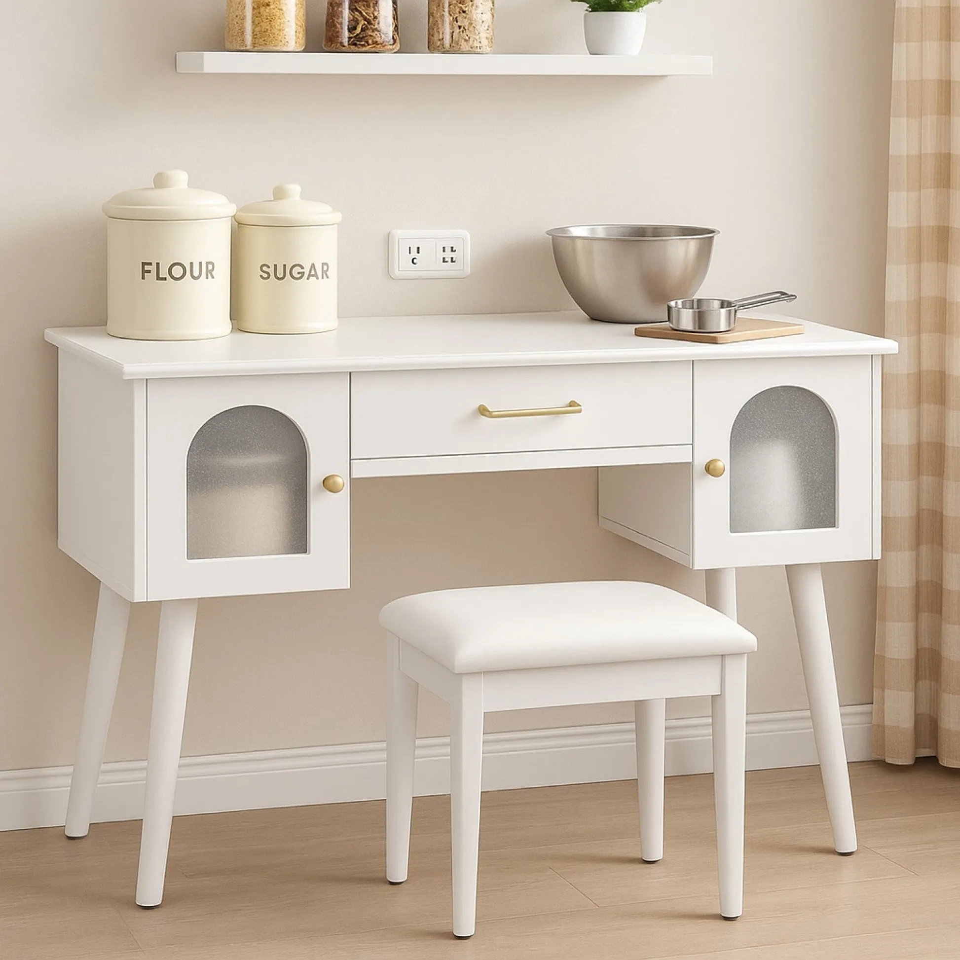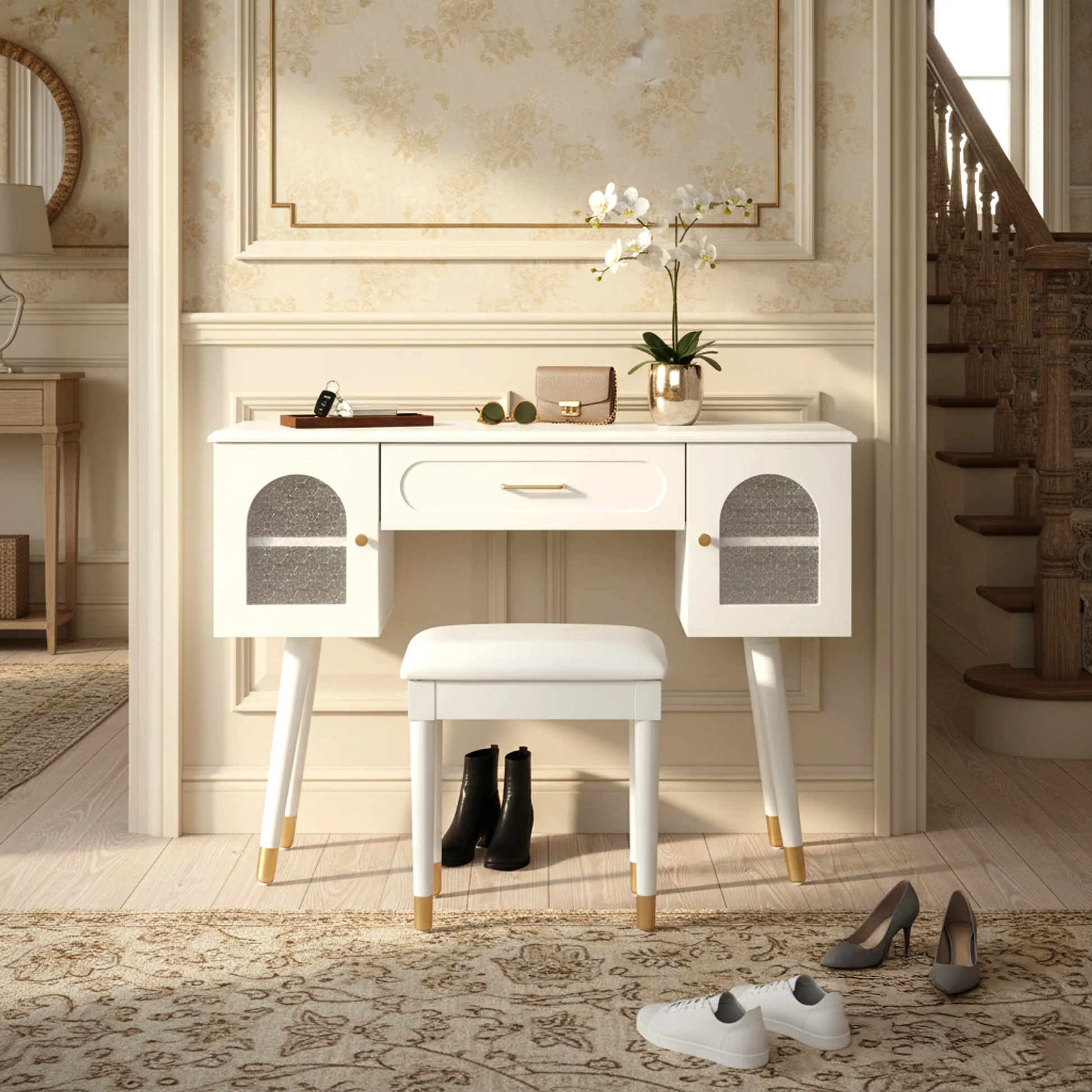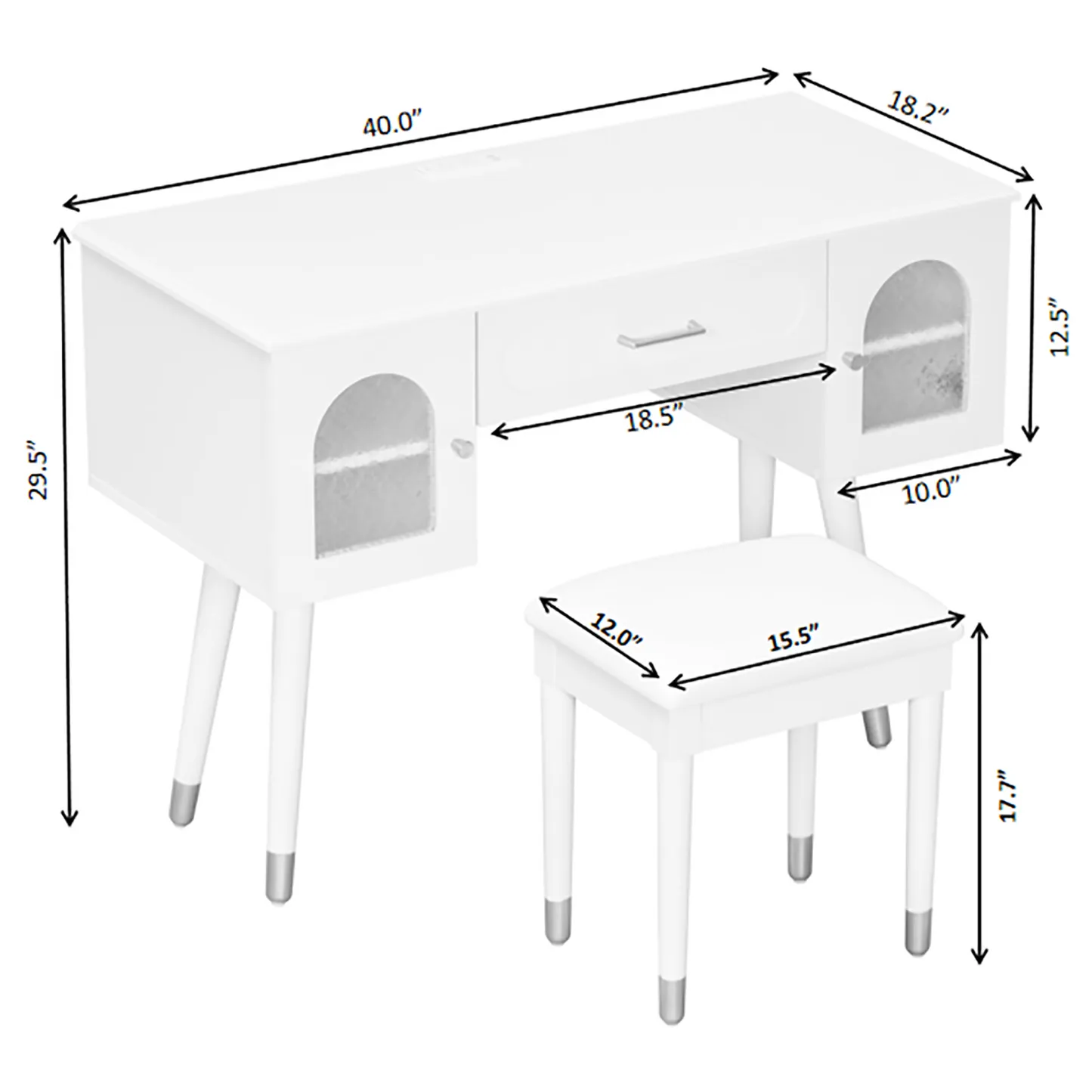 Modern vanity table and stool set with integrated charging station, carved glass doors, and plush seating. Available in black or white, Amara brings elegant storage and smart power to your bedroom or dressing area.