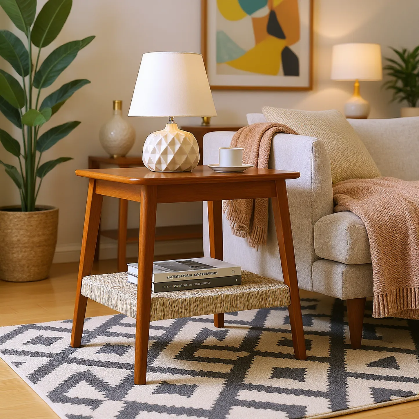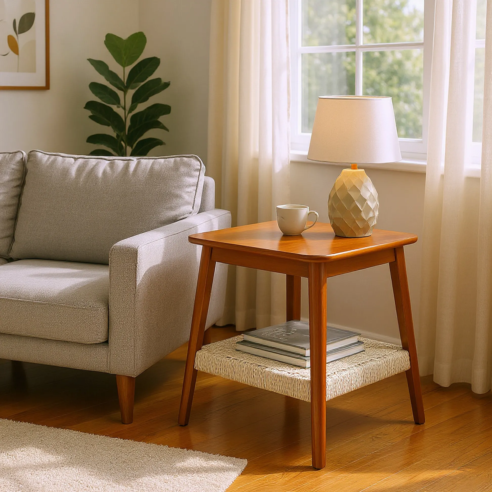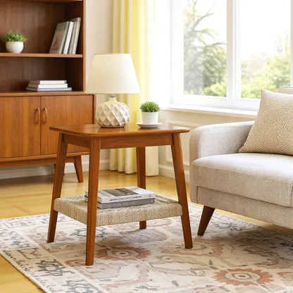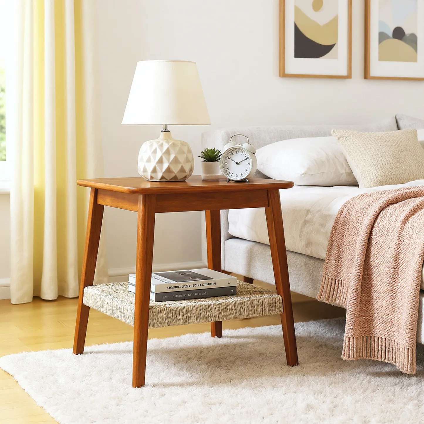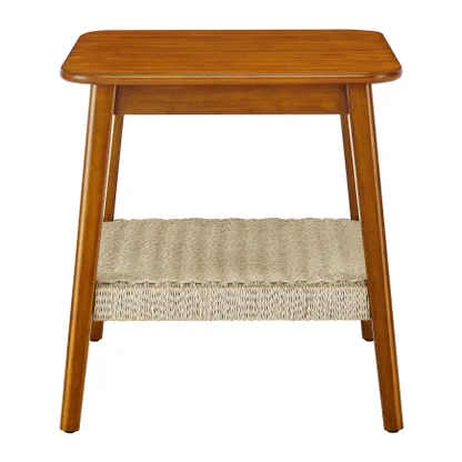 Arles 23" Mid-Century Side Table with woven rattan shelf combines natural craftsmanship with functional storage, perfect for living rooms, bedrooms, or offices.