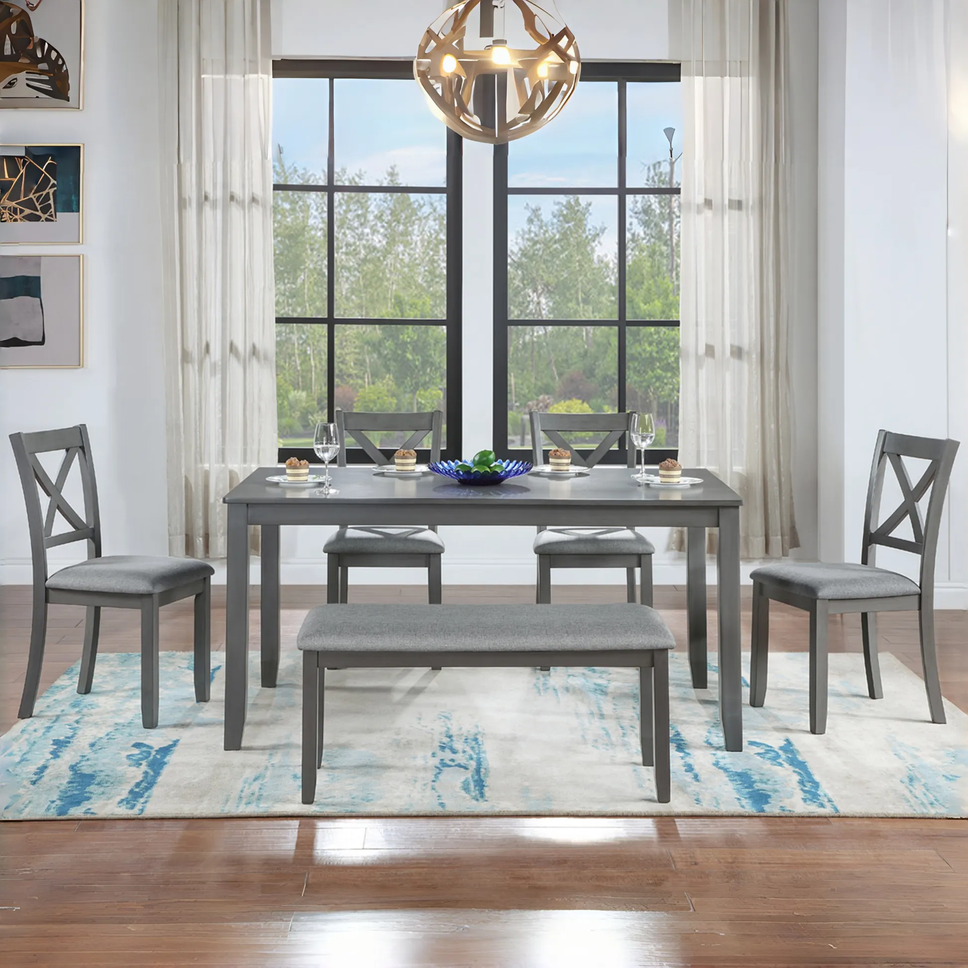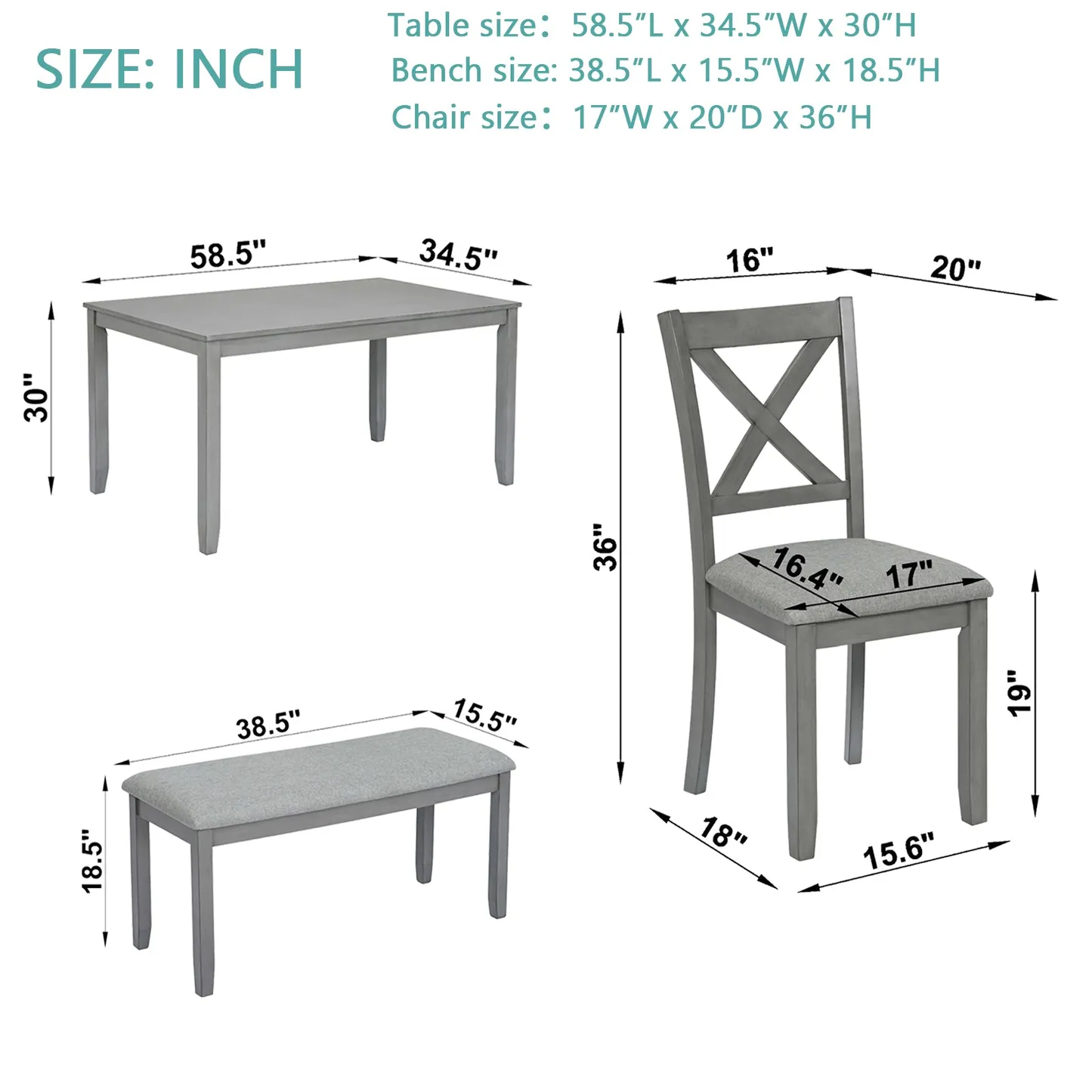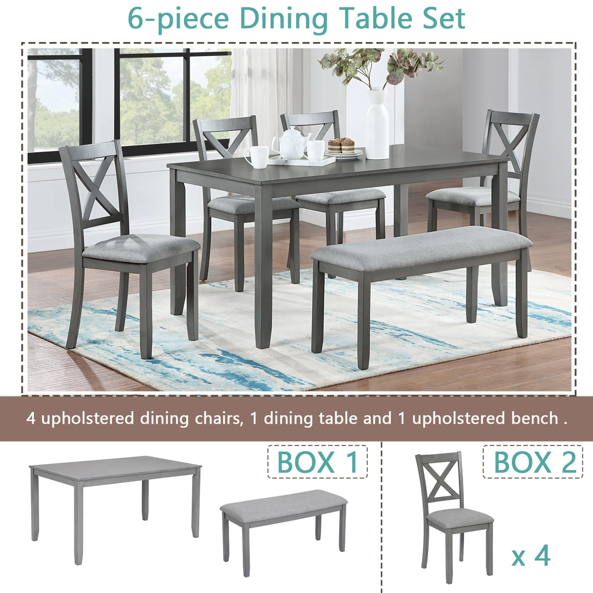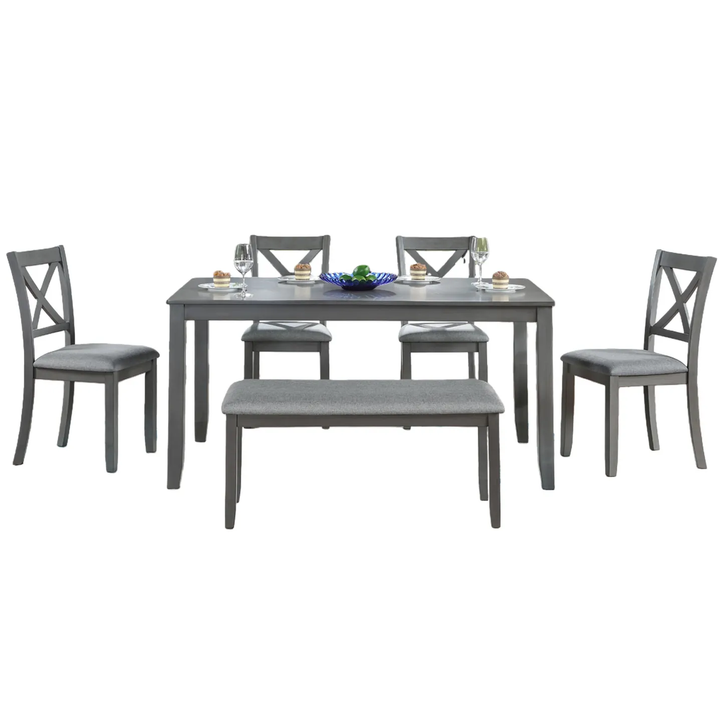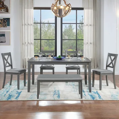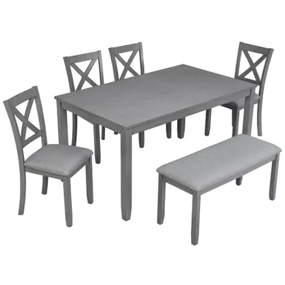 6 Pieces 58.5" Rectangular Dining Table Set with 4 Upholstered Chairs and Bench, Gray