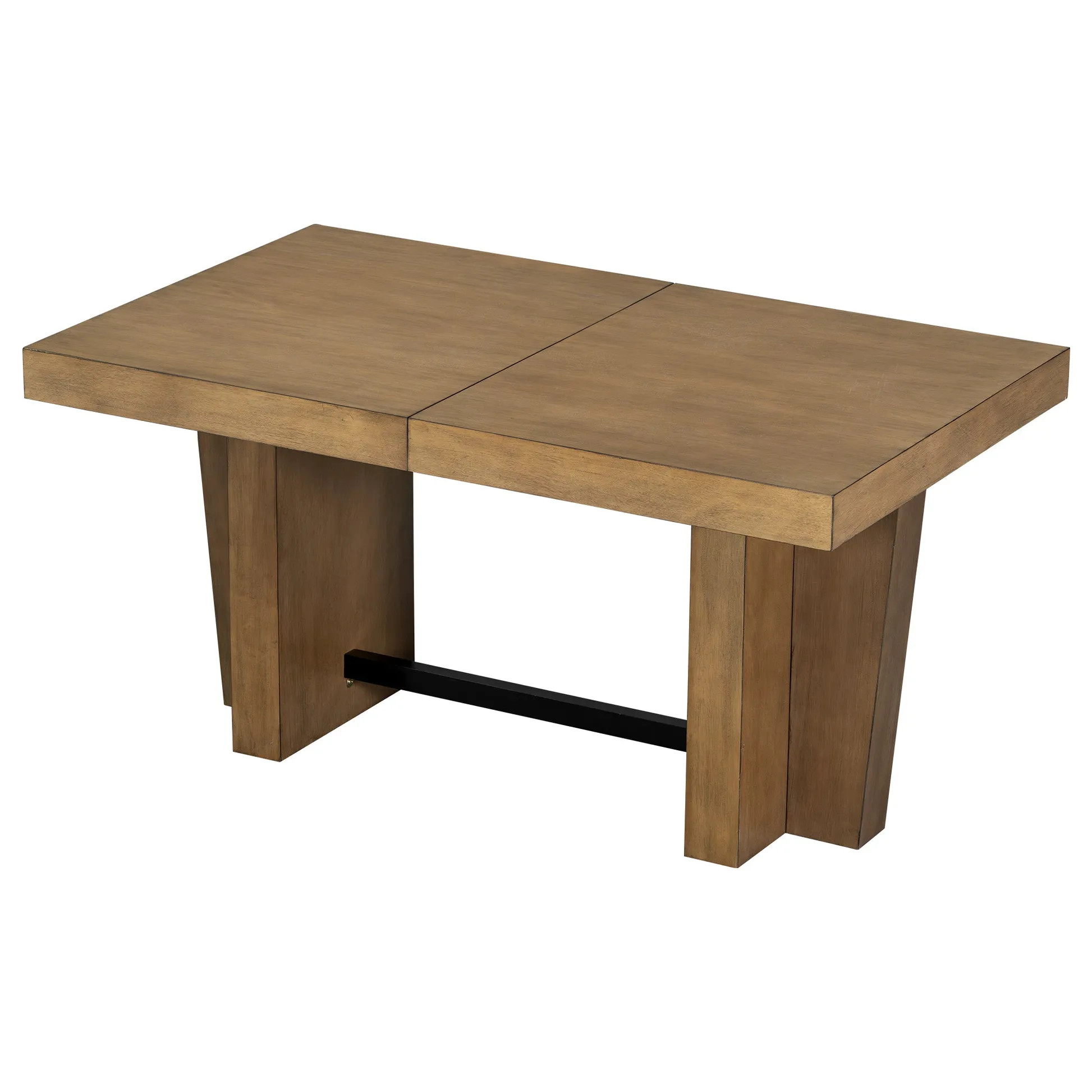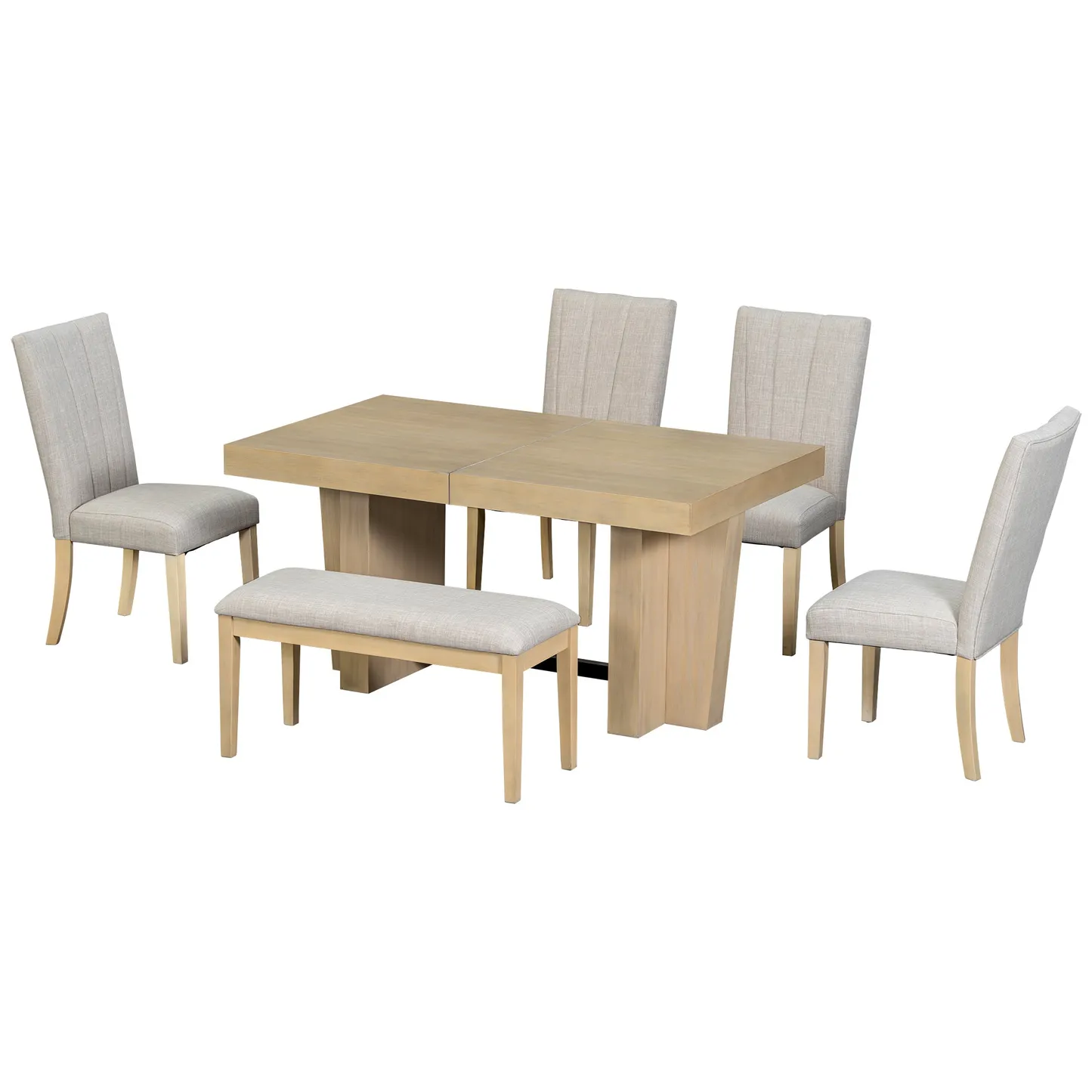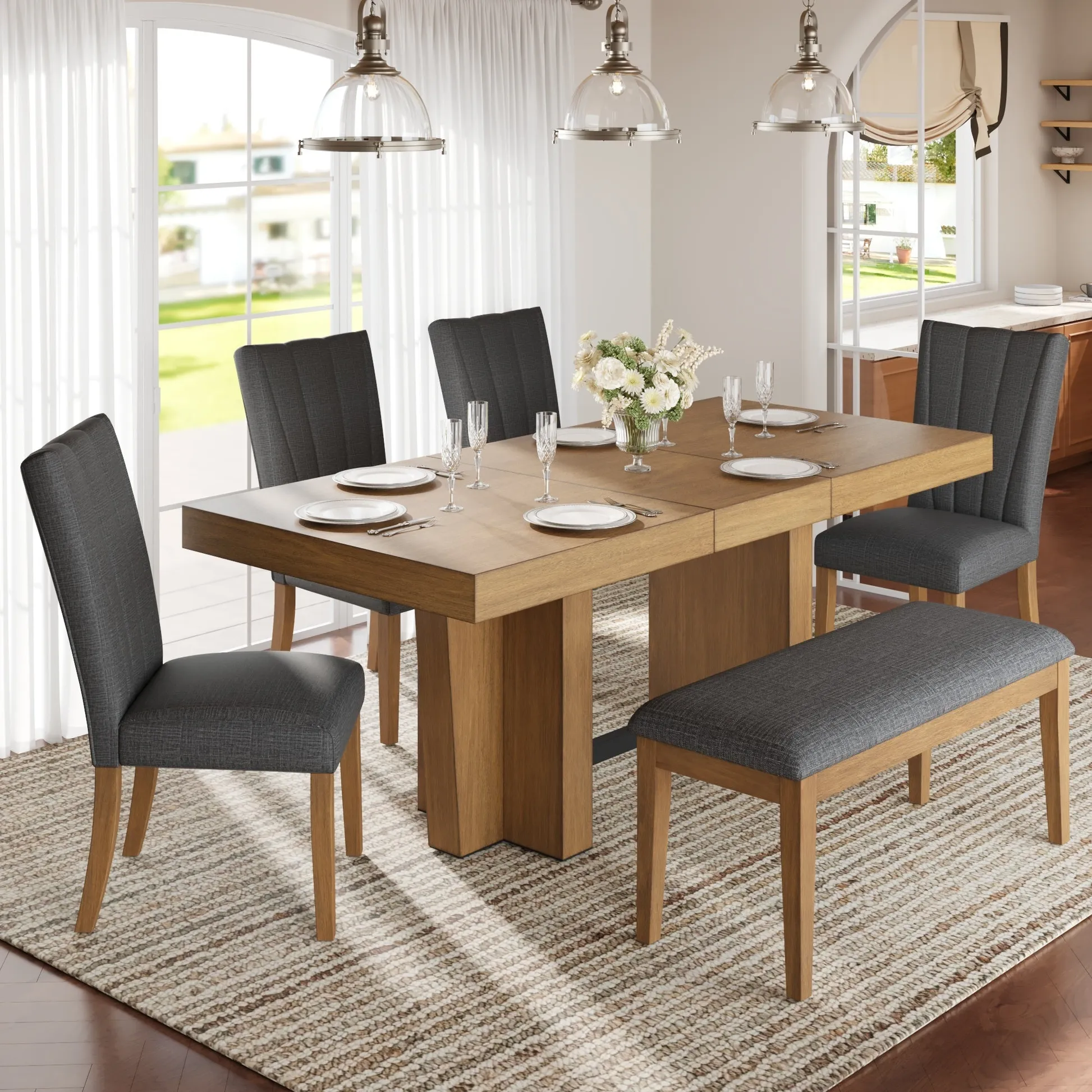 The Batur 6-seat farmhouse dining set combines rustic charm with modern versatility. Featuring an extendable table, upholstered chairs, and a padded bench, it brings warmth and function to every gathering.