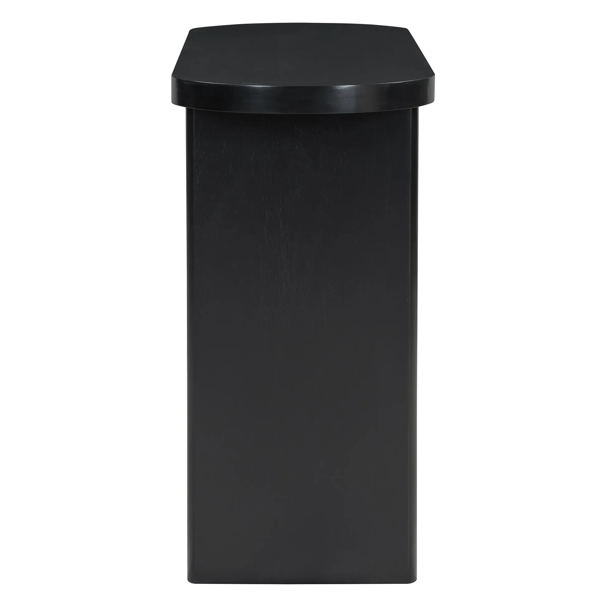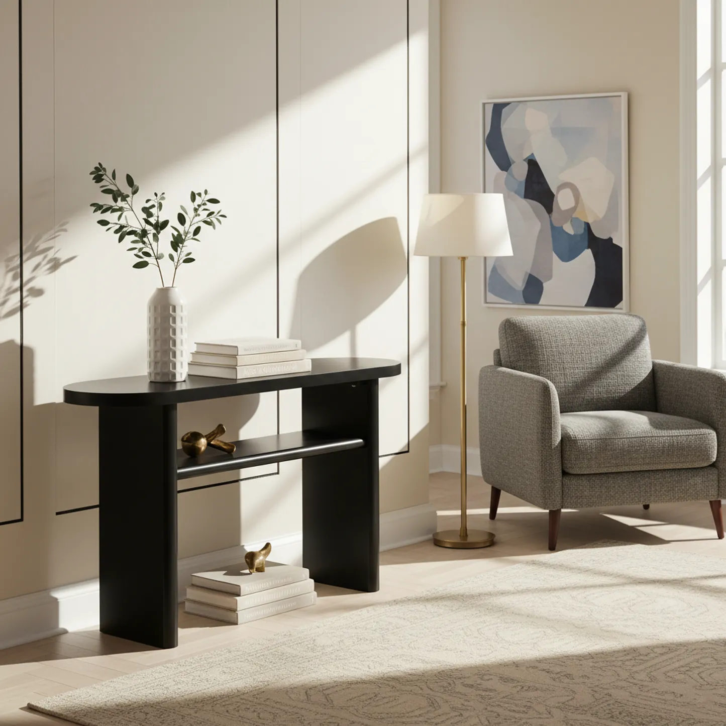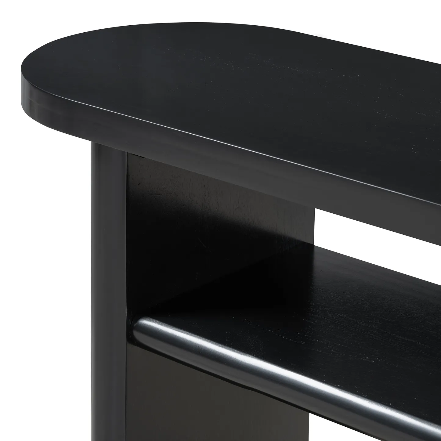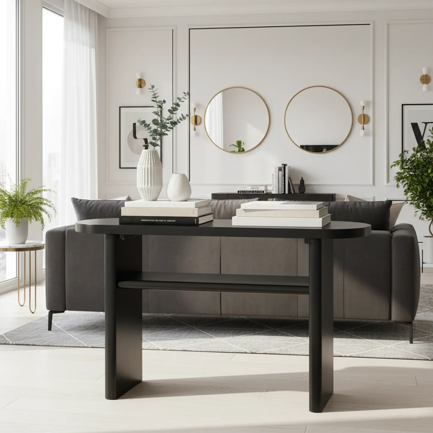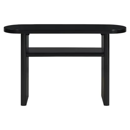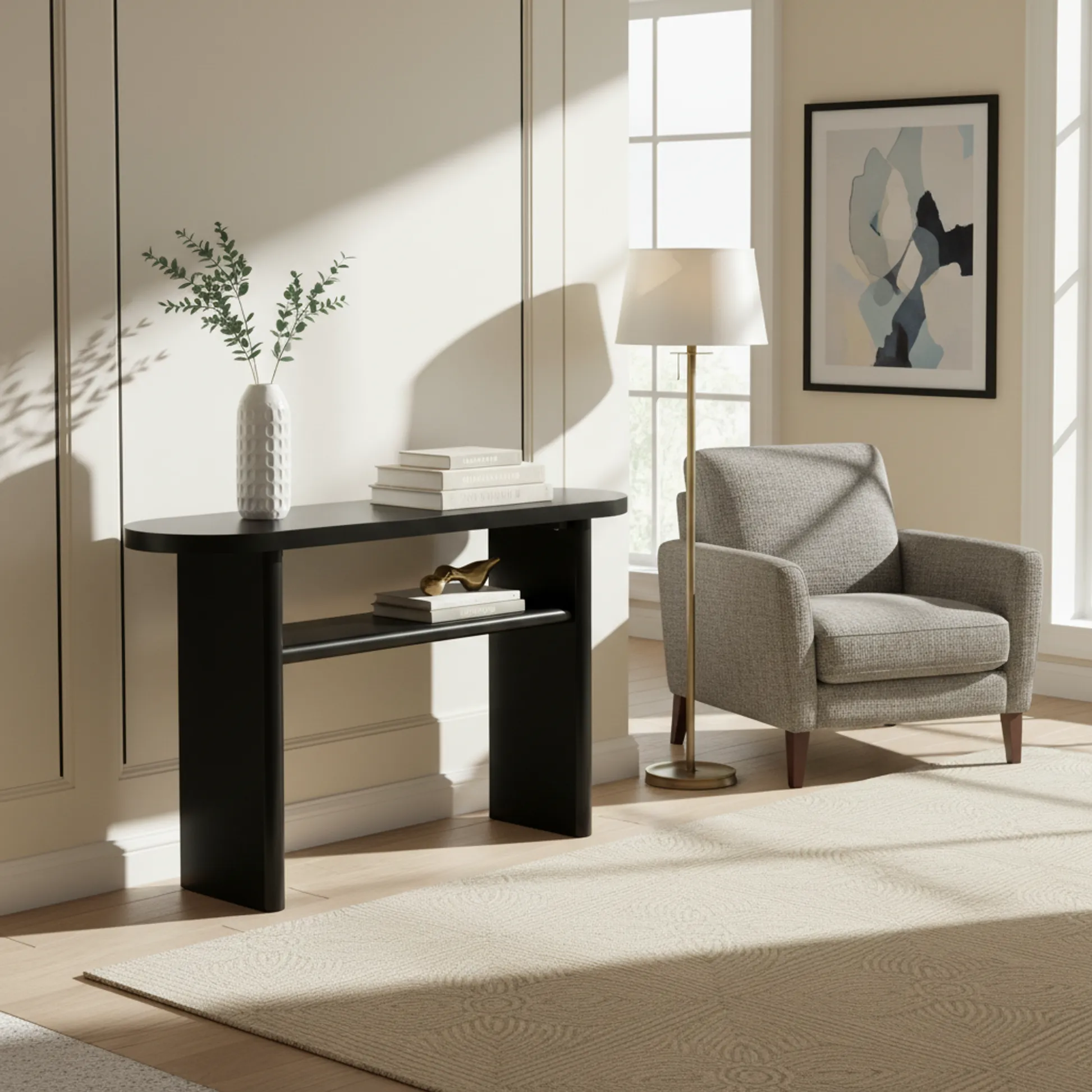 The Broadway Console Table features a sleek black finish, rounded edges, and a sturdy storage shelf, blending minimalist elegance with practical function for entryways, living rooms, or dining spaces.