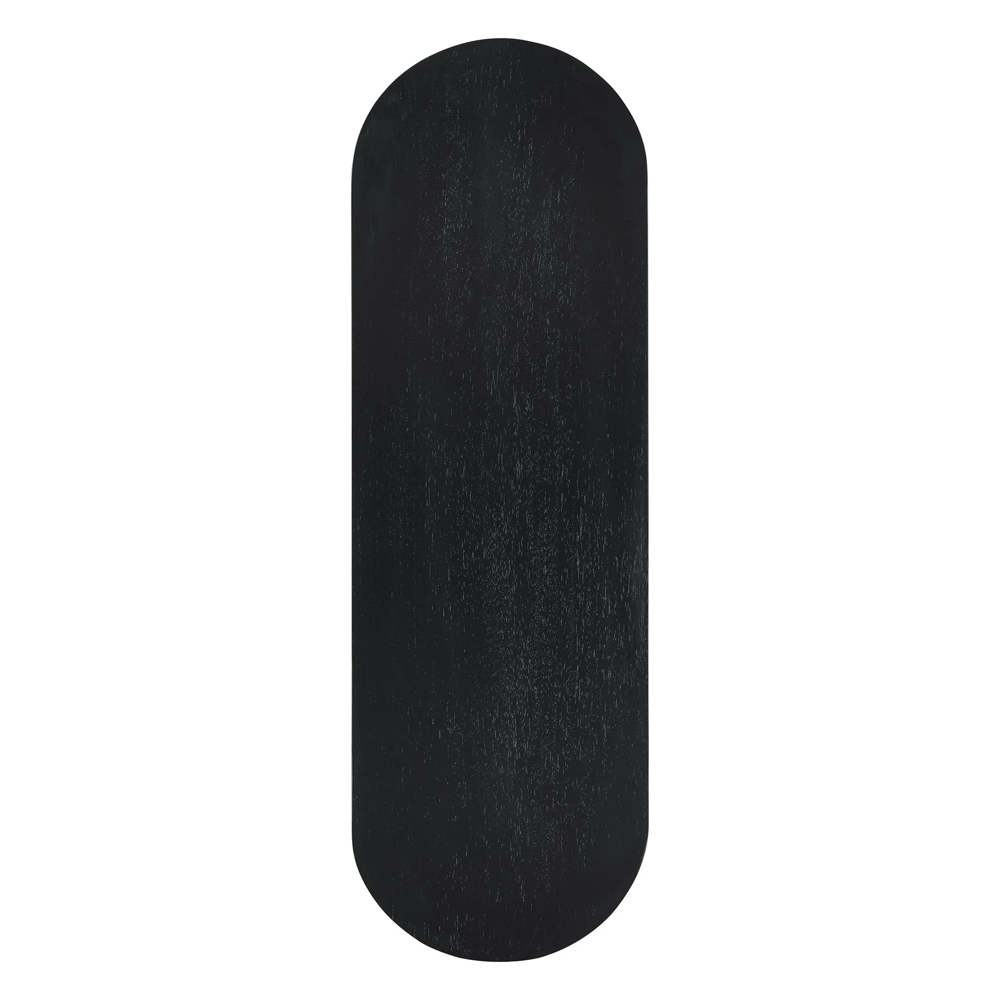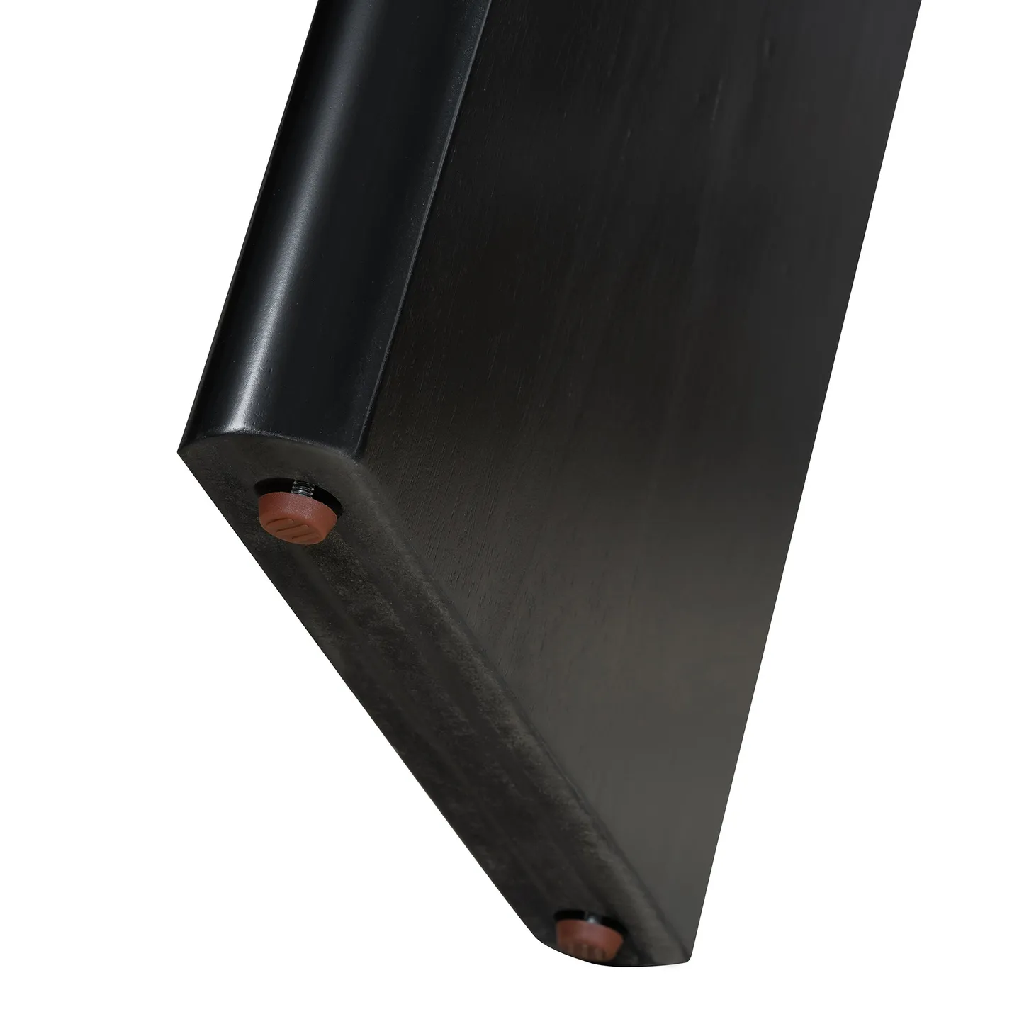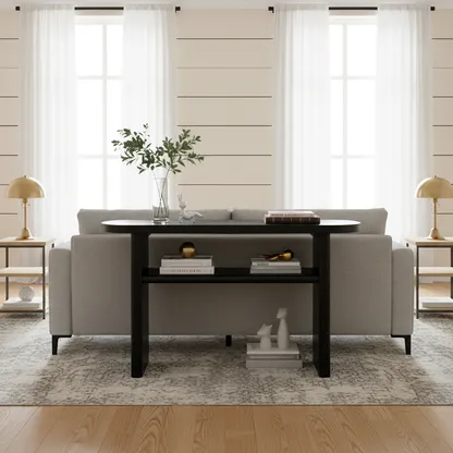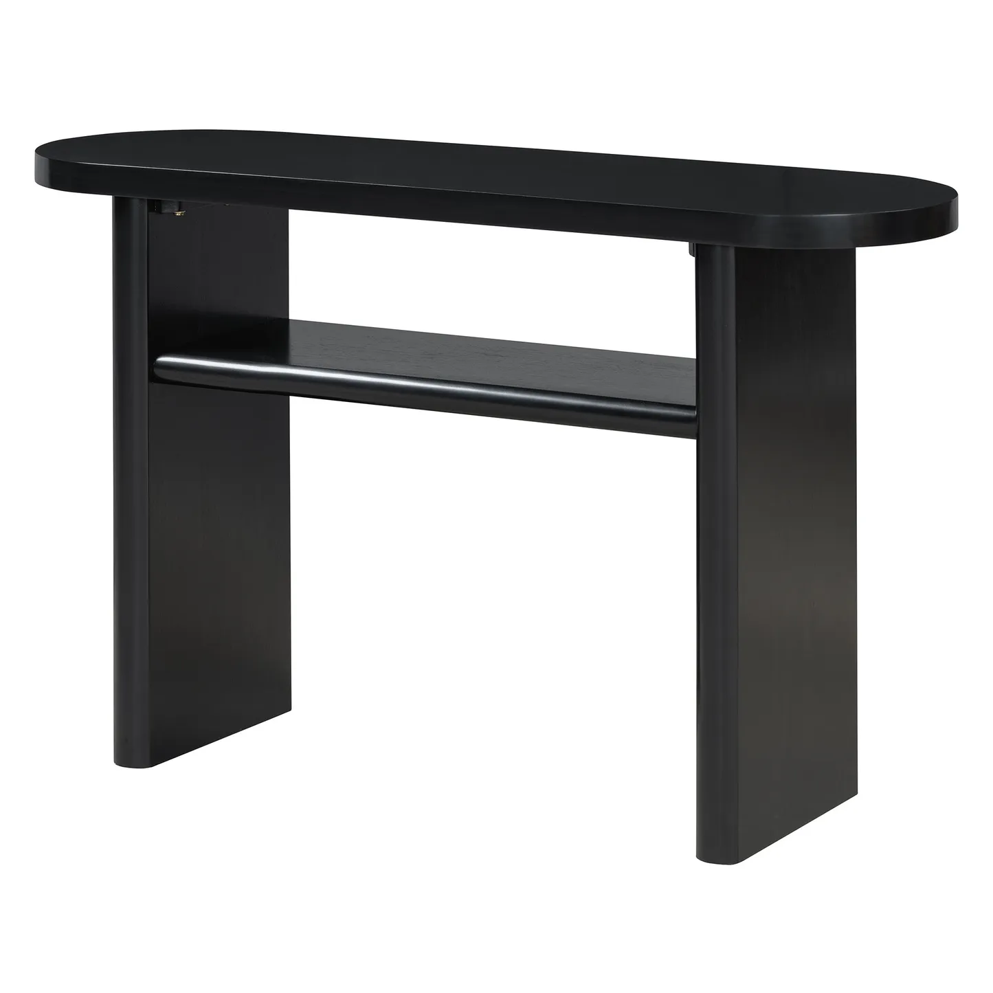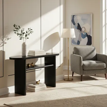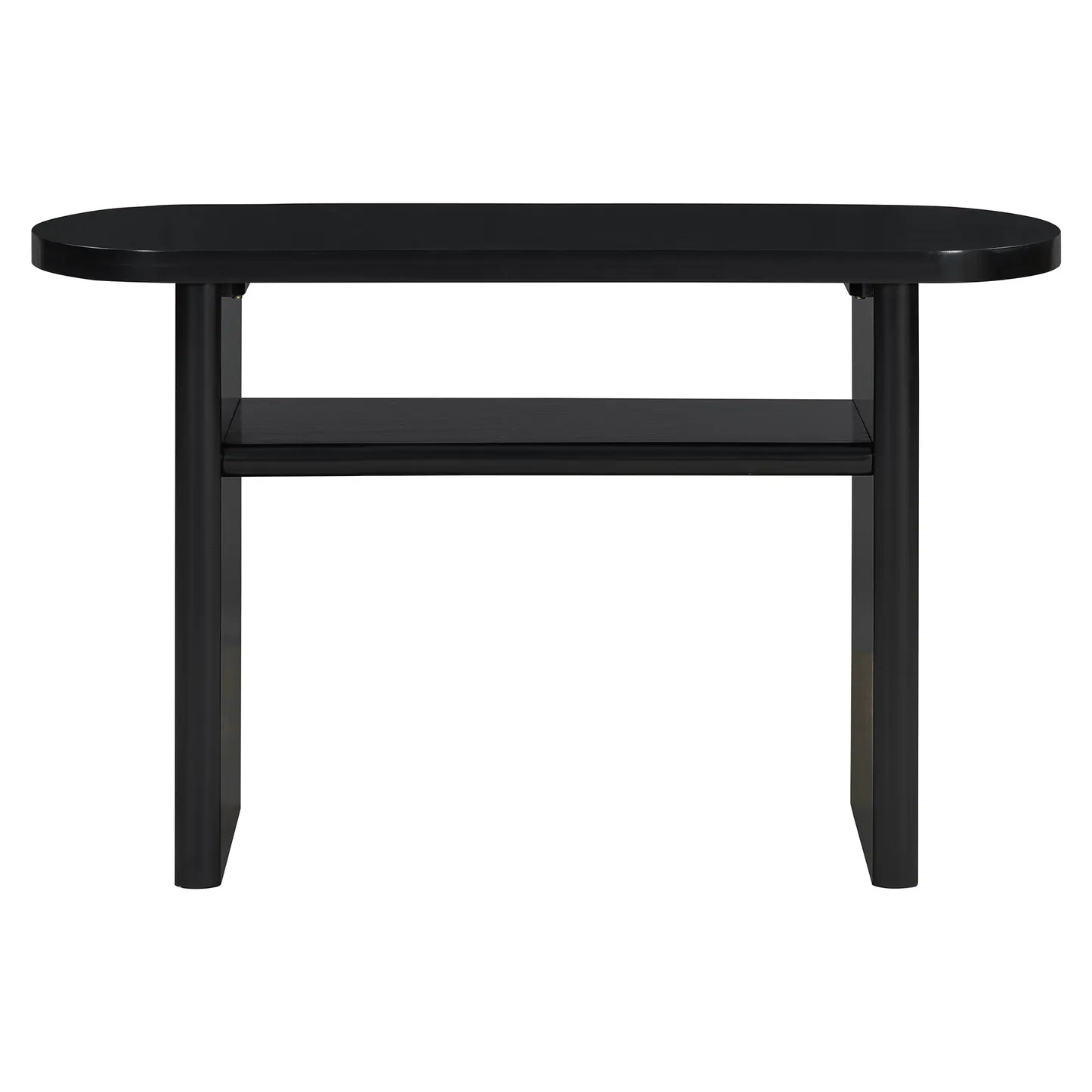 The Broadway Console Table features a sleek black finish, rounded edges, and a sturdy storage shelf, blending minimalist elegance with practical function for entryways, living rooms, or dining spaces.