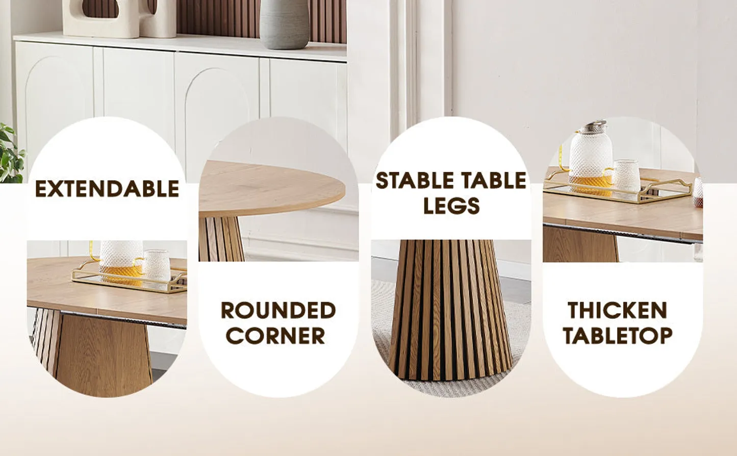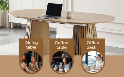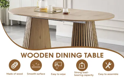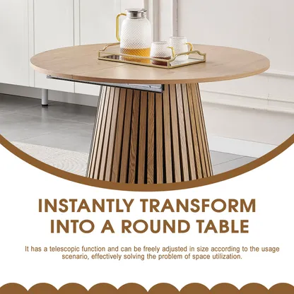 It has a telescopic function and can be freely adjusted in size according to the usage scenario, effectively solving the problem of space utilization. When the number of family diners is small, the retractable does not take up much space. When there are guests visiting or a larger working or dining area is needed, it can be flexibly and easily extended to meet diverse usage requirements.The overall shape is simple and fashionable. The oval desktop design has smooth lines, avoiding sharp table corners, which is both beautiful and safe. The unique shape of the table legs, decorated with vertical stripes, adds an artistic and design touch to the home environment and can be well integrated into various modern and simple home decoration styles.Made of high-quality MDF and wood, it features excellent load-bearing capacity and durability. Meanwhile, the wood grain is naturally beautiful, giving people a warm feeling.Whether used as a dining table, coffee table or office desk, it can provide relatively spacious and flexible operation and placement space, meeting the needs of various daily usage scenarios.It measures 39.37 inches to 70.87 inches in length, 39.37 inches in width and 29.53 inches in height.