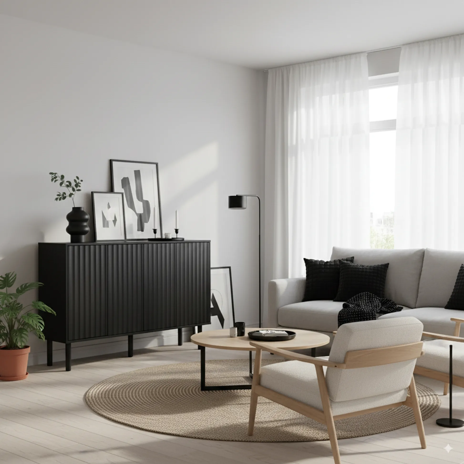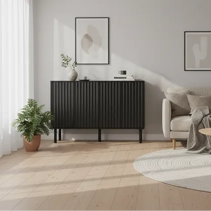 The Aspen Sideboard Buffet Cabinet features a minimalist fluted door design, five solid wood legs, and adjustable shelves, offering versatile storage and modern style for entryways, living rooms, or kitchens.